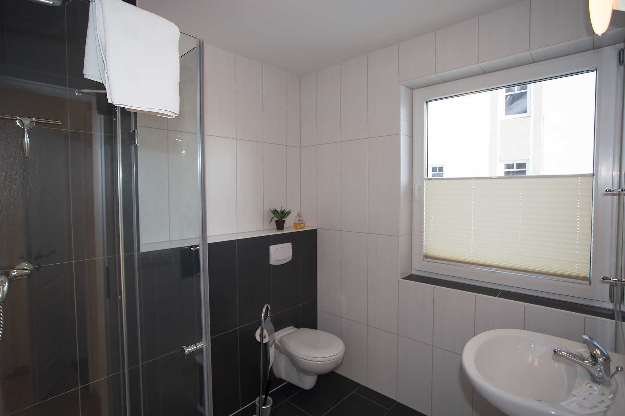 Das Bad verfügt über ein Fenster. Es ist mit einer ebenerdigen Glasdusche, WC, Waschbecken und einem großen Spiegel ausgestattet. Die Wohnung verfügt über ein weiteres WC mit Waschbecken. Im Flur befindet sich eine Garderobe mit Spiegel.