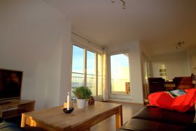 Der Wohnraum ist modern eingerichtet und verfügt über einen großen Flachbild-TV, einem Lowboard, einem Highboard und einer stilvollen ausziehbaren Eckcouch sowie einem großen massiven Esstisch mit passenden Stühlen. Vom Wohnraum ist der Zugang zum großen Balkon gegeben. Die Ferienwohnung verfügt über zwei separate Schlafzimmer mit jeweils einem Doppelbett (2,00 x 1,80m, einzelnen 21cm dicken Komfort-Kaltschaum-Matratzen sowie sehr guten Lattenrosten) und jeweils einen großen Kleiderschrank.
