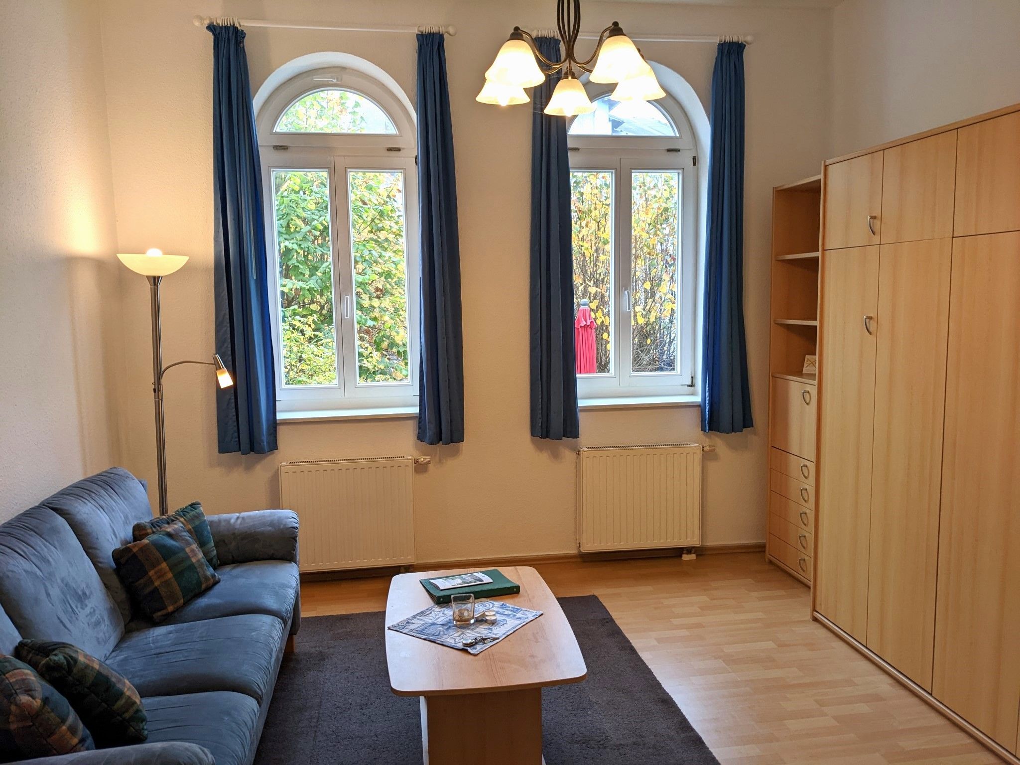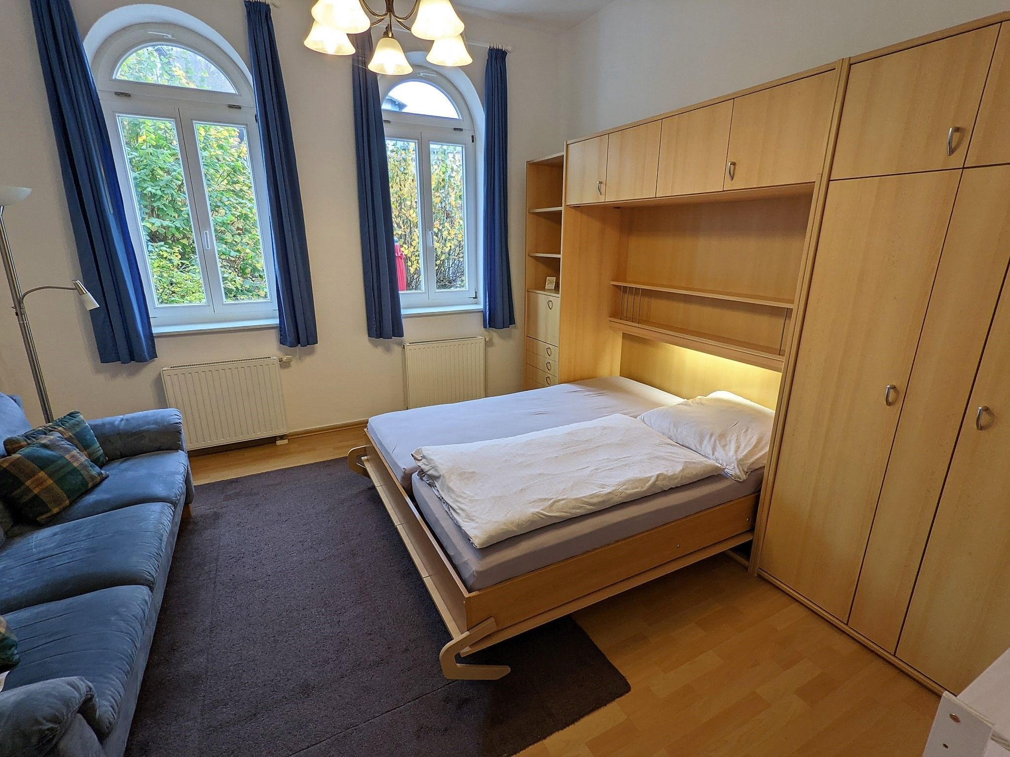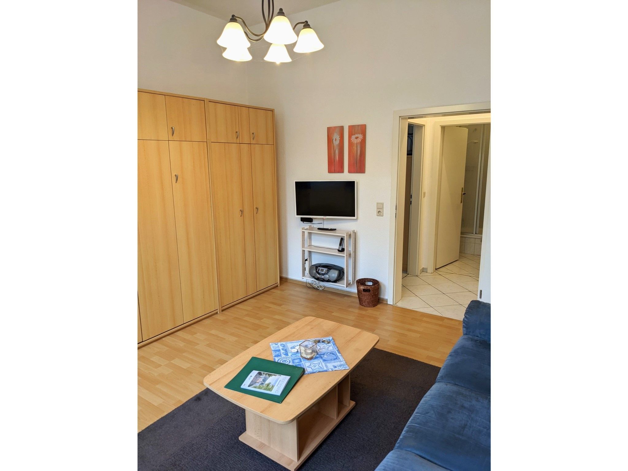 • kombiniertes Wohn-/Schlafzimmer mit Schrankbett, Couch sowie Flachbild-TV