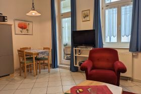 Das Haus „Eintracht befindet sich an der denkmalgeschützten Wilhelmstraße, der Promenadenstraße Sellins, etwa 150 m von der Seebrücke und dem Strand entfernt, inmitten von Cafés, Restaurants und Bistros. Es ist ein traditionelles Haus in der typischen Bäderarchitektur und wurde komplett renoviert. 12 komfortable, moderne Ferienwohnungen für bis zu 6 Personen befinden sich hier, von denen einige über Balkons zur Sonnenseite verfügen, andere über geschlossene Veranden. Die Küchen sind reichhaltig ausgestattet und verfügen alle über einen Backofen und teilweise über einen Geschirrspüler.