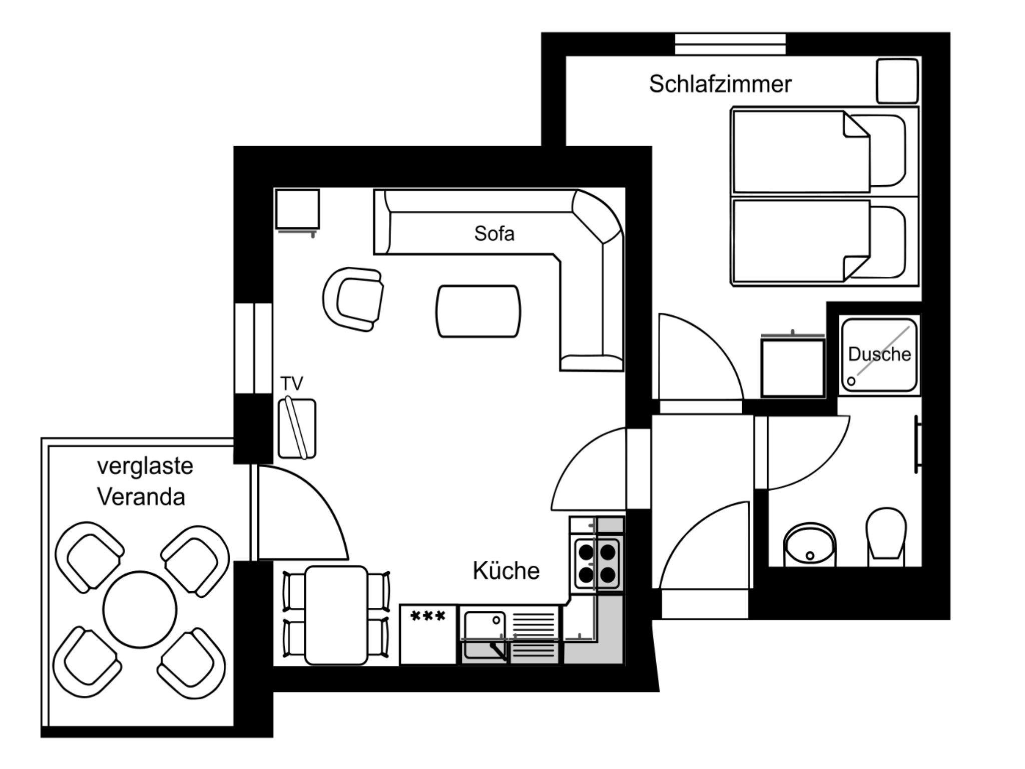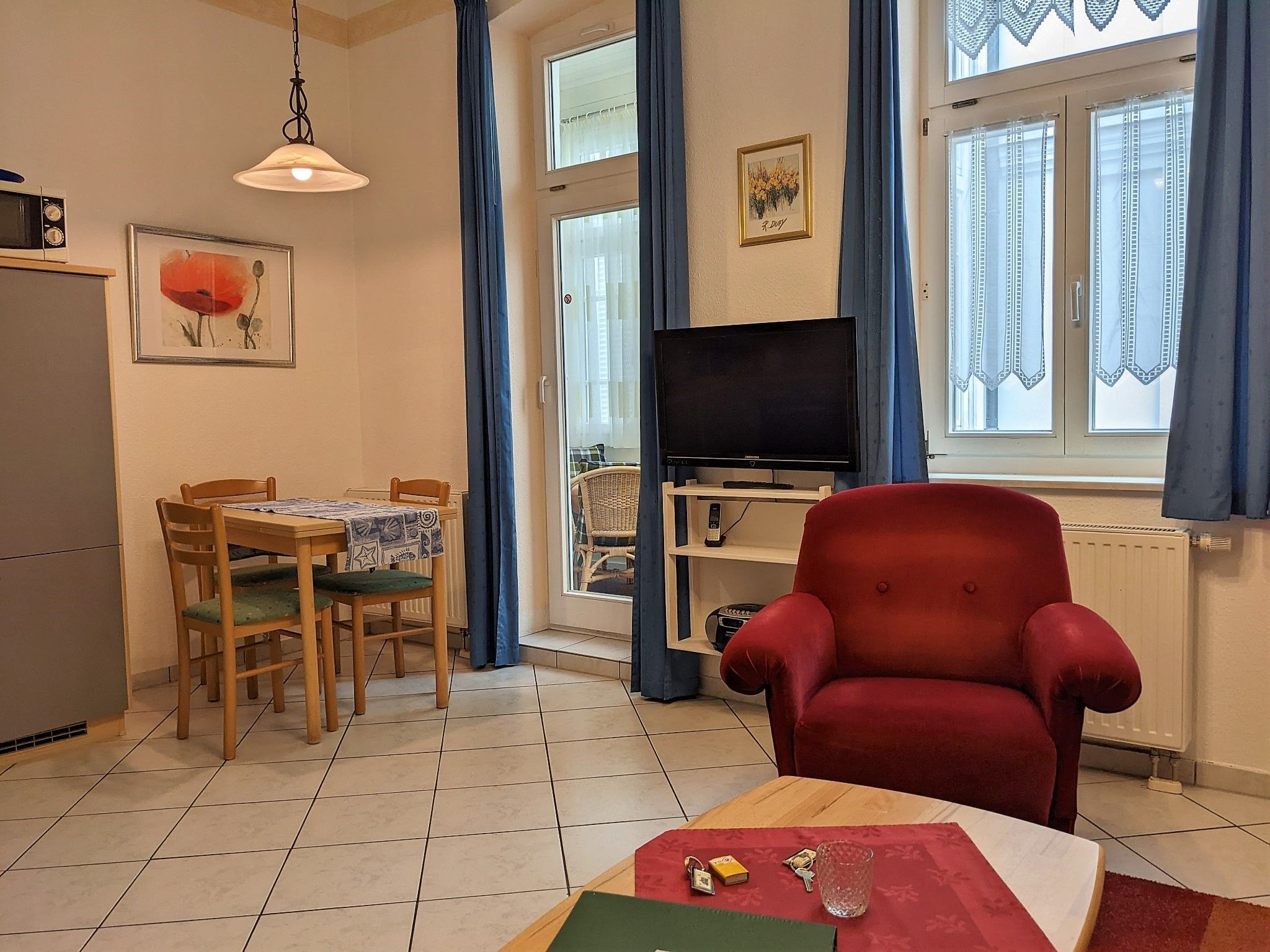 • offene Küche mit Essecke, E-Herd, Backofen, Kühlschrank, Mikrowelle uvm.