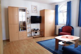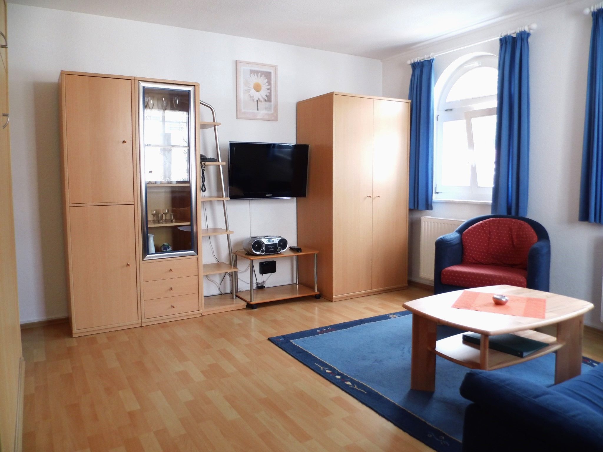 • kombiniertes Wohn-/Schlafzimmer mit Schrankbett, Couch sowie Flachbild-TV