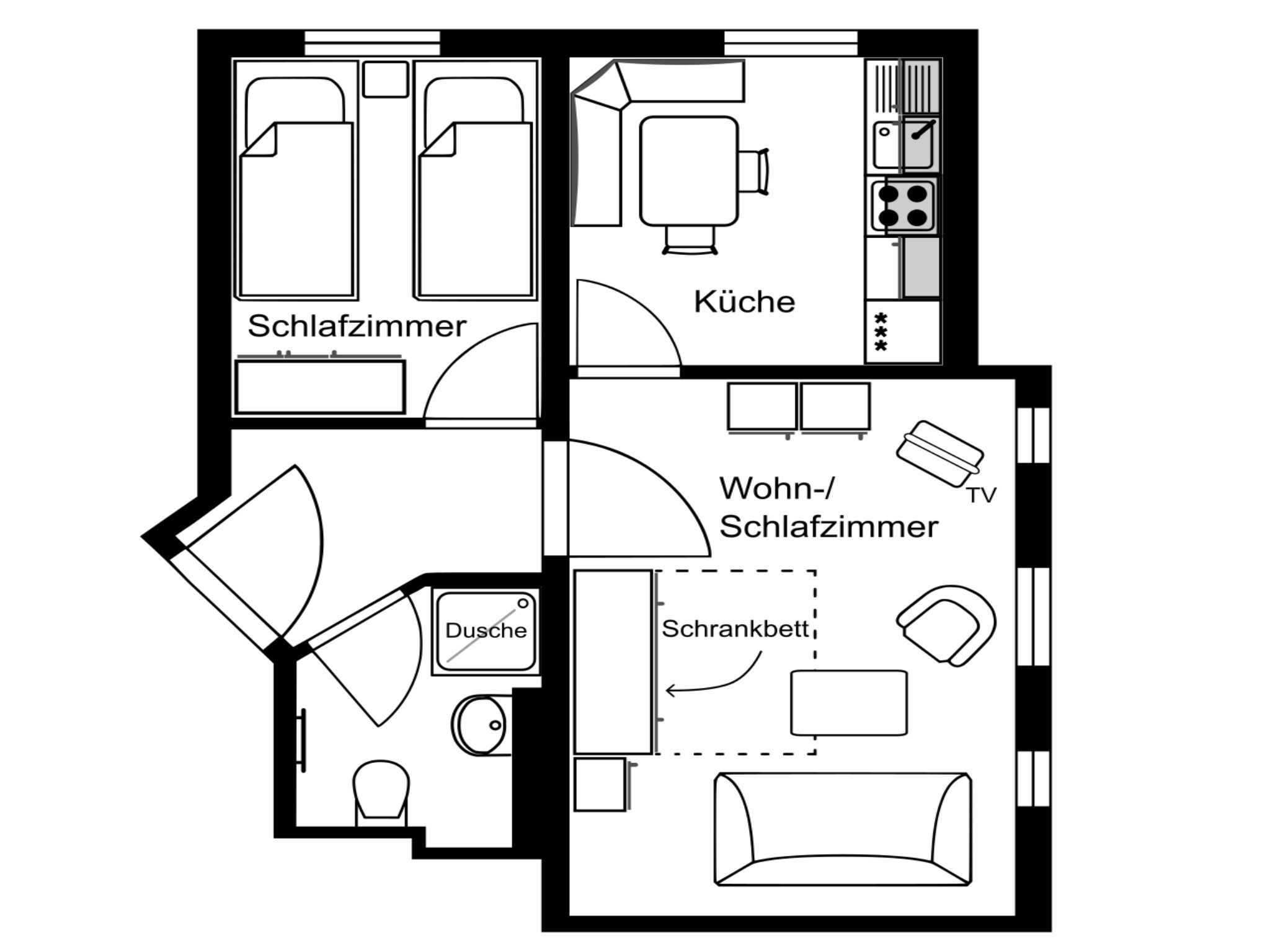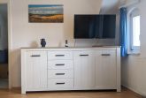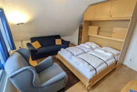 • Wohnzimmer mit Schrankbett, Couch sowie Flachbild-TV
