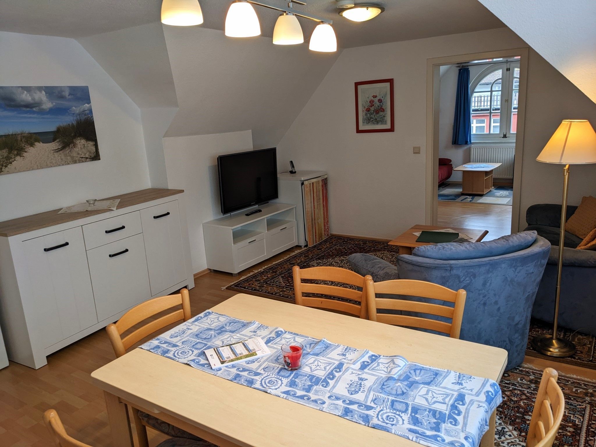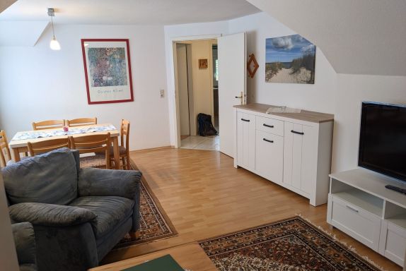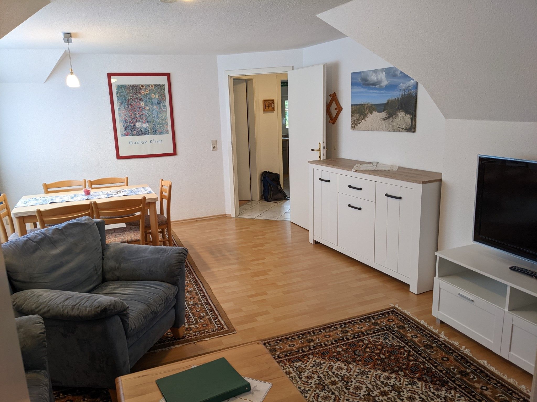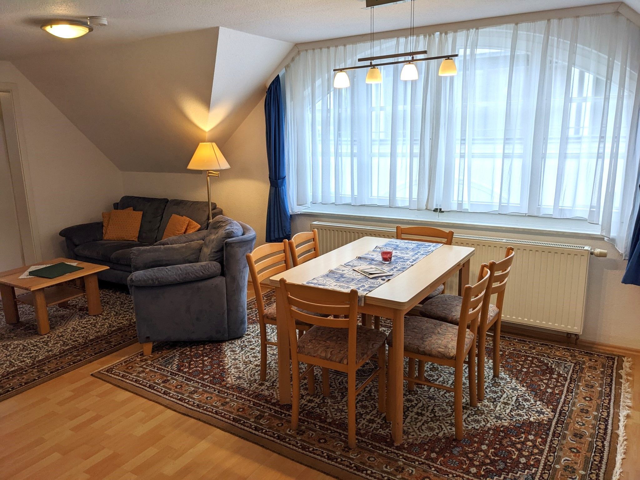 • Wohnzimmer mit Schlafcouch, Essecke sowie Flachbild-TV