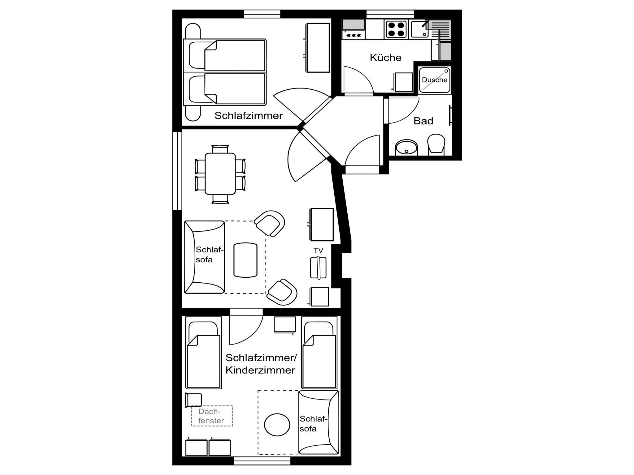 • separates Kinderzimmer mit drei Einzelbetten (90x200 cm)