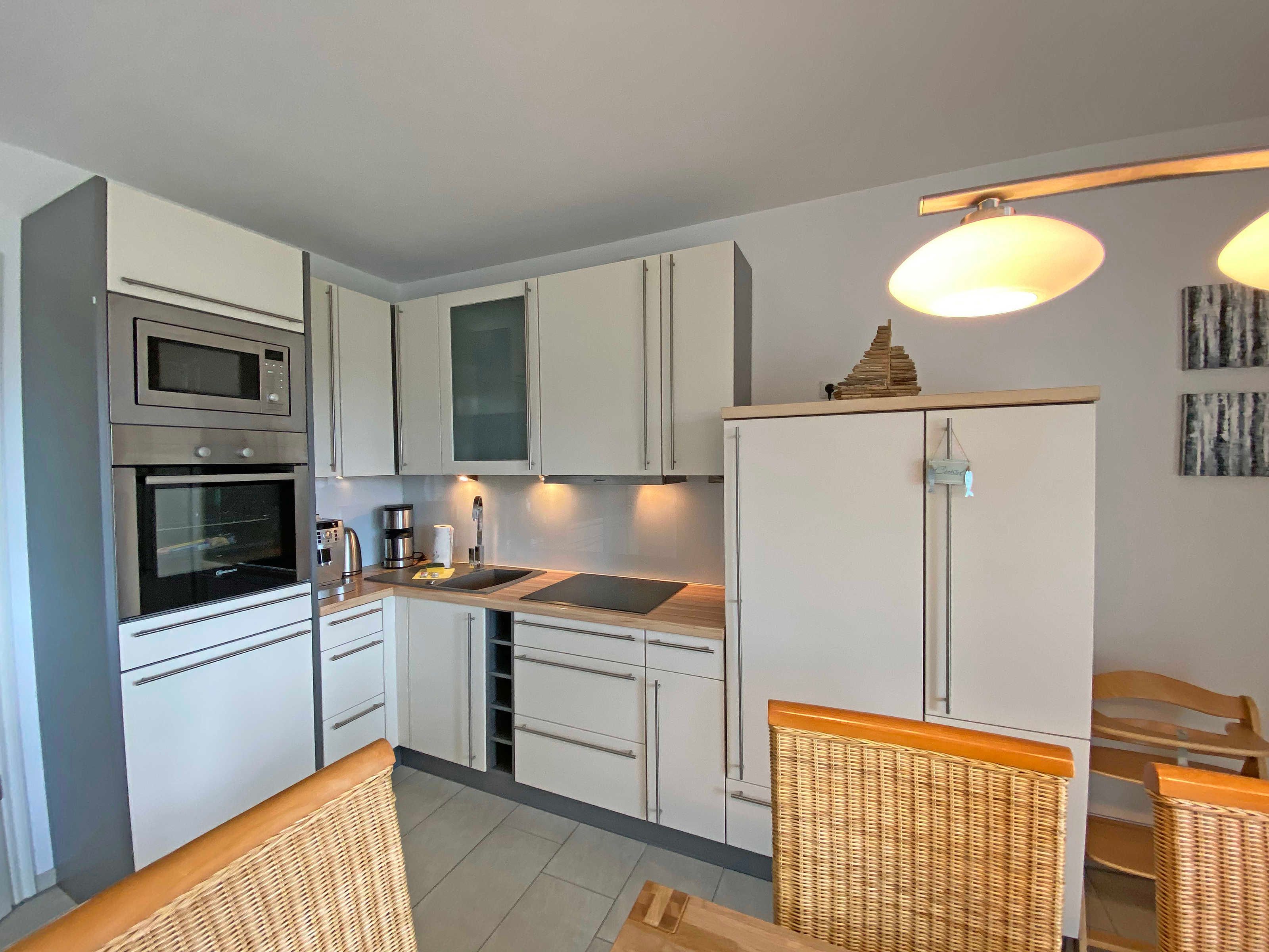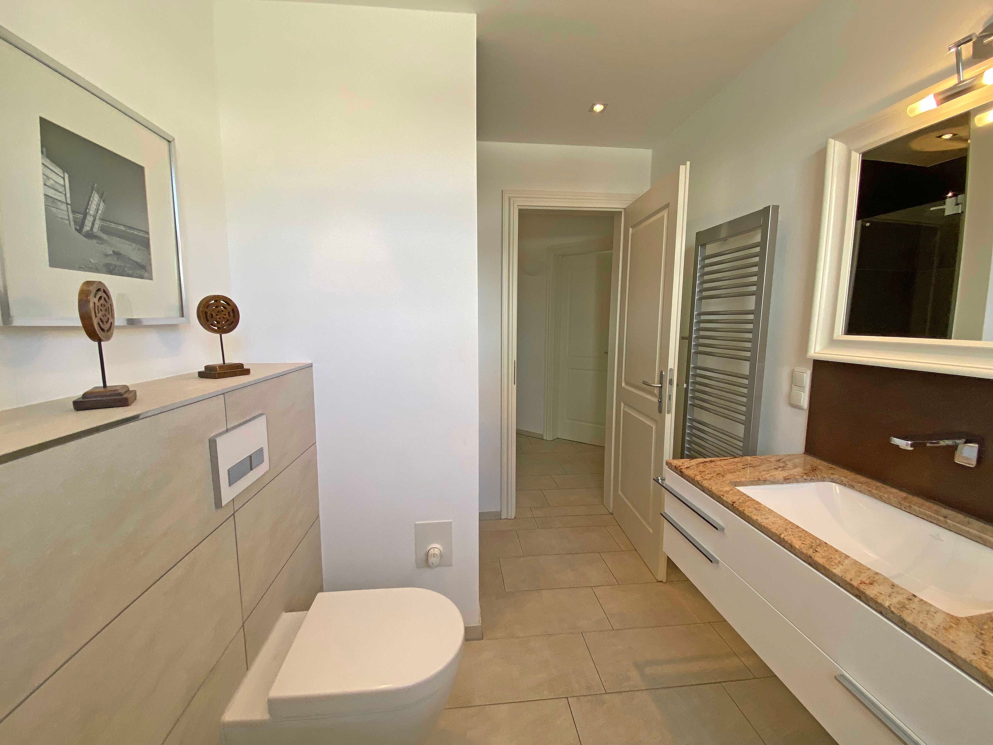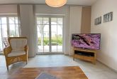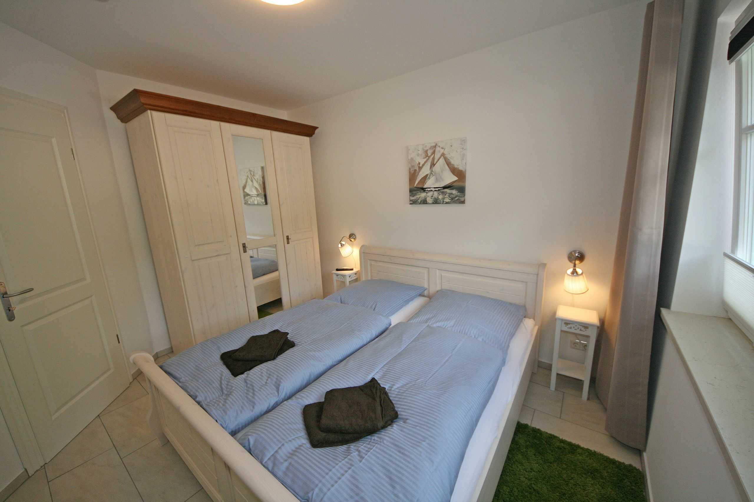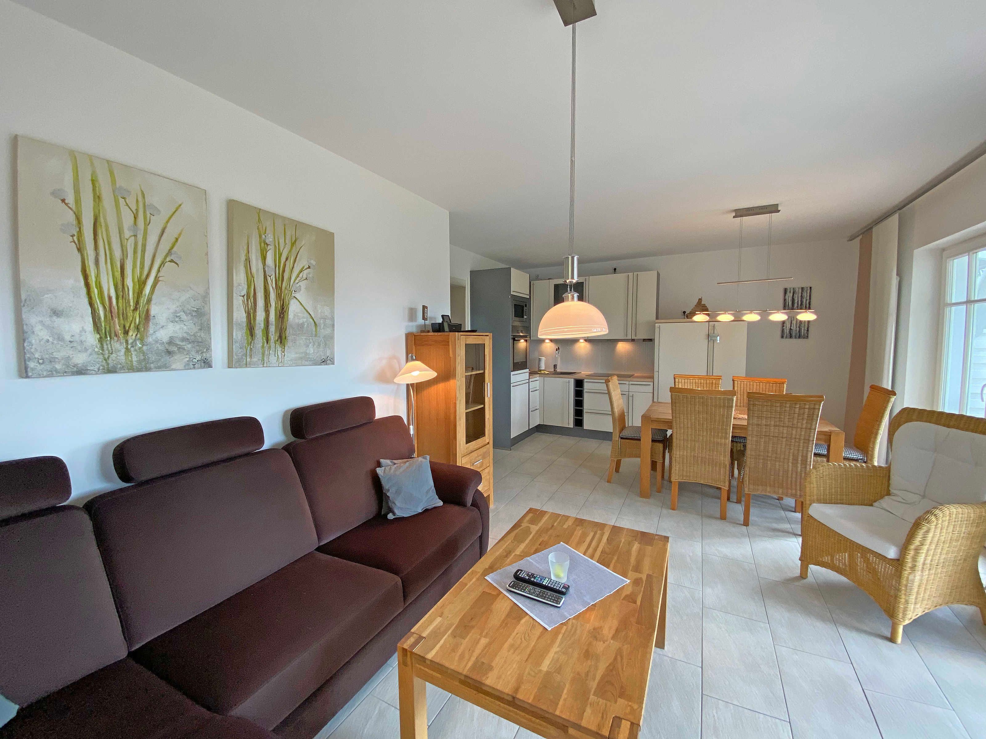 Die modern und sehr hochwertig eingerichtete Nichtraucherwohnung mit eigener Terrasse befindet sich im Erdgeschoss und ist daher sehr für Familien und ältere Gäste geeignet. Die hochwertig integrierte Küchenzeile lässt mit Mikrowelle, Umluftherd, Ceranfeld, Spülmaschine, Kühlschrank mit Gefrierfach, Kaffeeautomat + zusätzlicher Kaffeemaschine und anderen praktischen Helfern keine Wünsche offen. Weiterhin finden Sie im Wohnbereich eine gemütliche Sitzecke, die mit einem LED-TV (40 Zoll), DVD-Player und Musikanlage ausgestattet ist. Ein weiteres LED-TV (32 Zoll) finden Sie in einem der Schlafzimmer. Die beiden Schlafzimmer sind mit bequemen Betten (Schlafzimmer 1 - 1,80m x 2,00 m), 2 Einzelbetten (Schlafzimmer 2 - 0,90m x 2,00m) und reichlich Schrankflächen ausgestattet. Auch auf Ihren Internetanschluss (WLAN) müssen Sie im Urlaub nicht verzichten. Dieser ist für Sie inklusive. Vom Wohn/Koch- und Essbereich gelangen Sie auf die Südterrasse, die bei Sonnenschein zum Verweilen einlädt. Das großzügige und hochwertige Bad mit Fußbodenheizung, WC, Waschmaschine, Haarfön, Waschbecken und Raindancedusche verspricht den erholsamen Wellness-Effekt. Ein Wäschetrockner zum Aufstellen für den Außenbereich ist vorhanden. Ihre Fahrräder und Strandutensilien lassen sich in einem abschließbaren Schuppen neben Ihrem Parkplatz Nr. 02 unterbringen. Für unsere kleinen Gäste steht Ihnen 1x Kinderreisebett (ohne Matratze und Bett Inlett) sowie 1x Hochstuhl in der Wohnung zur Verfügung. Haustiere sind nicht erlaubt. Die Erstausstattung eines Wäschepaketes (komplette Bettwäsche, 1 Duschhandtuch, 1 kleines Handtuch) können Sie bis 14 Tage vor Anreise gegen einen Aufpreis dazu buchen oder durch eigene ergänzen. Ab 2 gebuchten Paketen erhalten Sie einmalig 1 Geschirrhandtuch und 1 Duschvorleger hinzu.