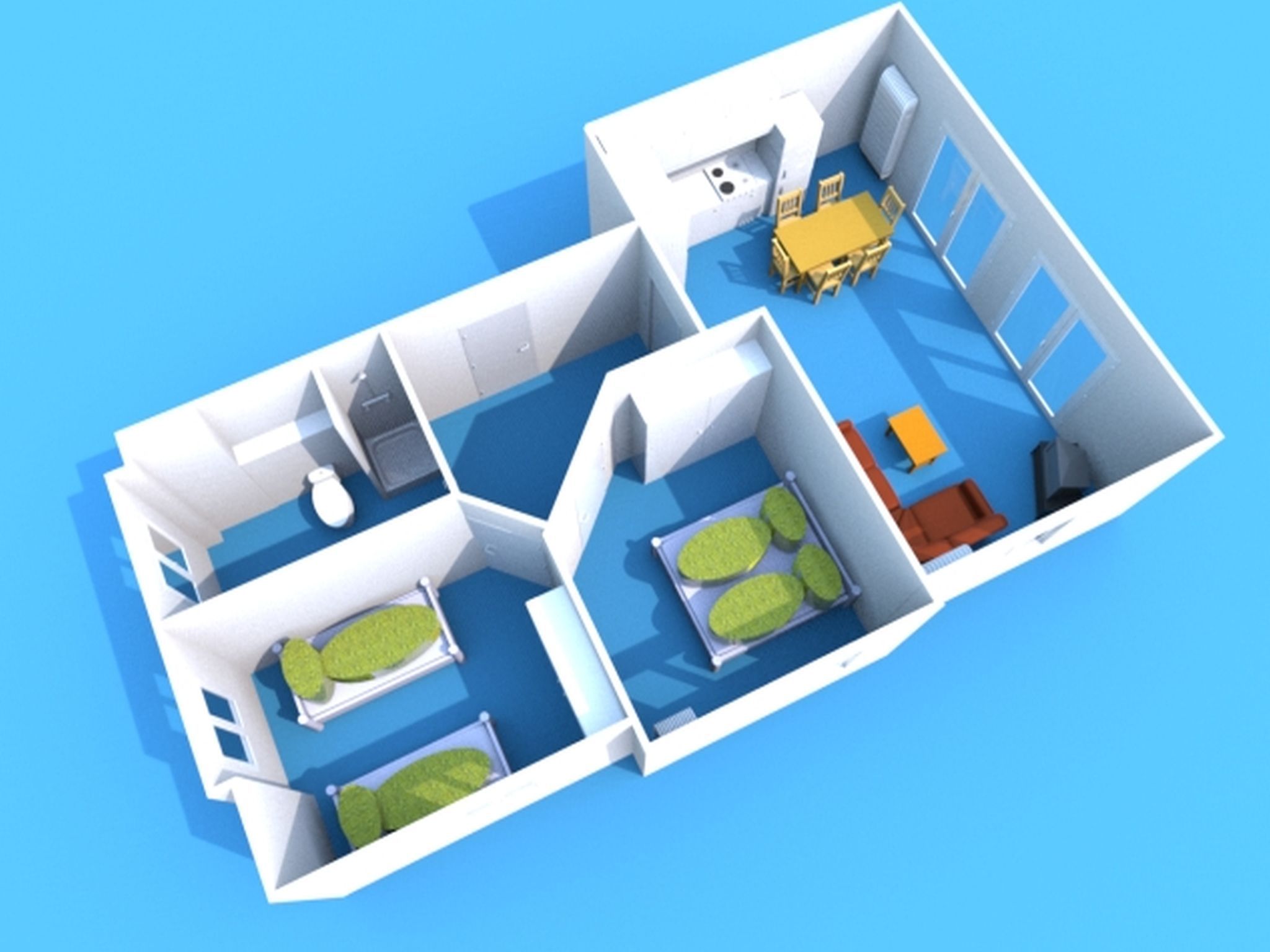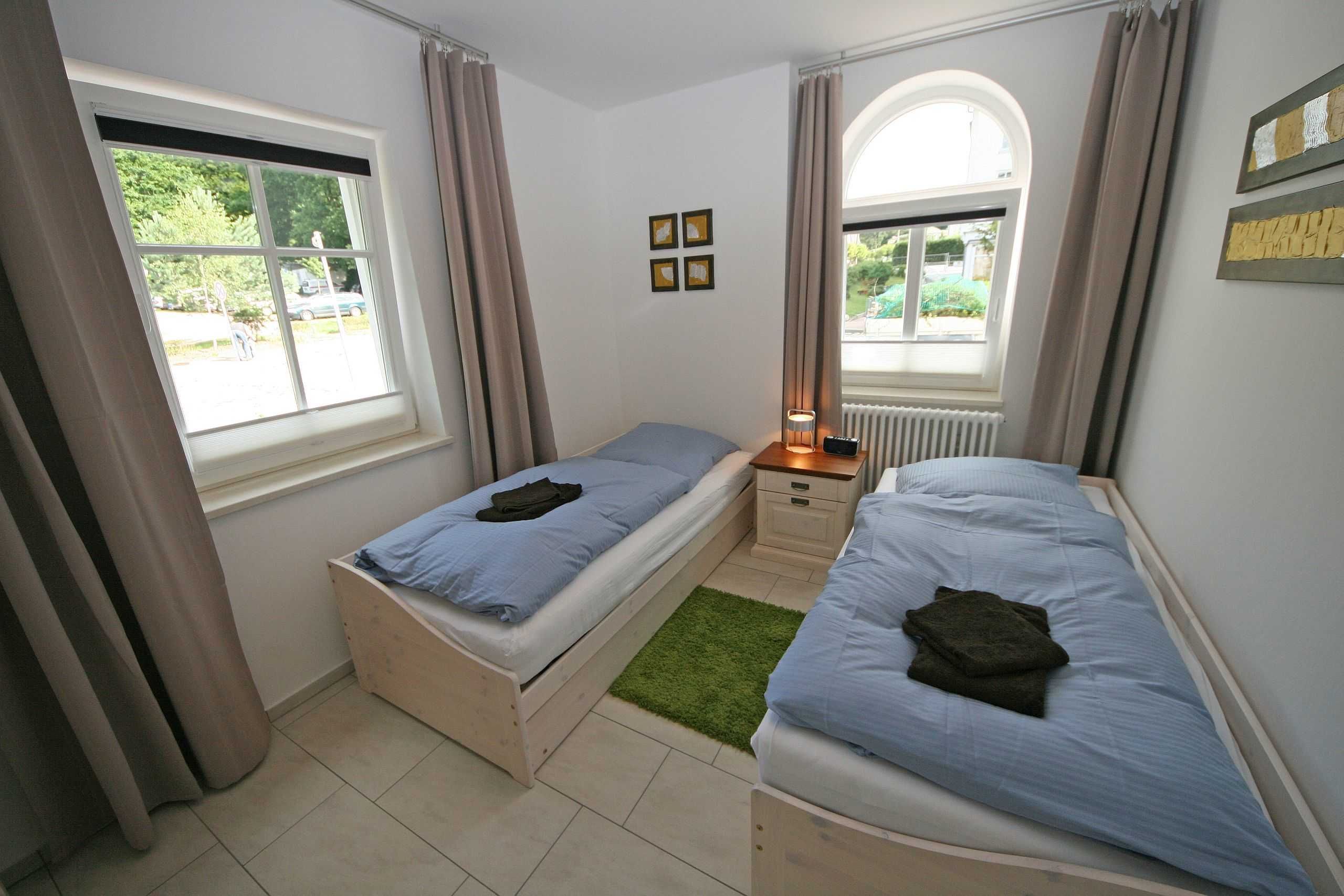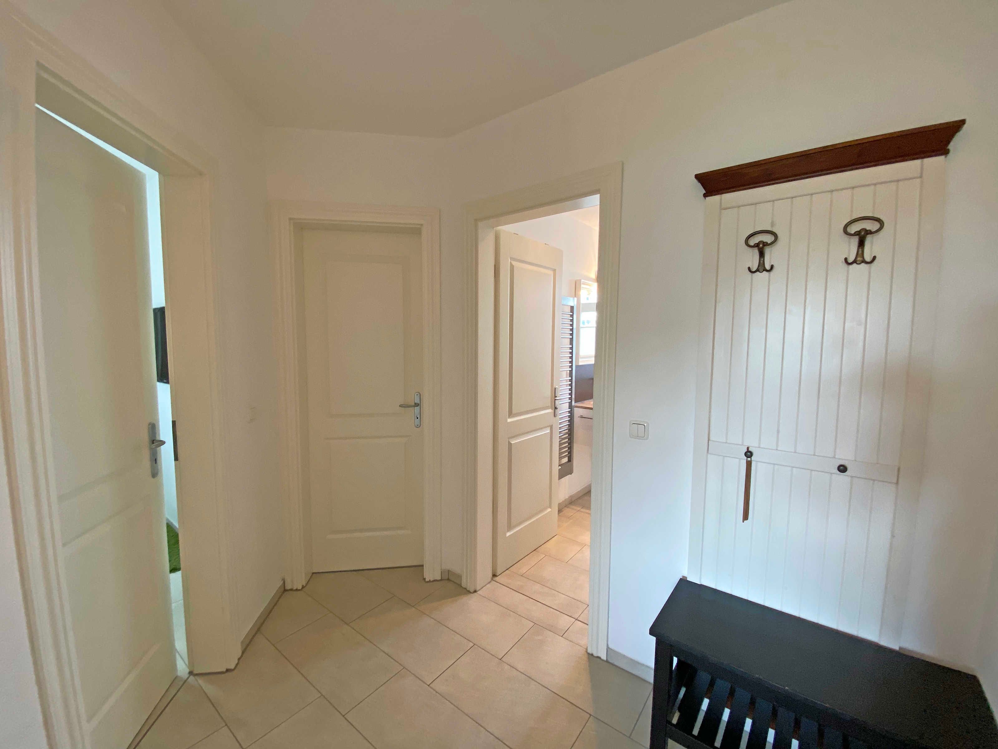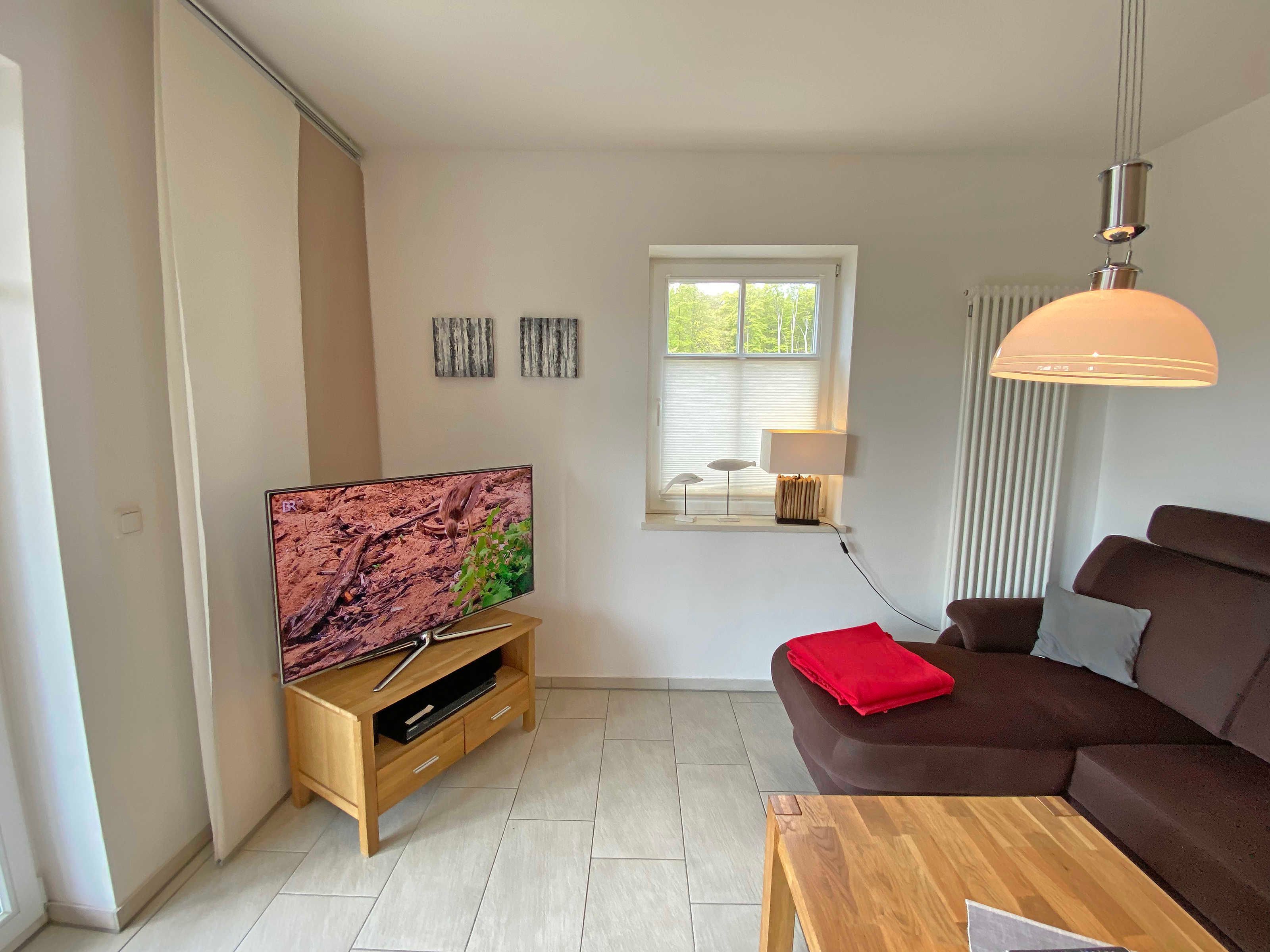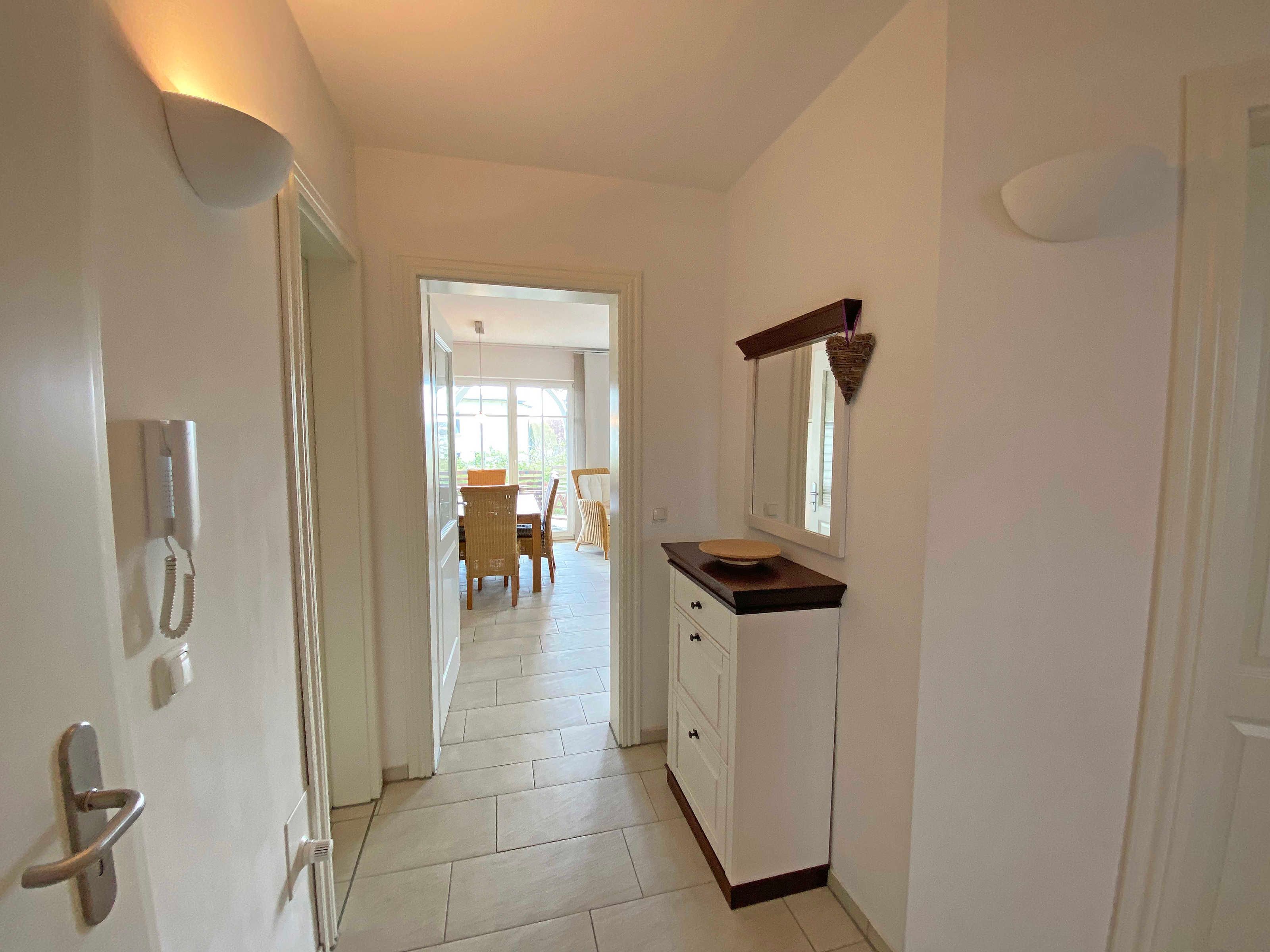 Die modern und sehr hochwertig eingerichtete Nichtraucherwohnung mit eigener Terrasse befindet sich im Erdgeschoss und ist daher sehr für Familien und ältere Gäste geeignet. Die hochwertig integrierte Küchenzeile lässt mit Mikrowelle, Umluftherd, Ceranfeld, Spülmaschine, Kühlschrank mit Gefrierfach, Kaffeeautomat + zusätzlicher Kaffeemaschine und anderen praktischen Helfern keine Wünsche offen. Weiterhin finden Sie im Wohnbereich eine gemütliche Sitzecke, die mit einem LED-TV (40 Zoll), DVD-Player und Musikanlage ausgestattet ist. Ein weiteres LED-TV (32 Zoll) finden Sie in einem der Schlafzimmer. Die beiden Schlafzimmer sind mit bequemen Betten (Schlafzimmer 1 - 1,80m x 2,00 m), 2 Einzelbetten (Schlafzimmer 2 - 0,90m x 2,00m) und reichlich Schrankflächen ausgestattet. Auch auf Ihren Internetanschluss (WLAN) müssen Sie im Urlaub nicht verzichten. Dieser ist für Sie inklusive. Vom Wohn/Koch- und Essbereich gelangen Sie auf die Südterrasse, die bei Sonnenschein zum Verweilen einlädt. Das großzügige und hochwertige Bad mit Fußbodenheizung, WC, Waschmaschine, Haarfön, Waschbecken und Raindancedusche verspricht den erholsamen Wellness-Effekt. Ein Wäschetrockner zum Aufstellen für den Außenbereich ist vorhanden. Ihre Fahrräder und Strandutensilien lassen sich in einem abschließbaren Schuppen neben Ihrem Parkplatz Nr. 02 unterbringen. Für unsere kleinen Gäste steht Ihnen 1x Kinderreisebett (ohne Matratze und Bett Inlett) sowie 1x Hochstuhl in der Wohnung zur Verfügung. Haustiere sind nicht erlaubt. Die Erstausstattung eines Wäschepaketes (komplette Bettwäsche, 1 Duschhandtuch, 1 kleines Handtuch) können Sie bis 14 Tage vor Anreise gegen einen Aufpreis dazu buchen oder durch eigene ergänzen. Ab 2 gebuchten Paketen erhalten Sie einmalig 1 Geschirrhandtuch und 1 Duschvorleger hinzu.