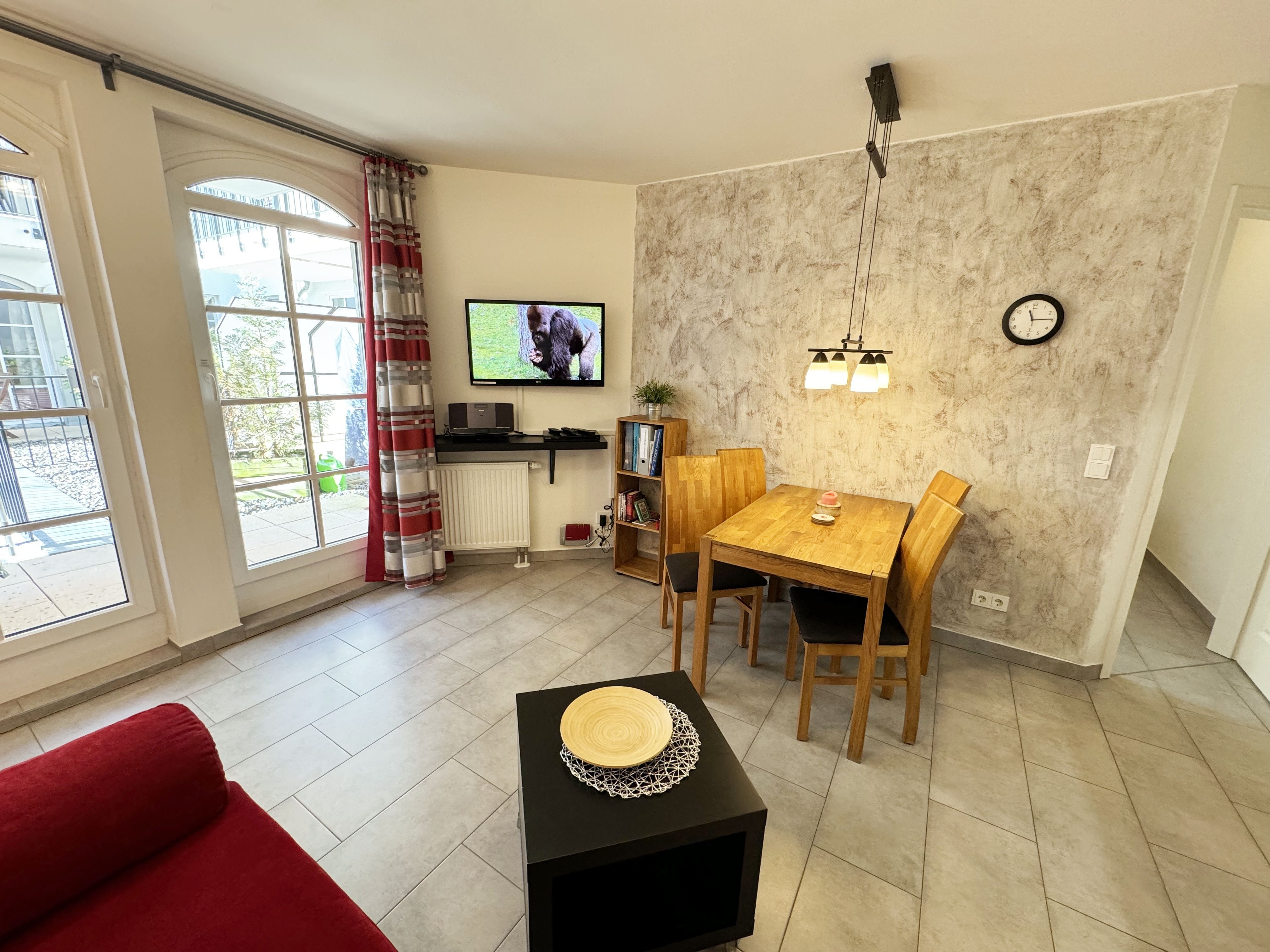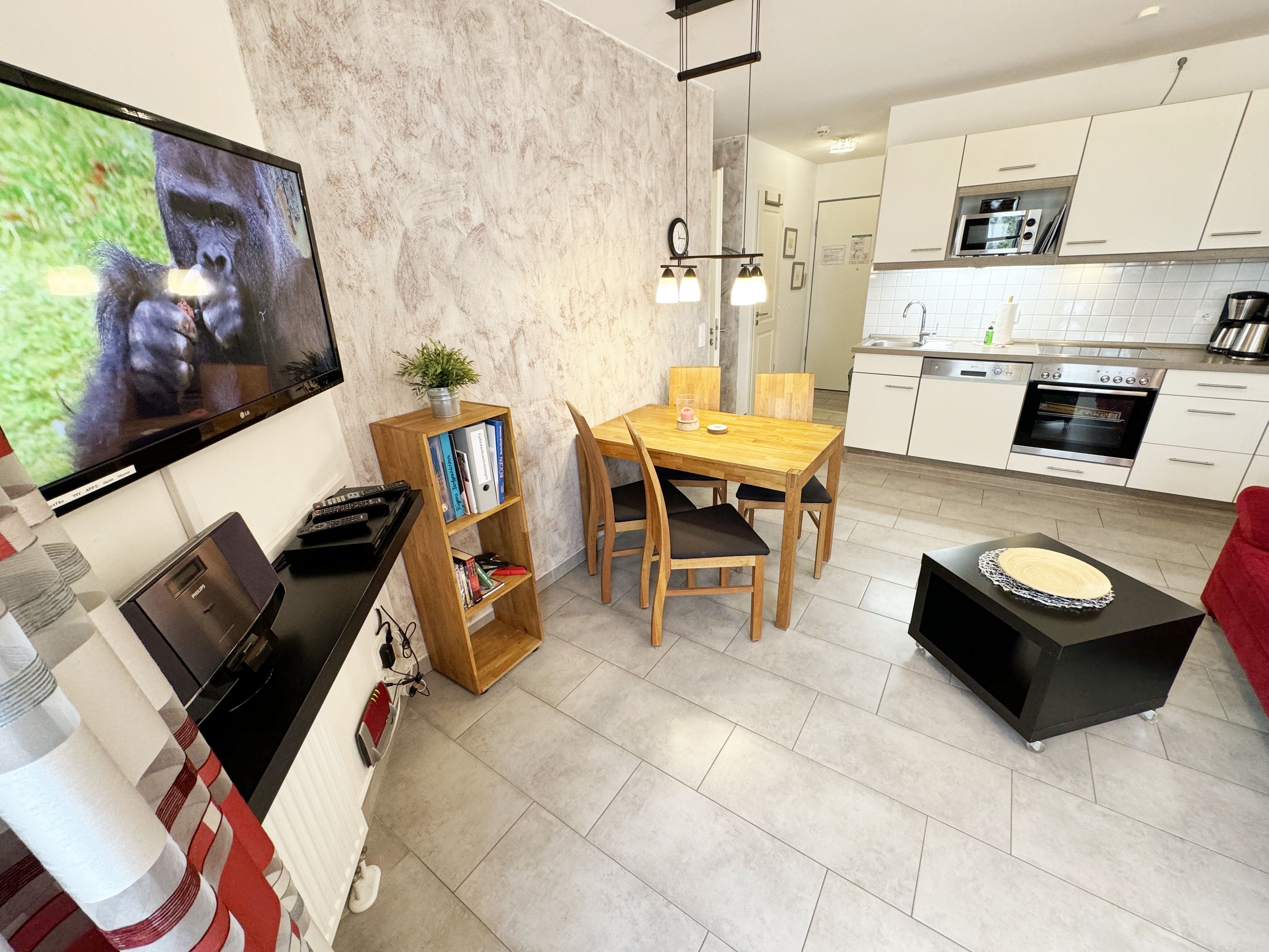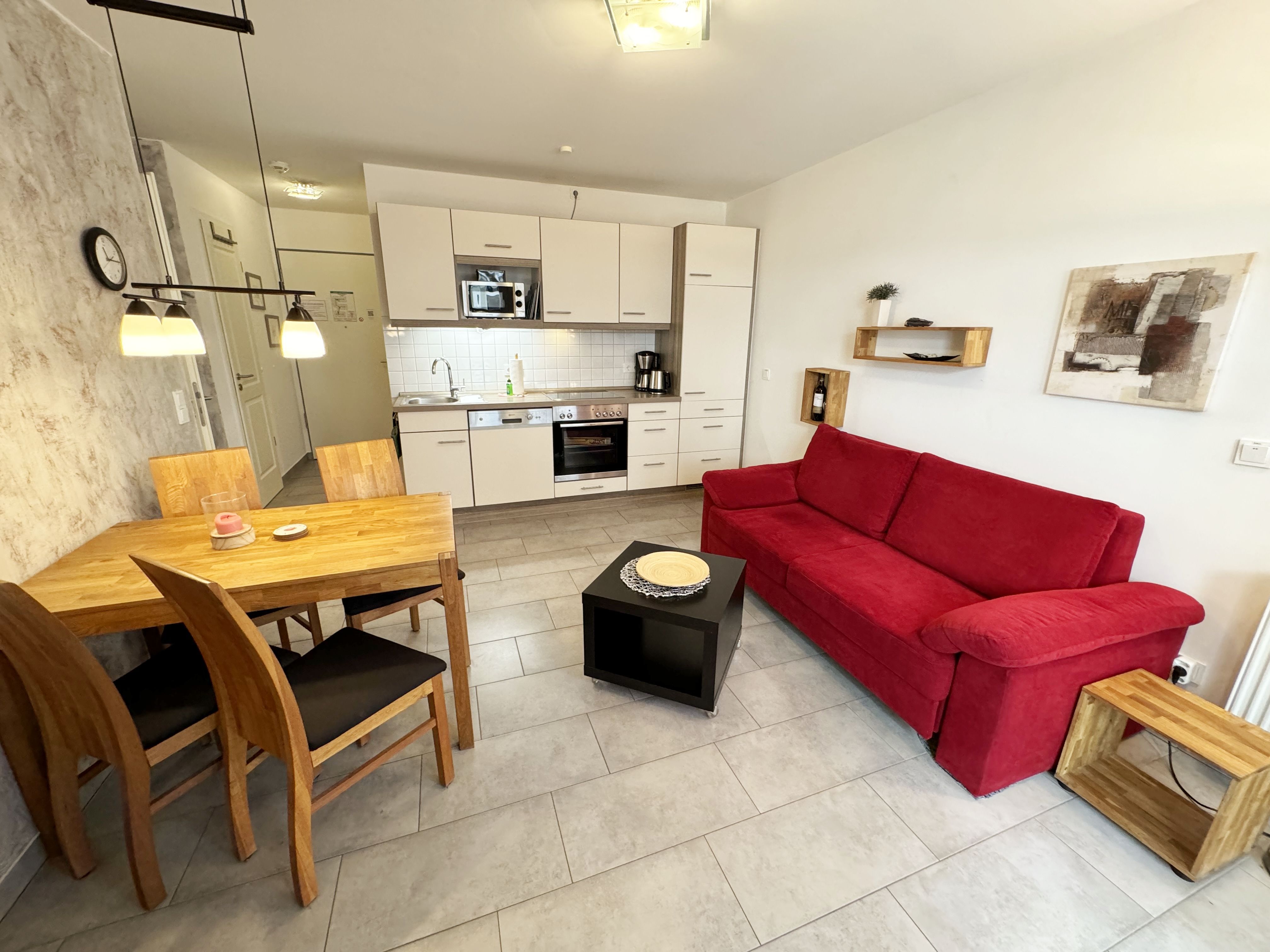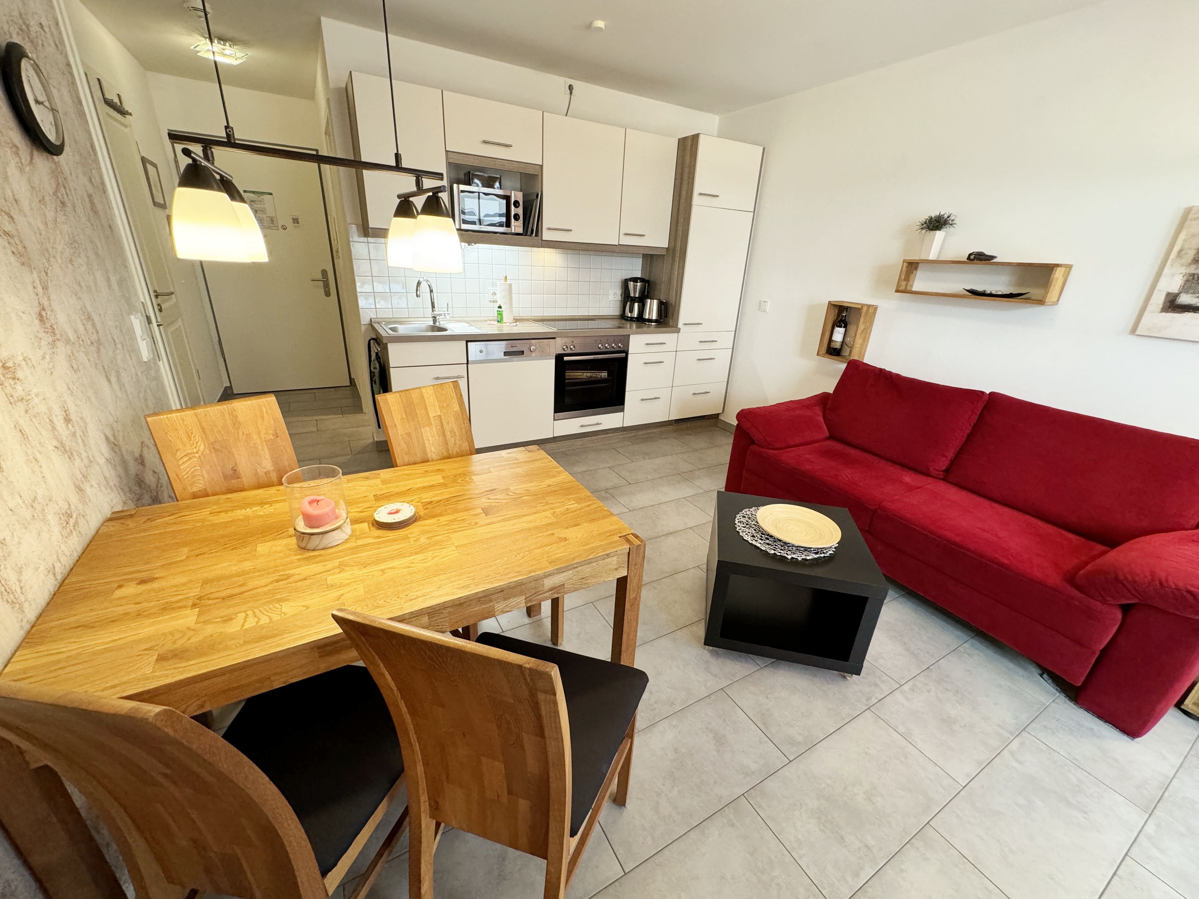 Ihre Nichtraucher/Ferienwohnung Nautica ist mit viel Liebe zum Detail ausgestattet und eingerichtet worden. Sie wohnen in einer ca. 40 qm 2-Zimmer Wohnung, die für 2 bis 4 Personen ausgelegt ist. Die Wohnung befindet sich in der 1. Etage und ist per Fahrstuhl bequem zu erreichen. In der Wohnung finden Sie einen kombinierten Wohn/Koch- und Essbereich. Die integrierte geräumige Küchenzeile lässt mit Mikrowelle, Backofen, Ceranfeld, Spülmaschine, Kühlschrank mit Gefrierfach, Kaffeemaschine und anderen praktischen Helfern keine Wünsche offen. Im Wohnbereich ist weiterhin eine Essecke und eine gemütliche Couch vorhanden, die in wenigen Handgriffen zur 2. Schlafstätte (Schlafcouchmaße 1,60 x 2,00 m) umfunktioniert werden kann. Abgerundet wird der Wohnbereich mit einem Smart-TV, Blu-Ray Player, Leselampe und einer Musikanlage mit DAB-Radio. Auch auf einen Internetanschluss (WLAN) müssen Sie im Urlaub nicht verzichten. Dieser ist für Sie inklusive! Der Balkon ist vom Wohn/Essbereich begehbar und komplett möbliert. Das Schlafzimmer ist mit einem Doppelbett (1,60m x 2,00m), Nachttischkonsolen, kleinem Flachbildschirm und einem begehbaren Kleiderschrank sowie ein Insektenschutzgitter ausgestattet. Auch 1x Kinderreisebett (ohne Matratze und Bett Inlett) sowie 1x Kinderhochstuhl werden unseren kleinen Gästen zur Verfügung gestellt (inklusive). Das Bad verfügt über eine ebenerdige Dusche, Waschbecken, Kosmetikspiegel, Fön, WC und Handtuchheizkörper. Ein eigener PKW-Stellplatz (Nr.23, Einfahrtshöhe 2,00m) befindet sich in der Tiefgarage des Hauses. Auch 1 Hund ist gegen eine Gebühr ein gern gesehener Gast in der Wohnung. Im Keller des Hauses haben Sie die Möglichkeit eine Waschmaschine/Trockner gegen Gebühr zu nutzen. Mit dem Fahrstuhl des Hauses A gelangen sie in das Untergeschoss der Meeresblickanlage, wo Sie ein großzügiger und heller Wellnessbereich erwartet. Hier können sie in einem Pool kleine Bahnen schwimmen, in 2 Saunen Ihren Kreislauf in Schwung bringen, in einem dazugehörigen Ruheraum Ihren Körper wieder beruhigen, in einer Schneckendusche sowie weiteren Duschen das kühle Nass genießen und auf einer Außenterrasse mit Außendusche die frische Luft einatmen. Die Erstausstattung eines Wäschepaketes (komplette Bettwäsche, 1 Duschhandtuch, 2 kleine Handtücher) können Sie bis 14 Tage vor Anreise gegen einen Aufpreis dazu buchen oder durch eigene ergänzen. Ab 2 gebuchten Paketen erhalten Sie einmalig 1 Geschirrhandtuch und 1 Duschvorleger hinzu.
