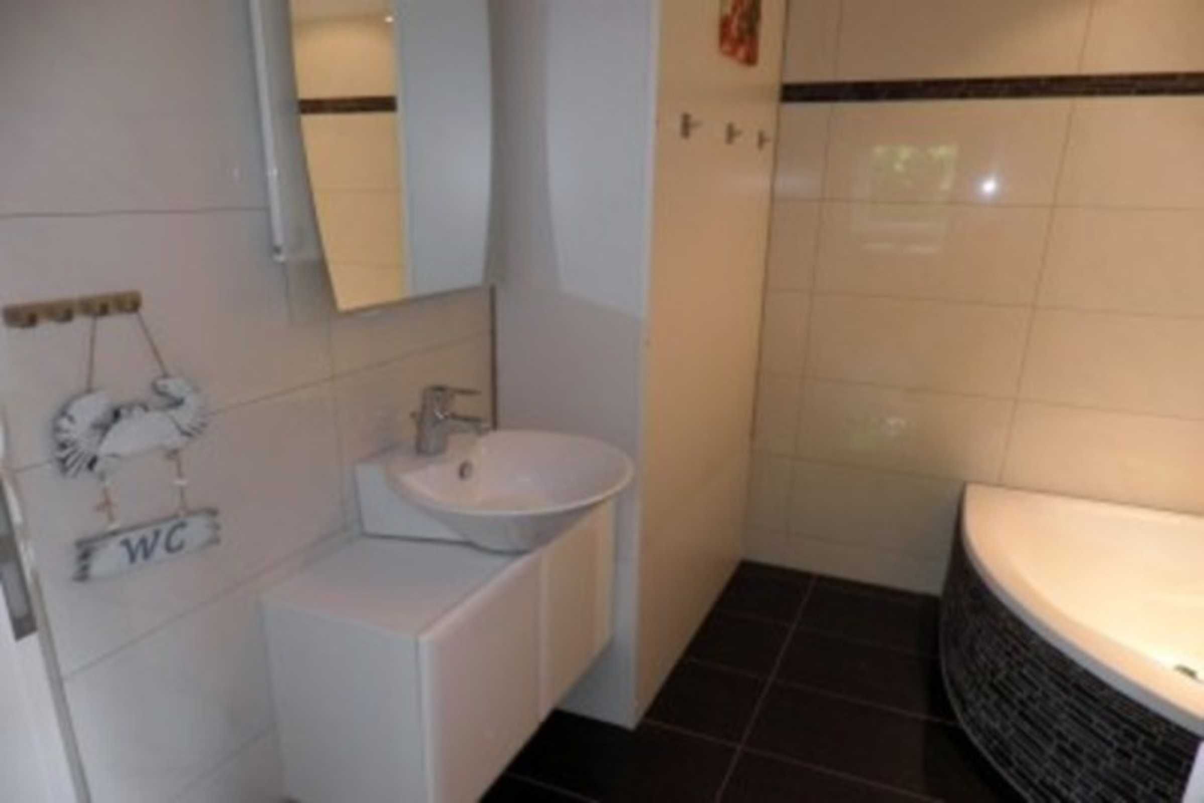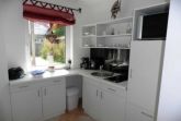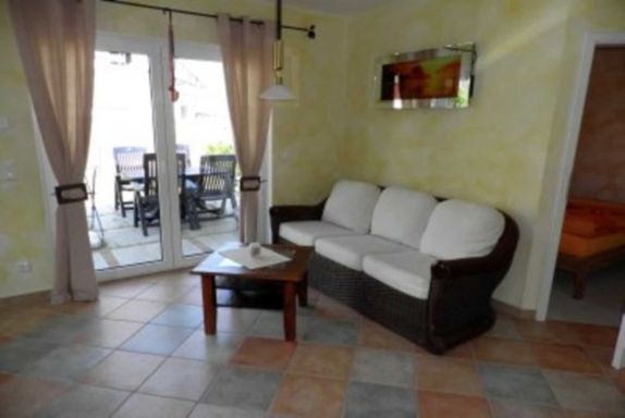 Wohnzimmer mit Küchenbereich und Schlafmöglichkeit für 2 Personen, Kühlschrank mit Eisfach, Schlafzimmer mit Doppelbett, Bad mit Wanne, Terrasse,