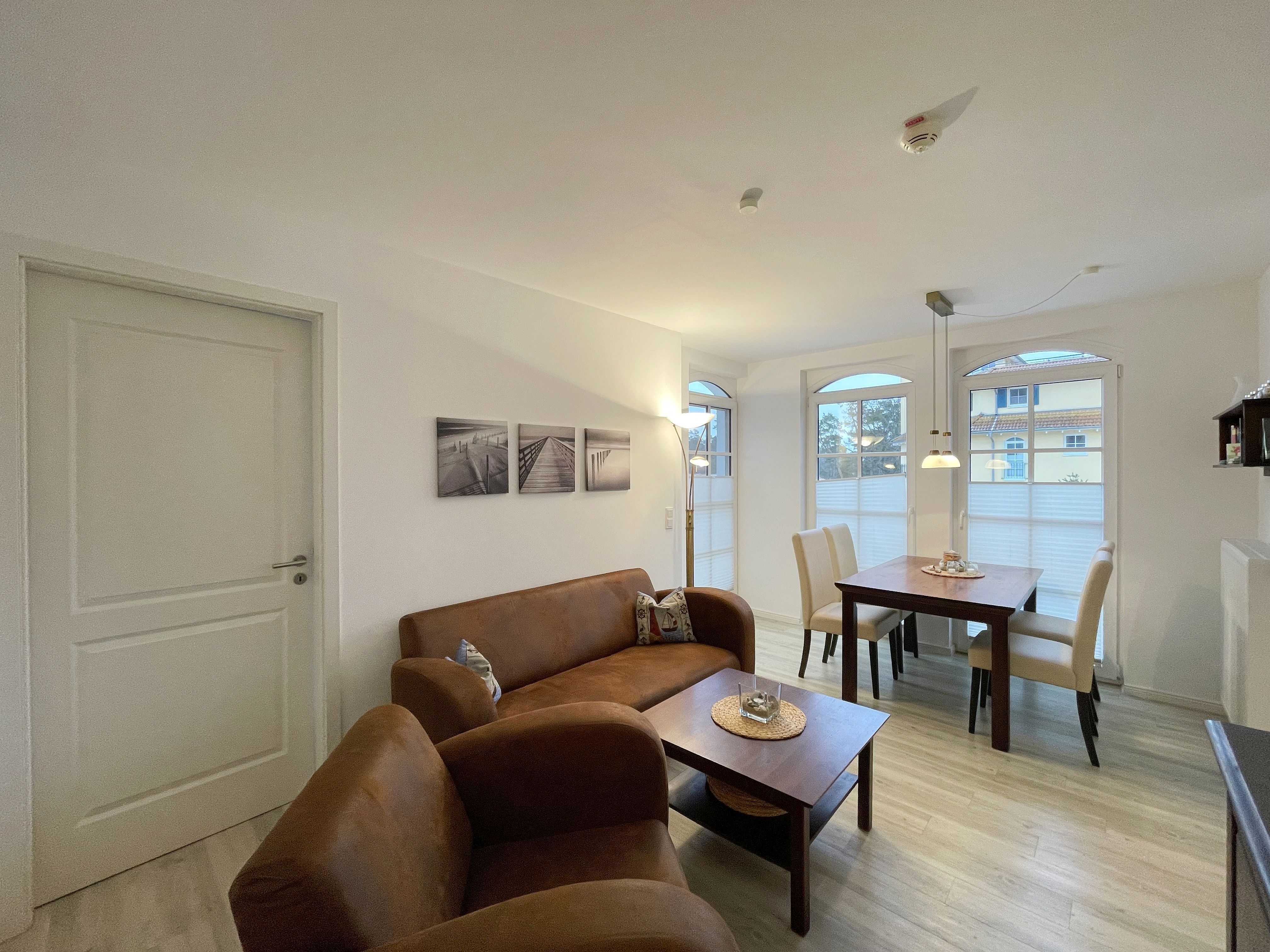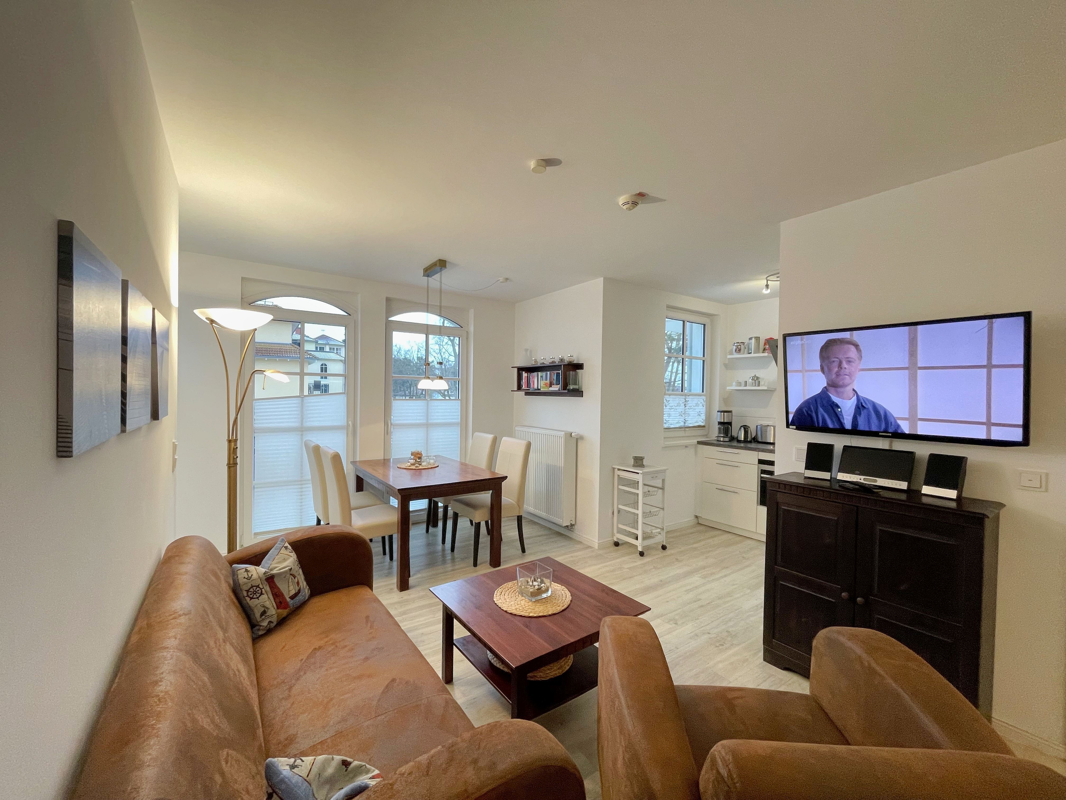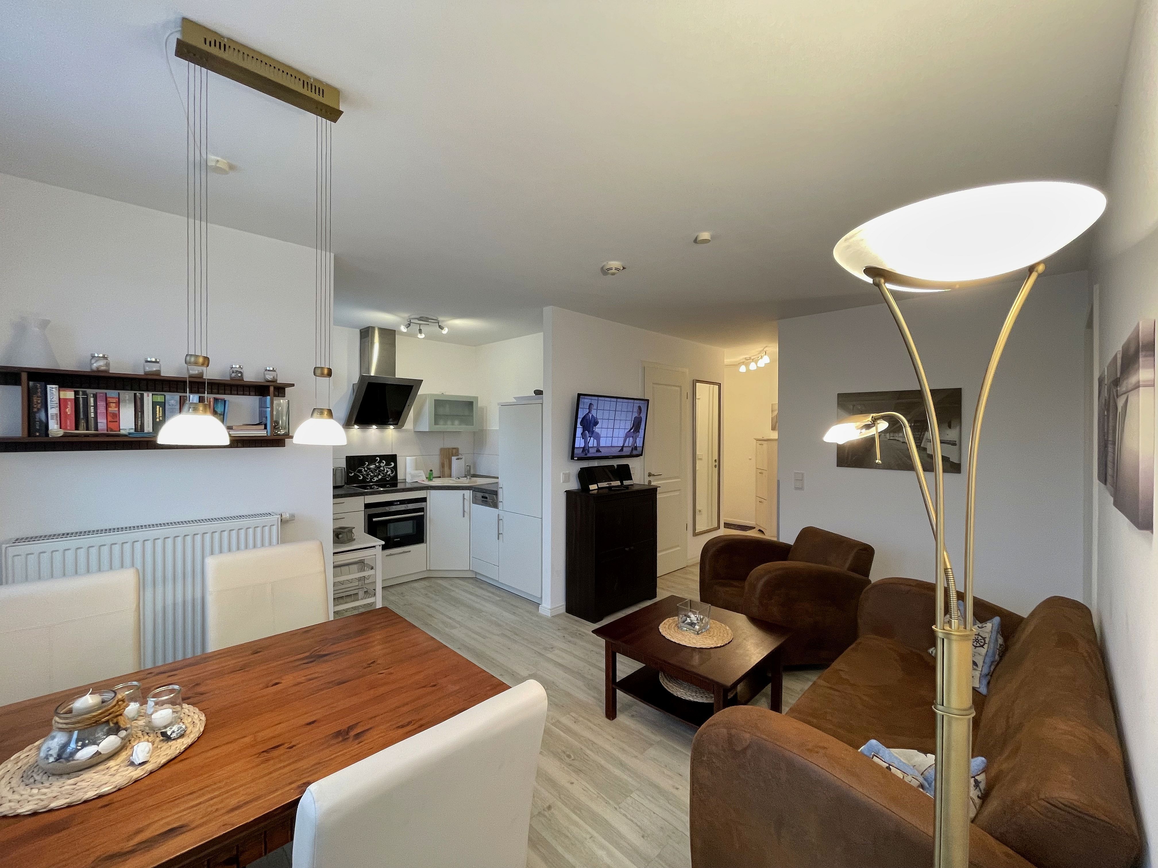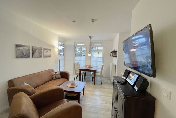 Ihre Nichtraucher/Ferienwohnung ist mit viel Liebe zum Detail ausgestattet und eingerichtet worden. Sie wohnen in einer ca. 51 qm 3-Zimmer Wohnung, die für 2 bis 4 Personen ausgelegt ist. Die Wohnung KOJE 2.31 befindet sich in der 1. Etage und ist per Fahrstuhl vom Haupthaus bequem zu erreichen. In der Wohnung finden Sie einen kombinierten Wohn/Koch- und Essbereich. Die integrierte exklusive Küchenzeile lässt mit Backofen mit Mikrowellenfunktion, Ceranfeld, Spülmaschine, Kühl/Gefrierkombination, Kaffeemaschine und anderen praktischen Helfern keine Wünsche offen. In dem sich anschließenden Wohnbereich ist eine gemütliche Couch, Leselampe, Smart-TV, DVD-Player und eine Musikanlage vorhanden. Auch auf einen Internetanschluss (WLAN) müssen Sie im Urlaub nicht verzichten. Dieser ist für Sie inklusive! Direkt vor den großen lichtdurchfluteten Balkonfenstern finden Sie einen Esstisch mit 4 Stühlen, der Ihnen genügend Platz bietet. Der Eckbalkon (Südausrichtung) ist von dem Wohn/Essbereich begehbar und lädt bei Sonnenschein zum Verweilen ein. Von hier aus haben Sie einen herrlichen Blick Richtung Kurpark und dem Inselparadies. Das 1. Schlafzimmer ist mit einem Doppelbett (1,80m x 2,00m), Nachttischkonsolen, Verdunklungsplissee´s, Kleiderschrank und TV ausgestattet. Das 2. Schlafzimmer verfügt über ein Doppelbett (1,40m x 2,00m), Verdunklungsplissee´s und einen Kleiderschrank. Das exklusive Bad ist mit einer ebenerdigen Klarglasdusche, Waschtisch mit großzügiger Ablage, Kosmetikspiegel, Fön, WC und einem Handtuchheizkörper ausgestattet. Integrierte Spots sorgen in der Decke für ein helles Licht. Insektenschutzgitter befinden sich in den Schlafzimmern sowie im Wohnbereich. Ein eigener PKW-Stellplatz (Nr.128, Einfahrtshöhe 2,00m) befindet sich in der Tiefgarage des Hauses. Im Keller des Hauses haben Sie die Möglichkeit eine Waschmaschine/Trockner gegen Gebühr zu nutzen. Mit dem Fahrstuhl des Hauses A gelangen sie in das Untergeschoss der Meeresblickanlage, wo Sie ein großzügiger und heller Wellnessbereich erwartet. Hier können sie in einem Pool kleine Bahnen schwimmen, in 2 Saunen Ihren Kreislauf in Schwung bringen, in einem dazugehörigen Ruheraum Ihren Körper wieder beruhigen, in einer Schneckendusche sowie weiteren Duschen das kühle Nass genießen und auf einer Außenterrasse mit Außendusche die frische Luft einatmen. Die Erstausstattung eines Wäschepaketes (komplette Bettwäsche, 1 Duschhandtuch, 2 kleine Handtücher) können Sie bis 14 Tage vor Anreise gegen einen Aufpreis dazu buchen oder durch eigene ergänzen. Ab 2 gebuchten Paketen erhalten Sie einmalig 1 Geschirrhandtuch und 1 Duschvorleger hinzu. Haustiere sind nicht erlaubt.