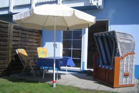 Das Terrassenfenster hat Rollläden. Die Außenterrasse ist mit Tisch, zwei Stühlen, Sonnenschirm und einem Strandkorb (Mai-Oktober) ausgestattet. Der kostenlose Parkplatz liegt direkt neben dem Reihenhaus.