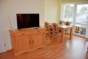 Im Wohnraum befinden sich eine bequeme Sitzcouch mit Tisch und ein modernes Flachbild-TV-Gerät. Hier steht auch ein großer Esstisch mit Stühlen. Die moderne Küchenzeile ist mit einem Herd, Wasserkocher, Kaffeemaschine, Toaster und Kühlschrank komplett ausgestattet. Die Wohnung 01 hat einen Backofen sowie eine Spülmaschine, die Wohnung 02 eine Mikrowelle sowie einen Minibackofen zum Brötchen aufbacken und eine Spülmaschine.