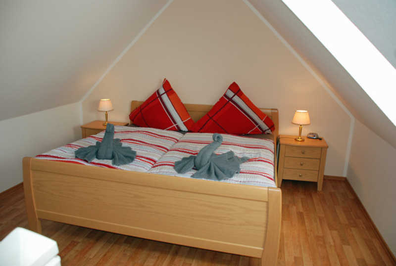 Über eine Holztreppe gelangt man in das im Dachgeschoss liegende Schlafzimmer. Hier steht ein bequemes Doppelbett mit Nachttischen und Leselampen.