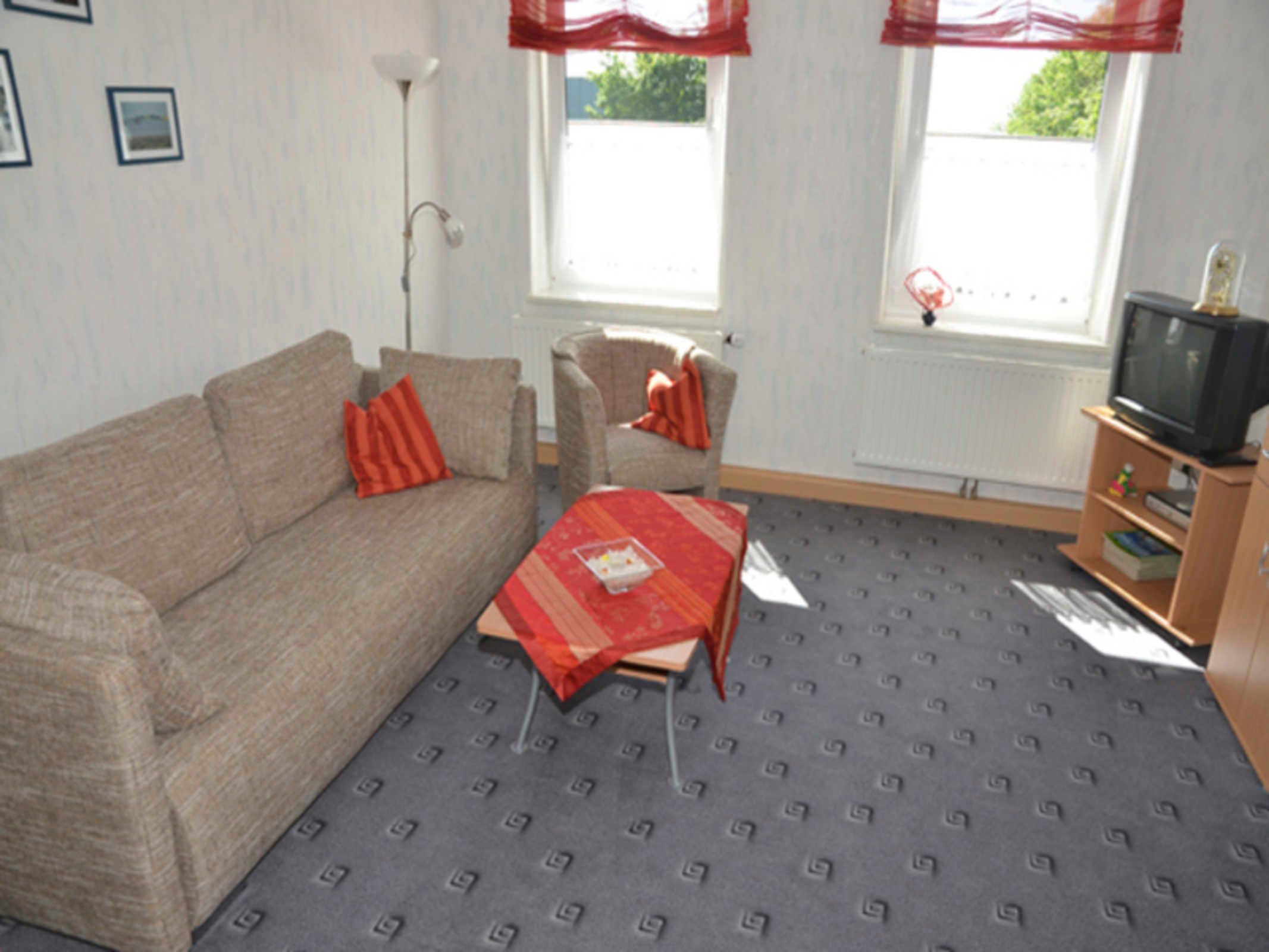 Die Ferienwohnung besteht aus einem gemütlichen Wohnzimmer mit Sitzgruppe. Diese wird bei Aufbettung die Schlafgelegenheit für den dritten und vierten Gast. Sie ist als Nichtraucherwohnung ausgelegt. Das Schlafzimmer verfügt über ein Doppelbett. In der vollständig eingerichteten Küche gibt es einen Eßtisch für vier Personen. Das Bad hat eine Badewanne mit Duschabtrennung und WC.