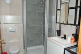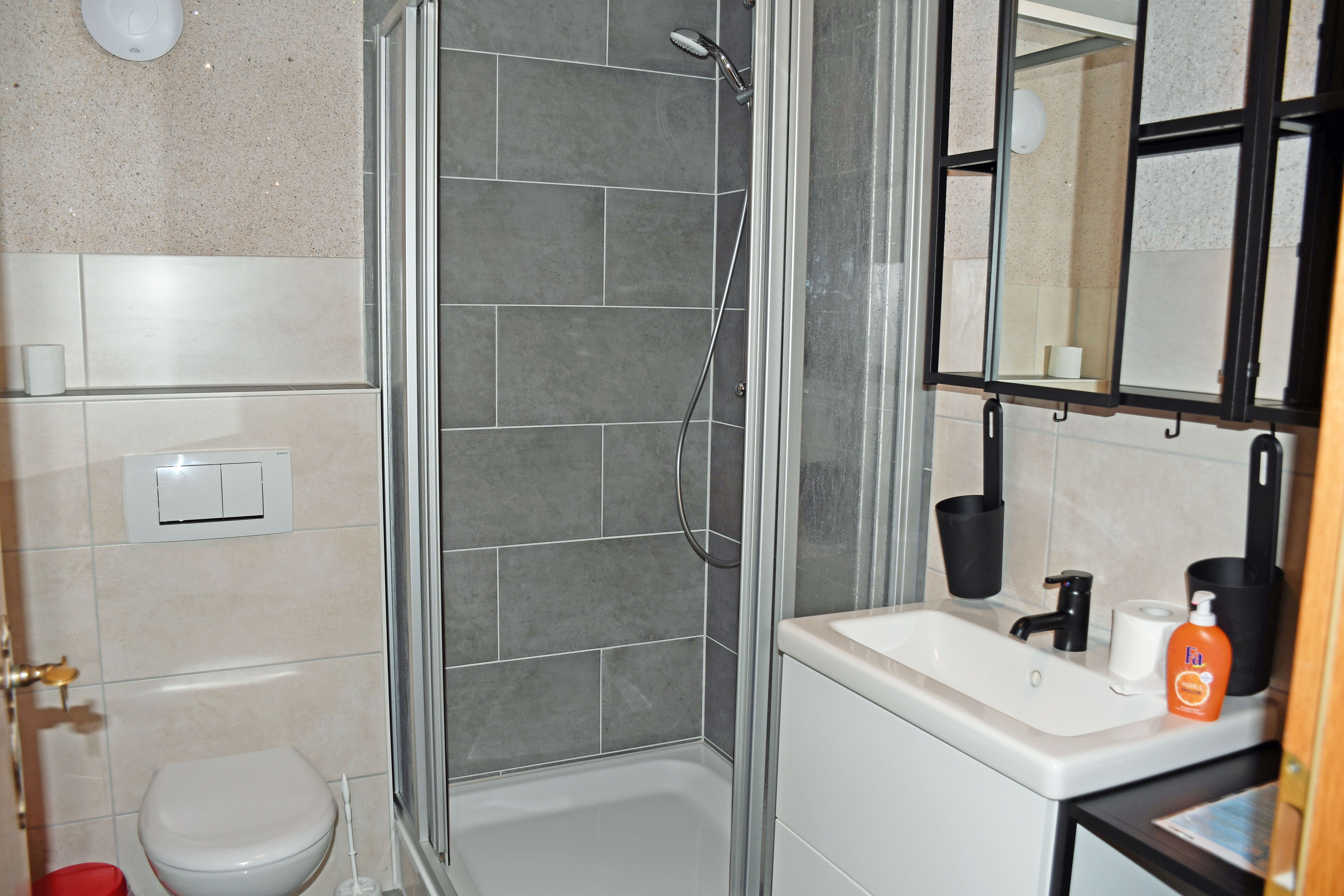 Das Bad ist mit Dusche, WC und Waschtisch ausgestattet.