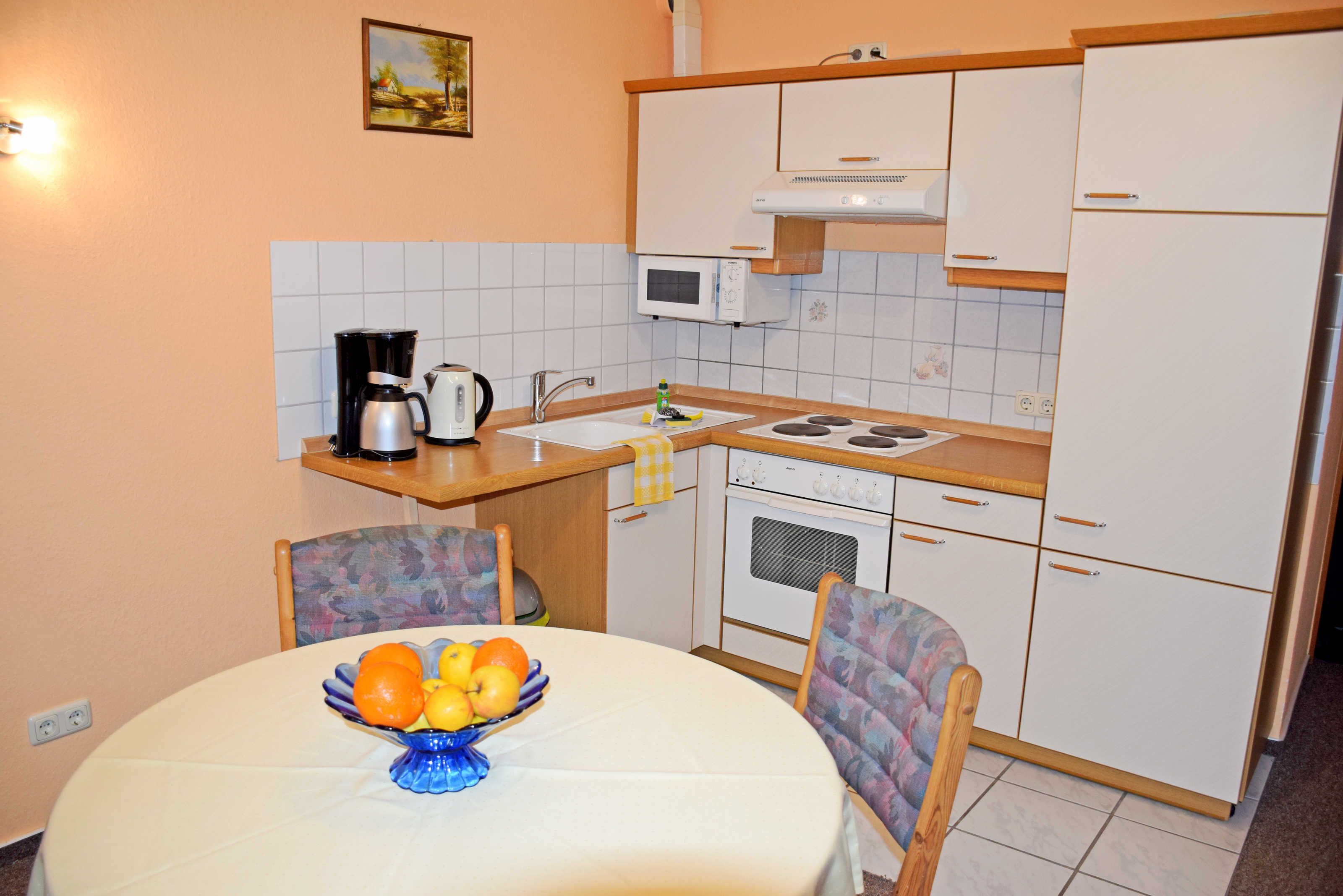 Die neu eingerichtete Küchenzeile ist mit einem Cerankochfeld, Backofen, Abzugshaube, Geschirrspüler, Wasserkocher, Kaffeemaschine, Toaster, Mikrowelle und Kühlschrank komplett ausgestattet.