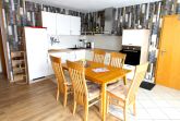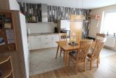 Die zum Wohnraum offene Küche ist komplett ausgestattet mit Herd- Backofen, Geschirrspüler, Kühlschrank, Gefrierschrank, Kaffeemaschine, Wasserkocher und Toaster. Der Essbereich ist in die Küche integriert.