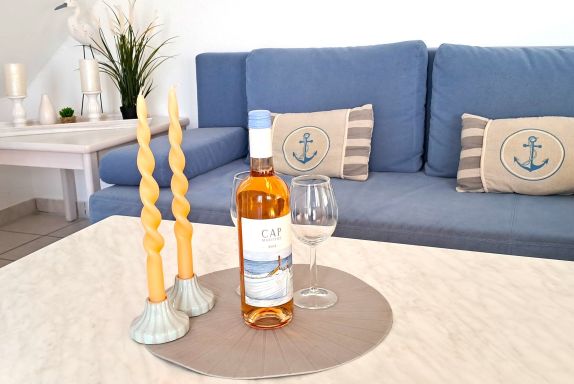 Die im 2. OG befindliche Ferienunterkunft bietet Platz für max. 6 Personen, bei ca. 68 m². In der Ferienwohnung befinden sich ein Schlafzimmer mit Doppelbett,ein Wohn-Schlafbereich mit Doppel-Schlafcouch, sowie darüber eine offen gelegene Galerie mit zwei Einzelbetten. Unsere Gäste haben einen traumhaften Panorama-Meerblick, Küche, Vollbad und einen Balkon.