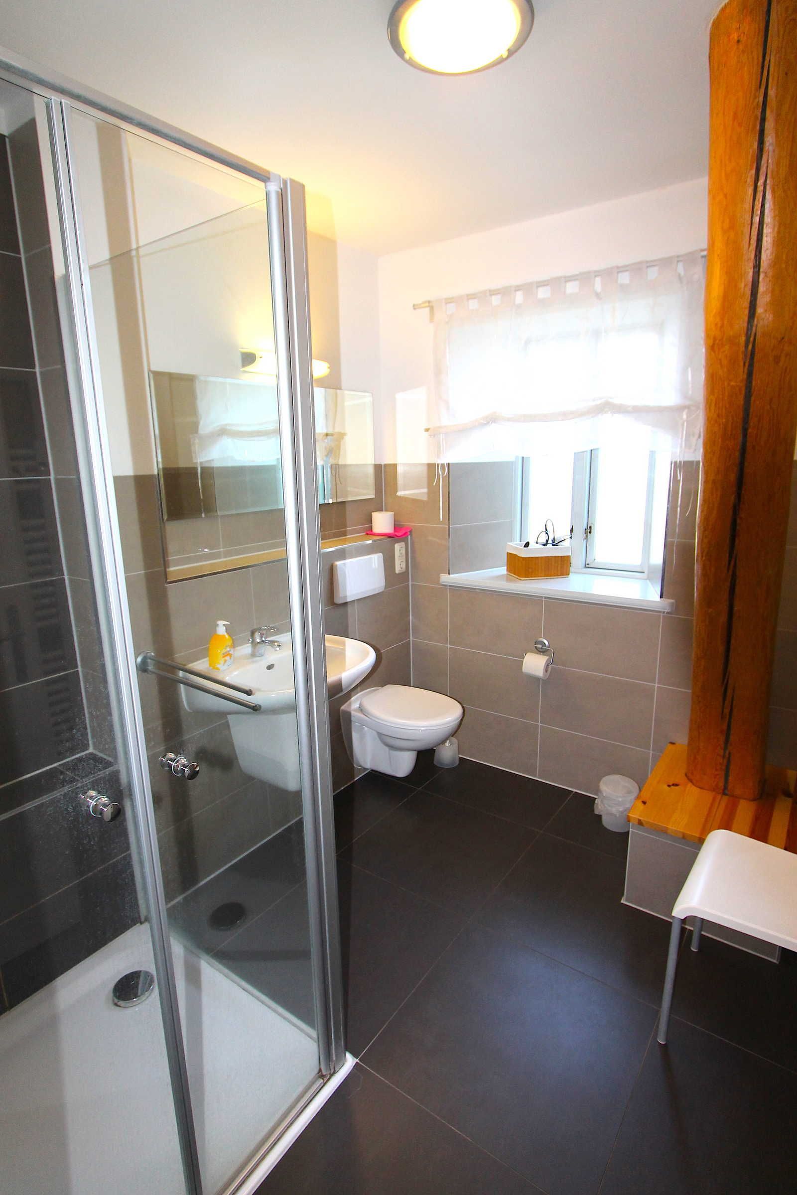 Im geräumigen Badezimmer befinden sich eine Dusche und WC.