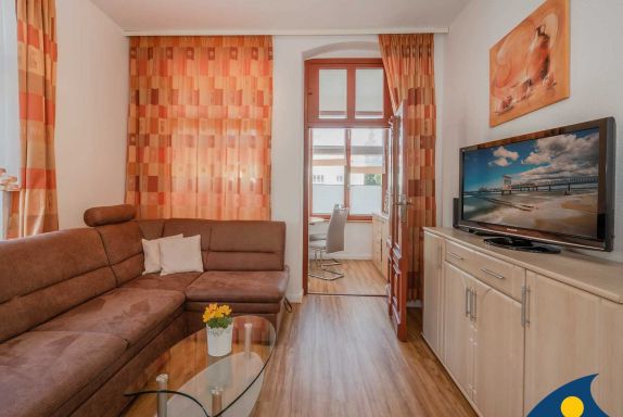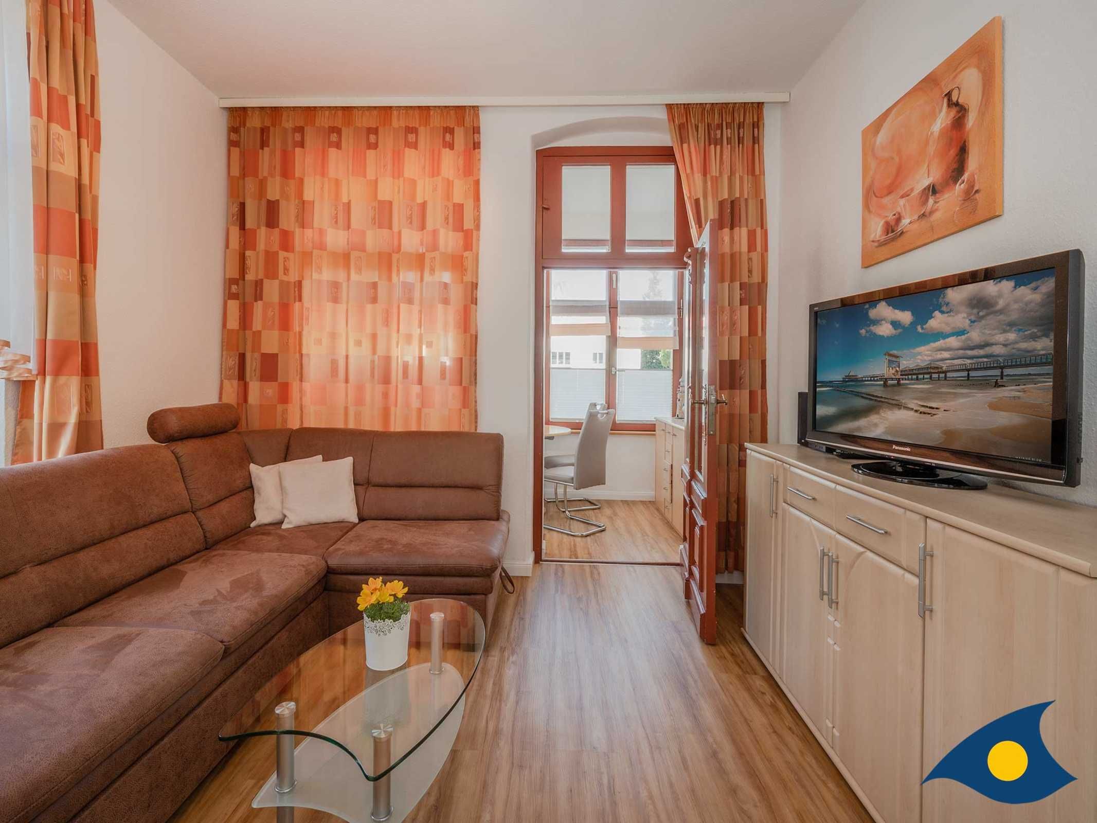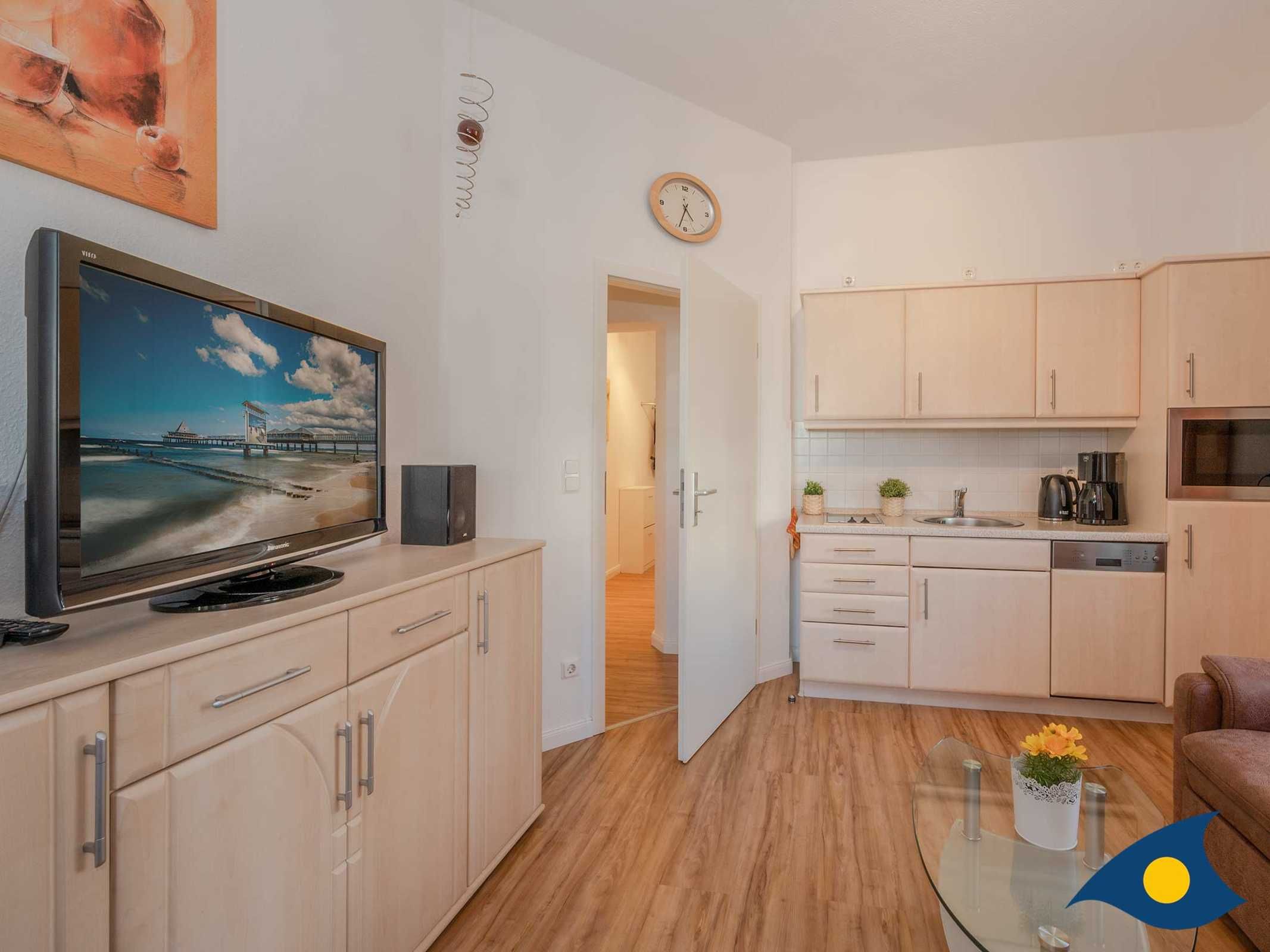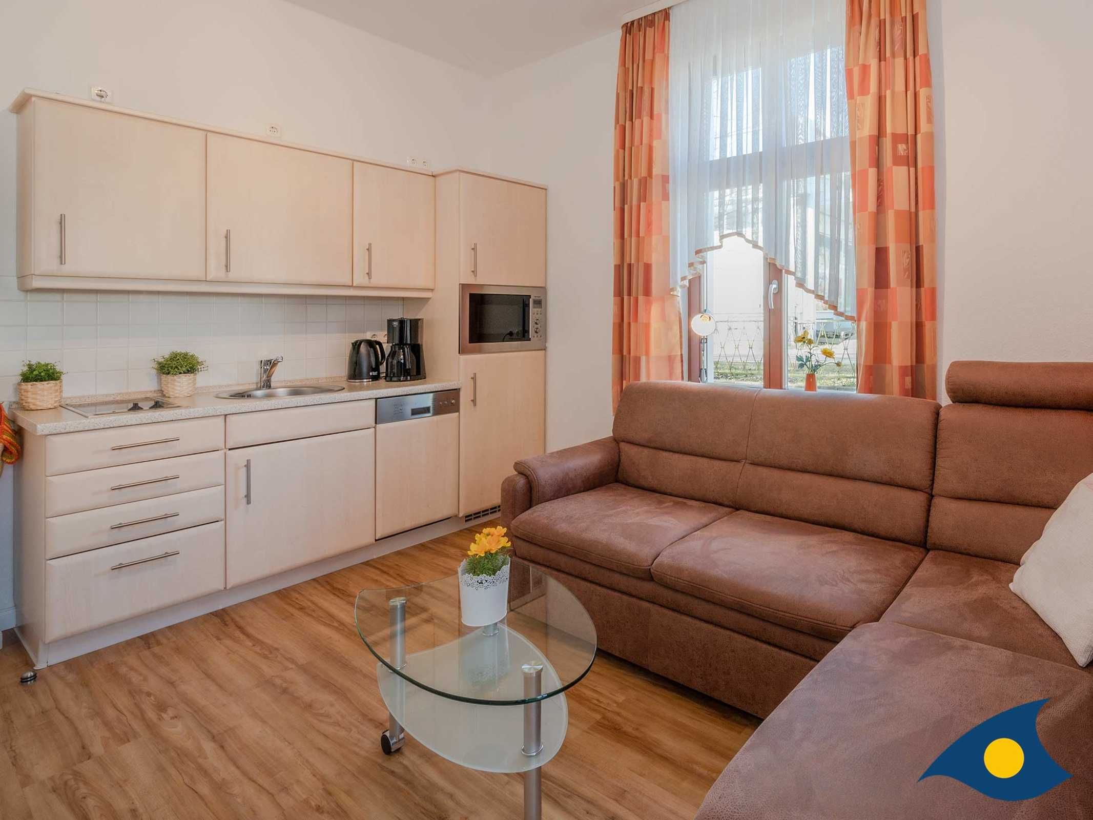 Das gemütliche 3-Raum-Appartement bietet Ihnen alles, was Sie für einen erholsamen Urlaub mit bis zu 3 Personen benötigen. Das Wohnzimmer verfügt über eine großzügige Sofalandschaft und lädt zum gemeinsamen Relaxen ein. Die Küchenzeile ist im Wohnbereich integriert und stellt für Sie eine Spülmaschine, einen Backofen, eine Mikrowelle und einen Kühlschrank mit Gefrierfach bereit.
