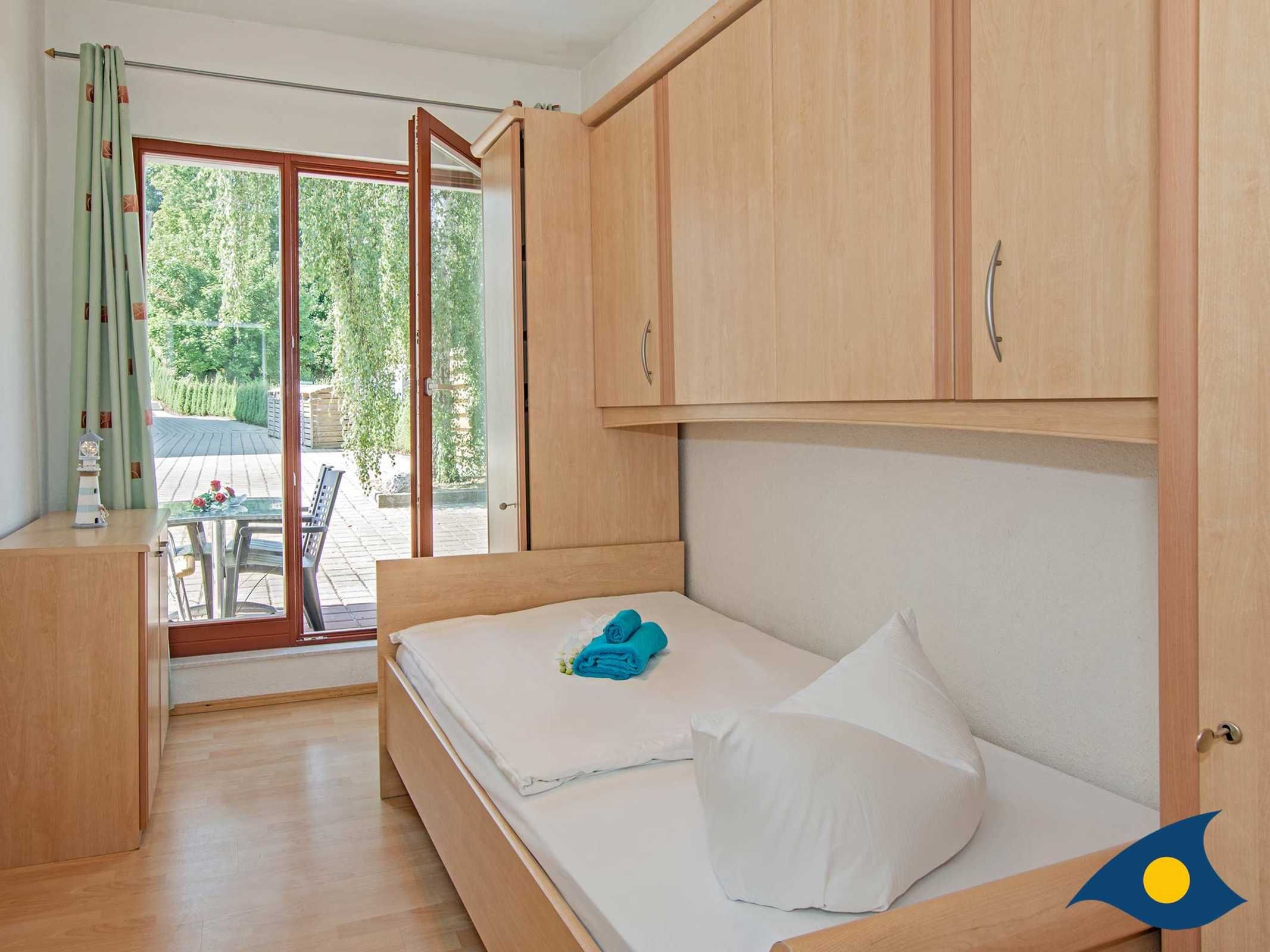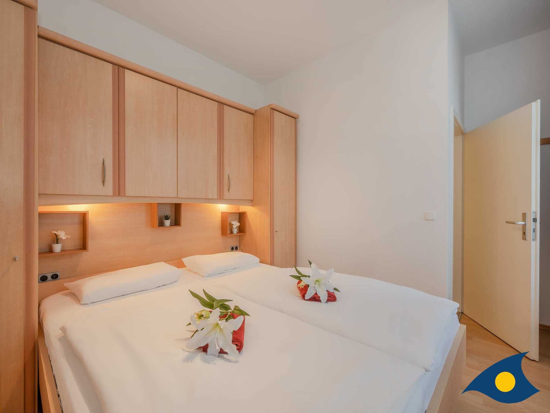 Im Elternschlafzimmer erwartet Sie ein großzügiges Doppelbett und genügend Ablagemöglichkeit für Ihre persönlichen Dinge. Das zweite Schlafzimmer kann als Kinder- oder Gastzimmer genutzt werden. Hier steht ein komfortables Einzelbett zur Verfügung. Auf der großen Terrasse mit südlicher Ausrichtung lassen Sie Ihre Urlaubsabende ausklingen oder genießen die Nachmittagssonne.