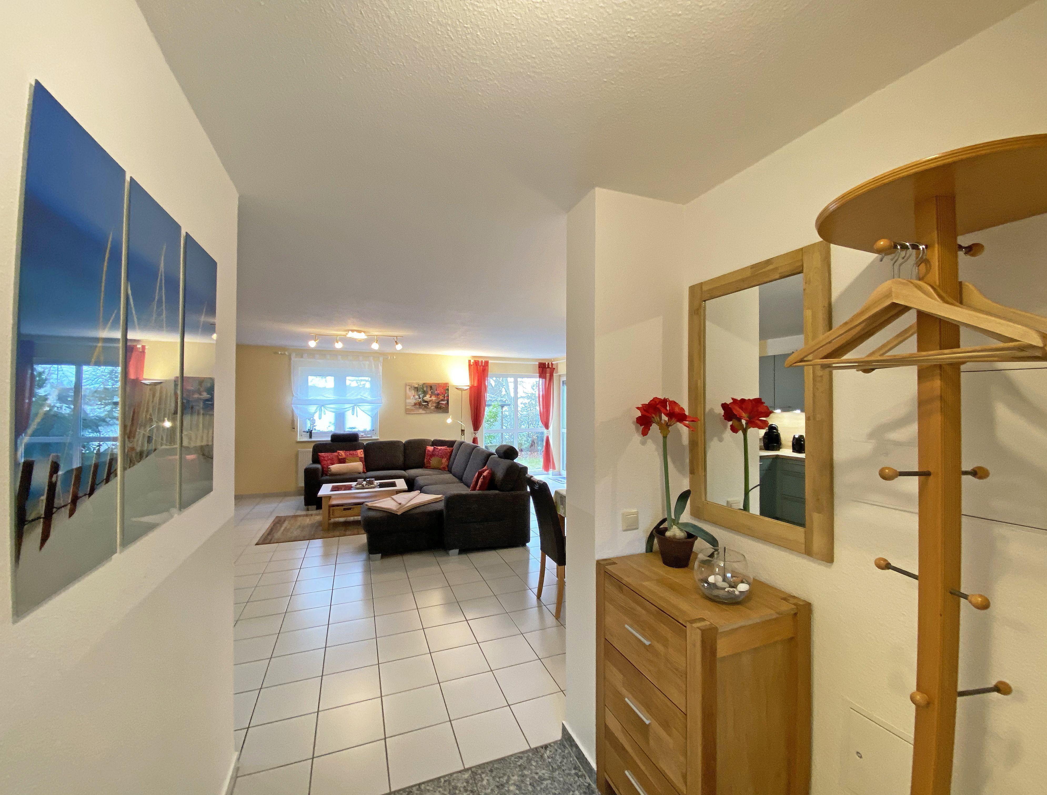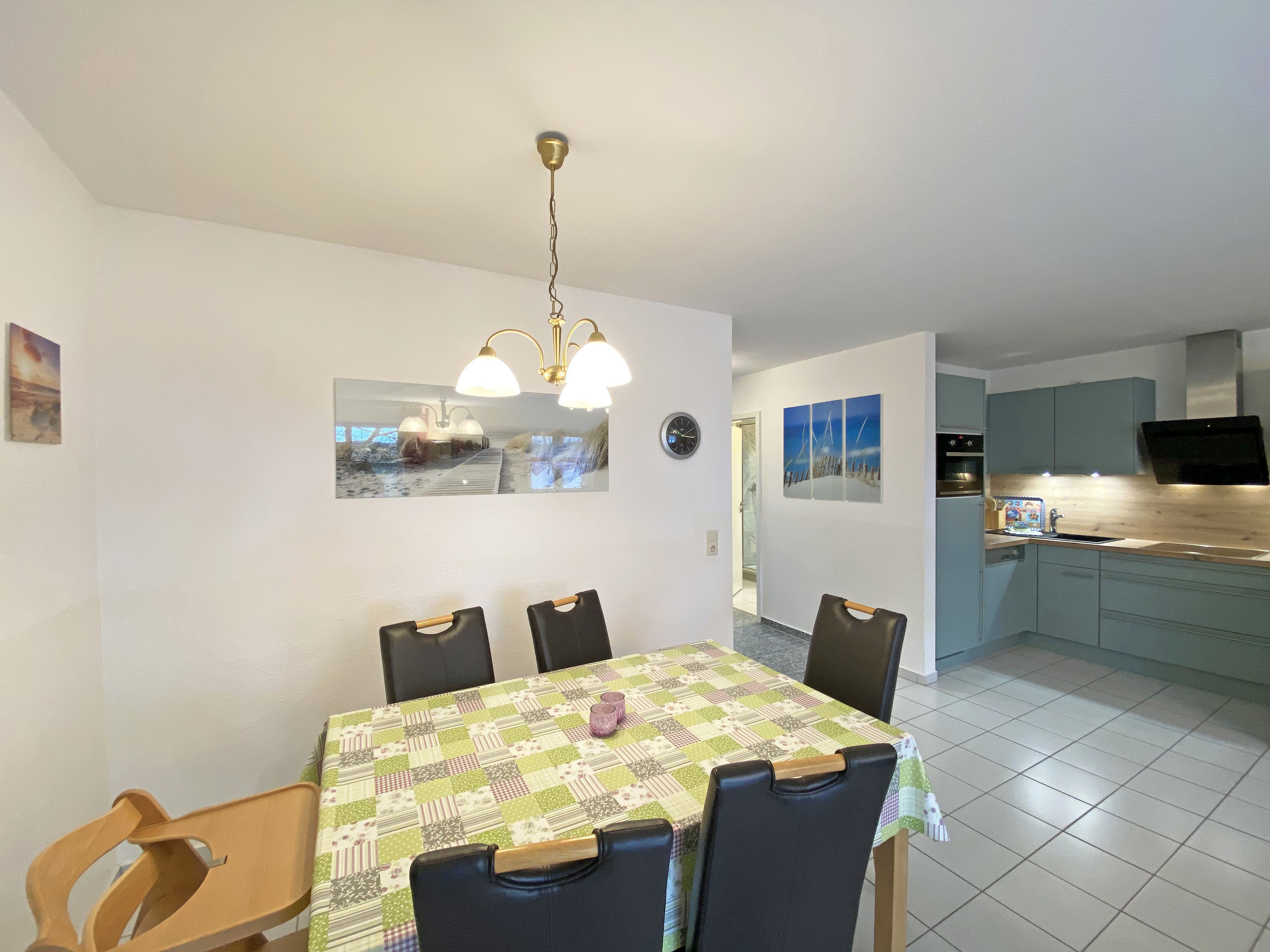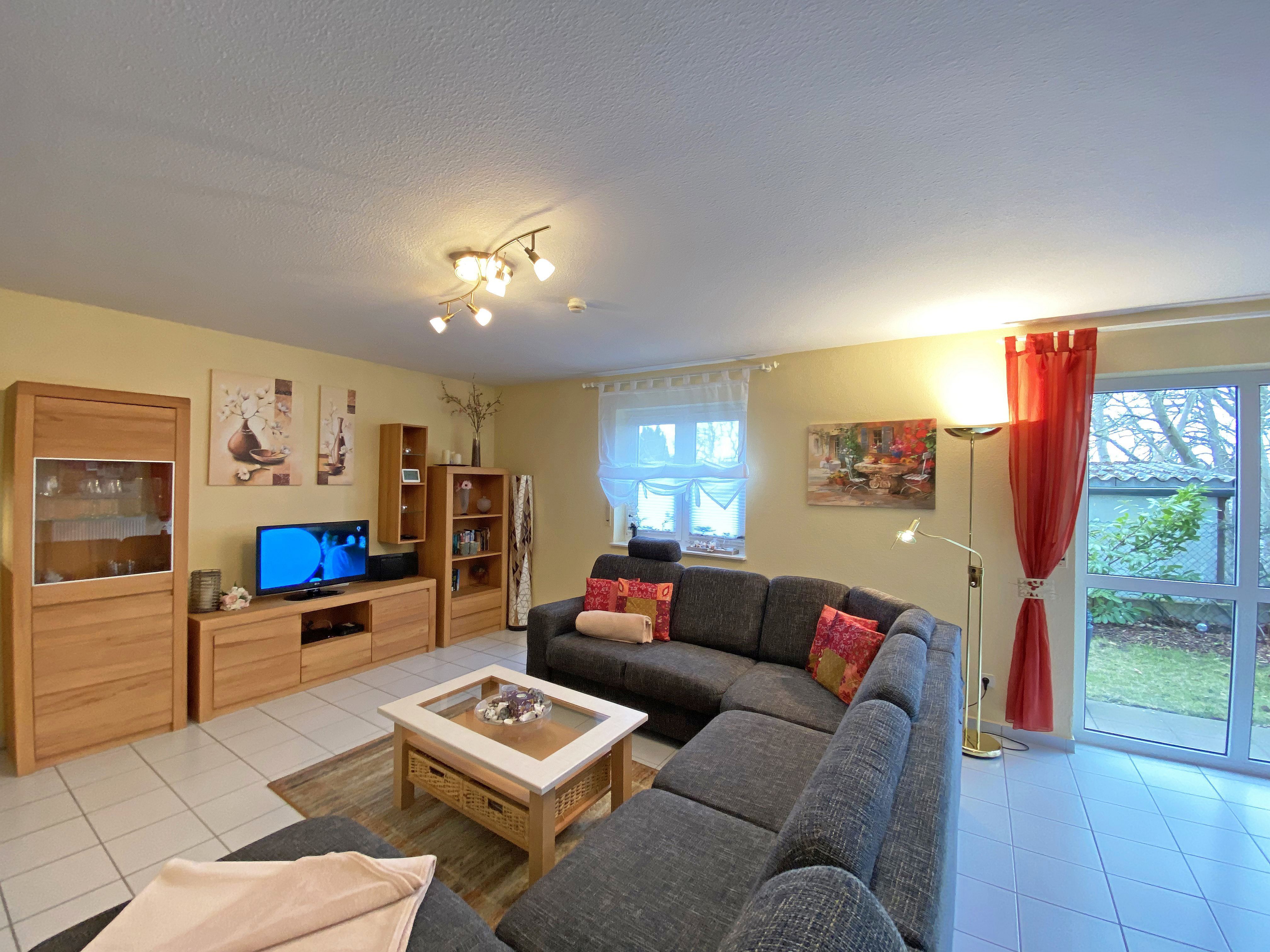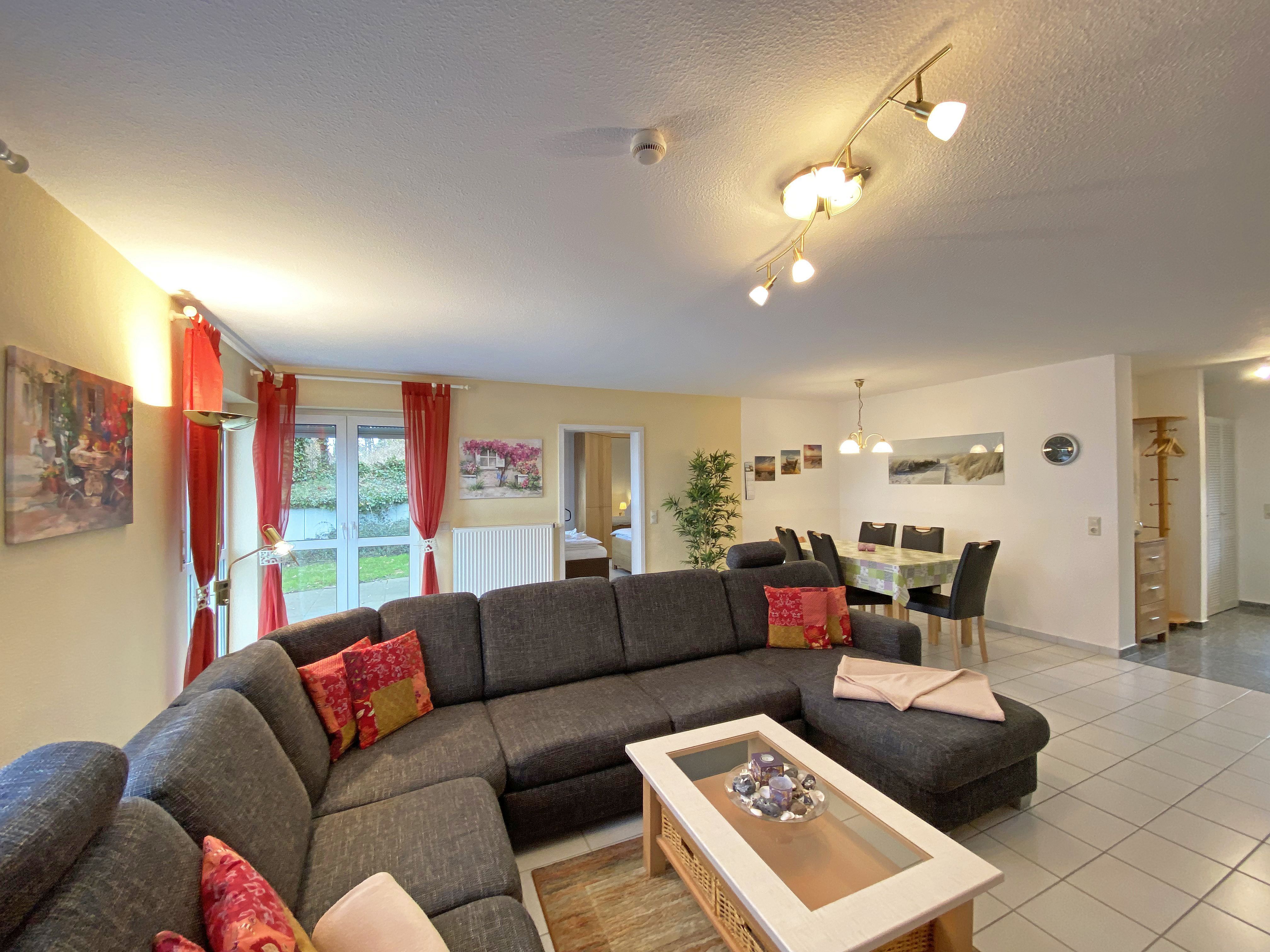 Die freundlich eingerichtete Nichtraucherwohnung umfasst ca. 68 qm und bietet Platz für 4 Erw. + 1 Kind bis 17 Jahre. Die 2 Raumwohnung im Erdgeschoss ist sehr großzügig geschnitten und verfügt über ein Schlafzimmer mit einem Doppelbett (á 0,90m x 1,90m), einem Einzelbett (0,90m x 1,90m), Nachttischkonsolen, Kleiderschrank sowie einen Zugang zur Terrasse. Im Wohn-/ Essbereich finden Sie eine Essecke mit zusätzlichen Stühlen sowie eine gemütliche Couchecke (mit Ausziehfunktion 1,40m x 2,10m), Tisch, Leselampe, Anrichte sowie Smart-TV und Blue- Ray-Player. Angrenzend haben Sie die komplett ausgestattete Küchenzeile mit Geschirrspüler, Kühlschrank + Eisfach, 4 Zonen-Ceranfeld mit Backofen, Kaffeemaschine, Tassimo Kapselmaschine, Toaster und Wasserkocher sowie diverse Küchenutensilien. Das Badezimmer mit Fenster ist komplett mit Marmorfliesen versehen und verfügt über eine Dusche mit flachem Einstieg, Waschtisch, Fön und WC. Die sonnige Terrasse, die Sie durch den Wohn- und Schlafbereich erreichen, lädt Sie ein Ihren Urlaubstag in Ruhe ausklingen zu lassen. Alle Räumlichkeiten sind gefliest und der Wohnbereich sowie das Schlafzimmer sind durch Außenrollos verdunkelbar. Ein kostenfreier WLAN- Zugang ist in der Wohnung vorhanden. Die Erstausstattung eines Wäschepaketes (komplette Bettwäsche, 1 Duschhandtuch, 1 kleines Handtuch) können Sie bis 14 Tage vor Anreise gegen einen Aufpreis dazu buchen oder durch eigene ergänzen. Ab 2 gebuchten Paketen erhalten Sie einmalig 1 Geschirrhandtuch und 1 Duschvorleger hinzu. Ein PKW-Stellplatz gehört zu Ihrer Wohnung dazu. Die Nutzung einer Wallbox mit 11KW Ladeleistung ist nach Verfügbarkeit und Voranmeldung vor Ort möglich. Bedingungen und FAQ`s sind vor Ort einsehbar. In einem Gemeinschaftsraum können Sie gegen eine Gebühr Waschmaschine und Trockner nutzen. Für unsere kleinen Gäste steht ein Kinderhochstuhl sowie ein Kinderreisebett (ohne Matratze und Bett Inlett) inklusive zur Verfügung. Für Ihre mitgebrachten oder geliehenen Fahrräder steht ein kleiner Fahrradkeller zur Verfügung sowie zusätzlich teilweise überdachte Fahrradständer.