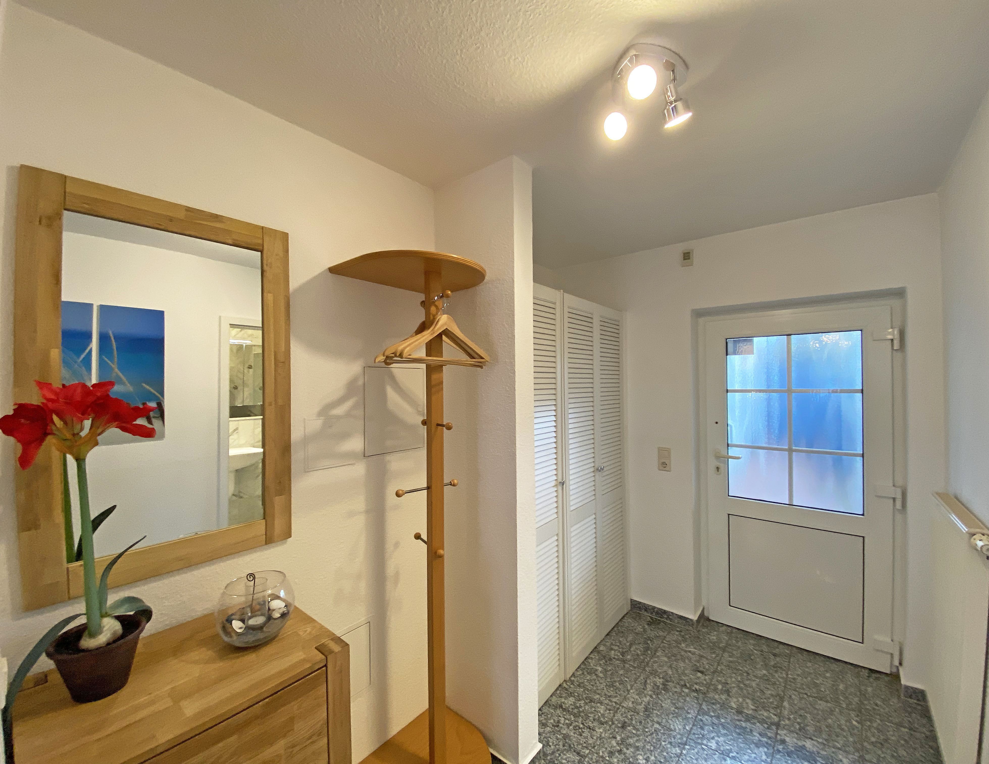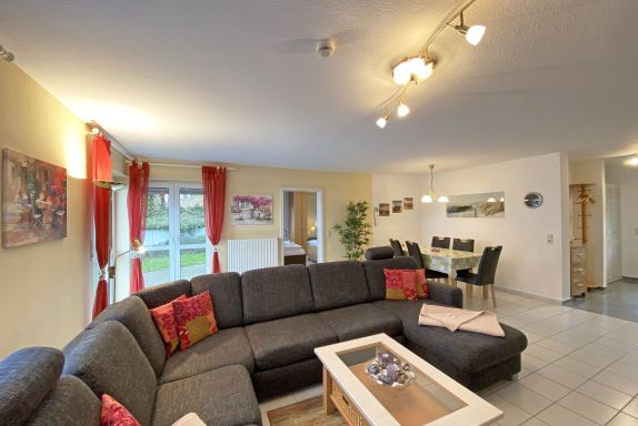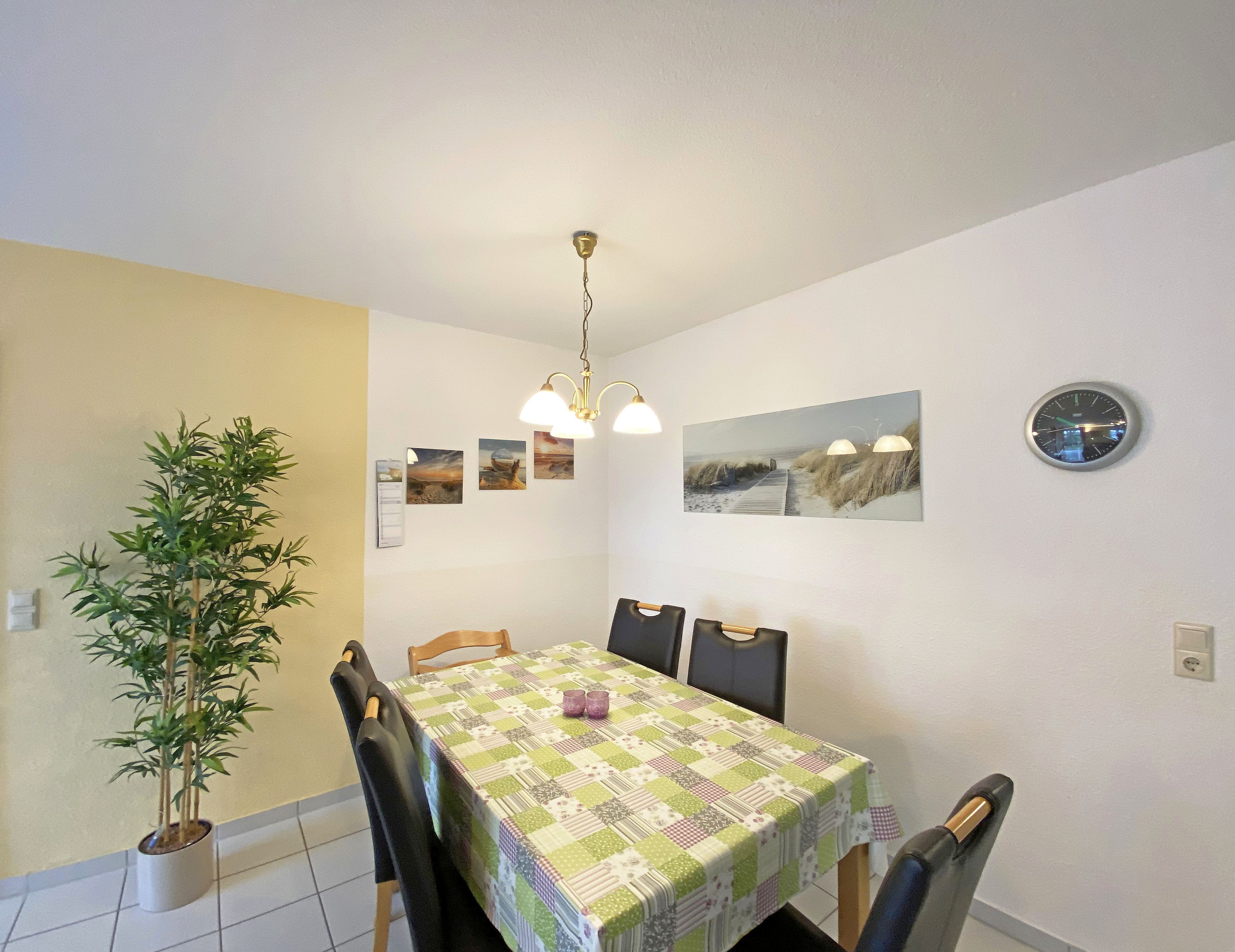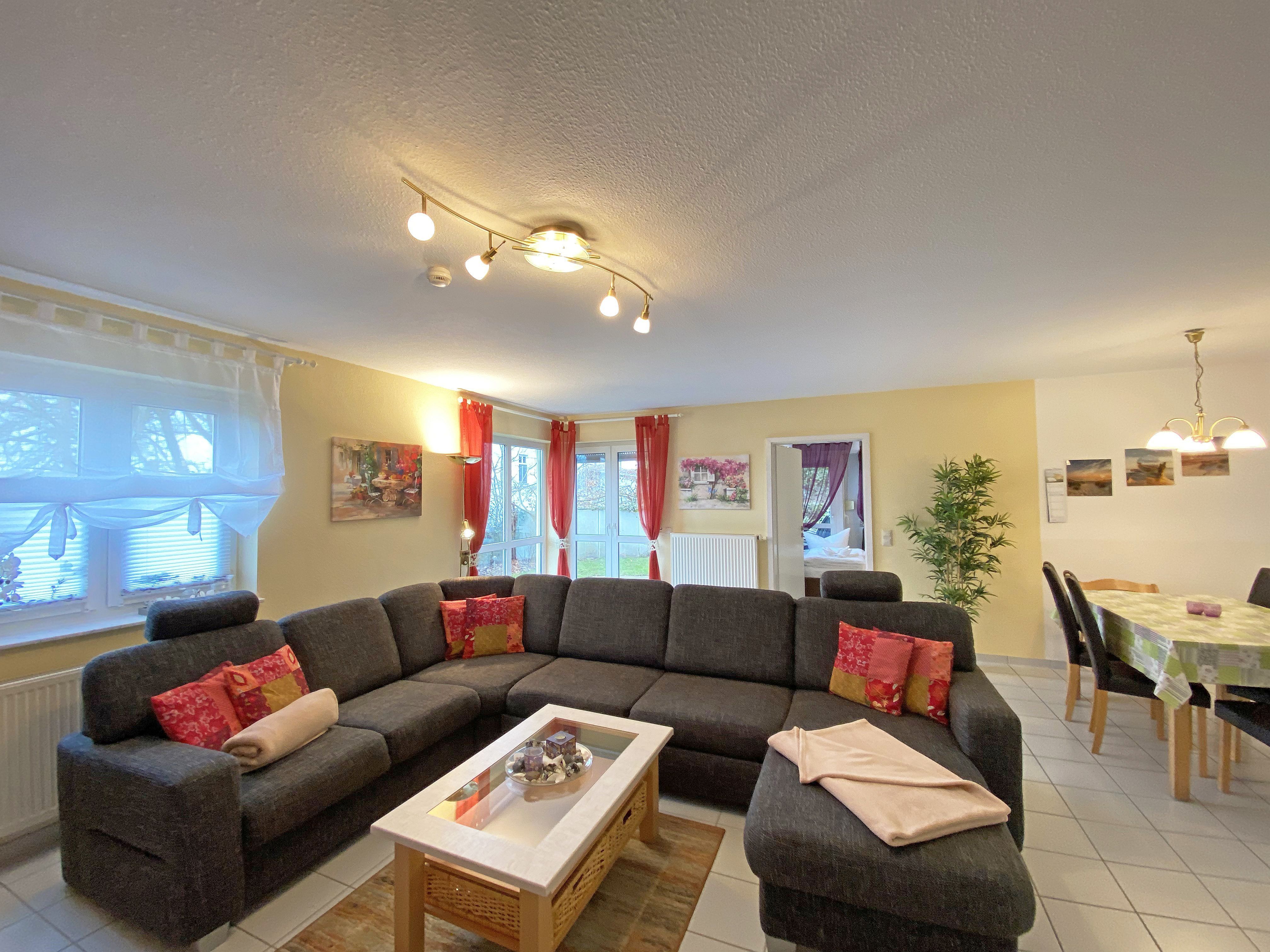 Die freundlich eingerichtete Nichtraucherwohnung umfasst ca. 68 qm und bietet Platz für 4 Erw. + 1 Kind bis 17 Jahre. Die 2 Raumwohnung im Erdgeschoss ist sehr großzügig geschnitten und verfügt über ein Schlafzimmer mit einem Doppelbett (á 0,90m x 1,90m), einem Einzelbett (0,90m x 1,90m), Nachttischkonsolen, Kleiderschrank sowie einen Zugang zur Terrasse. Im Wohn-/ Essbereich finden Sie eine Essecke mit zusätzlichen Stühlen sowie eine gemütliche Couchecke (mit Ausziehfunktion 1,40m x 2,10m), Tisch, Leselampe, Anrichte sowie Smart-TV und Blue- Ray-Player. Angrenzend haben Sie die komplett ausgestattete Küchenzeile mit Geschirrspüler, Kühlschrank + Eisfach, 4 Zonen-Ceranfeld mit Backofen, Kaffeemaschine, Tassimo Kapselmaschine, Toaster und Wasserkocher sowie diverse Küchenutensilien. Das Badezimmer mit Fenster ist komplett mit Marmorfliesen versehen und verfügt über eine Dusche mit flachem Einstieg, Waschtisch, Fön und WC. Die sonnige Terrasse, die Sie durch den Wohn- und Schlafbereich erreichen, lädt Sie ein Ihren Urlaubstag in Ruhe ausklingen zu lassen. Alle Räumlichkeiten sind gefliest und der Wohnbereich sowie das Schlafzimmer sind durch Außenrollos verdunkelbar. Ein kostenfreier WLAN- Zugang ist in der Wohnung vorhanden. Die Erstausstattung eines Wäschepaketes (komplette Bettwäsche, 1 Duschhandtuch, 1 kleines Handtuch) können Sie bis 14 Tage vor Anreise gegen einen Aufpreis dazu buchen oder durch eigene ergänzen. Ab 2 gebuchten Paketen erhalten Sie einmalig 1 Geschirrhandtuch und 1 Duschvorleger hinzu. Ein PKW-Stellplatz gehört zu Ihrer Wohnung dazu. Die Nutzung einer Wallbox mit 11KW Ladeleistung ist nach Verfügbarkeit und Voranmeldung vor Ort möglich. Bedingungen und FAQ`s sind vor Ort einsehbar. In einem Gemeinschaftsraum können Sie gegen eine Gebühr Waschmaschine und Trockner nutzen. Für unsere kleinen Gäste steht ein Kinderhochstuhl sowie ein Kinderreisebett (ohne Matratze und Bett Inlett) inklusive zur Verfügung. Für Ihre mitgebrachten oder geliehenen Fahrräder steht ein kleiner Fahrradkeller zur Verfügung sowie zusätzlich teilweise überdachte Fahrradständer.