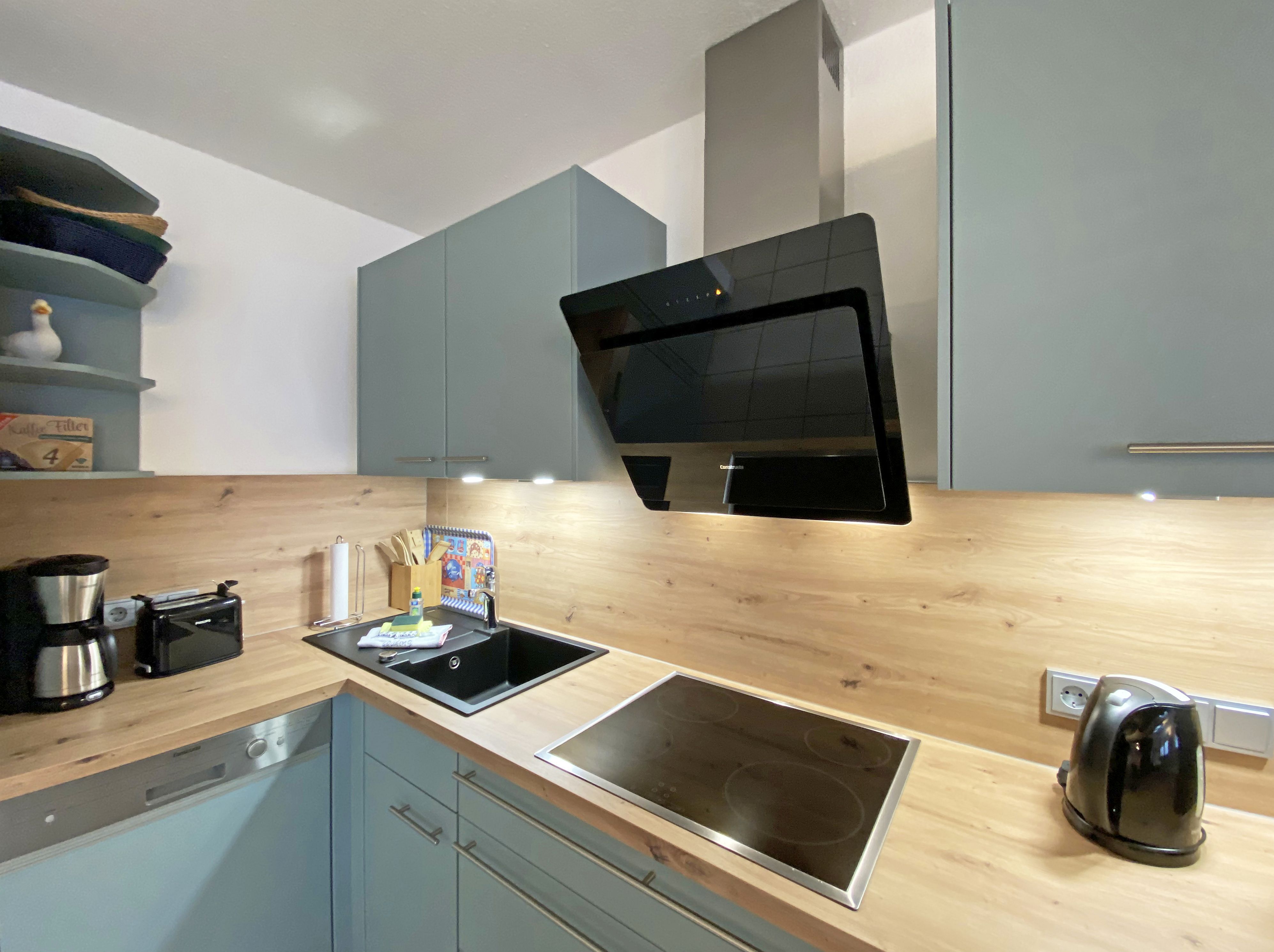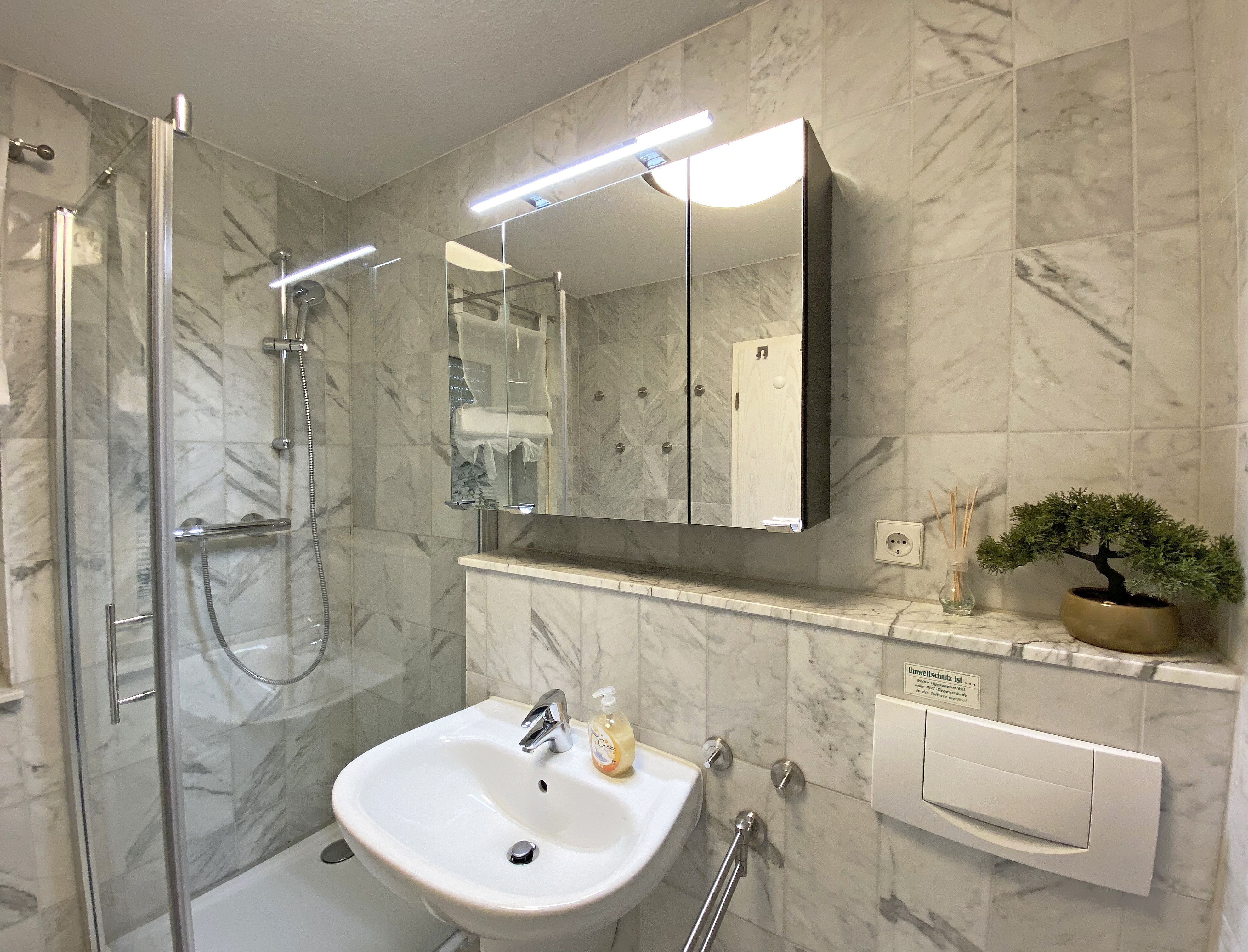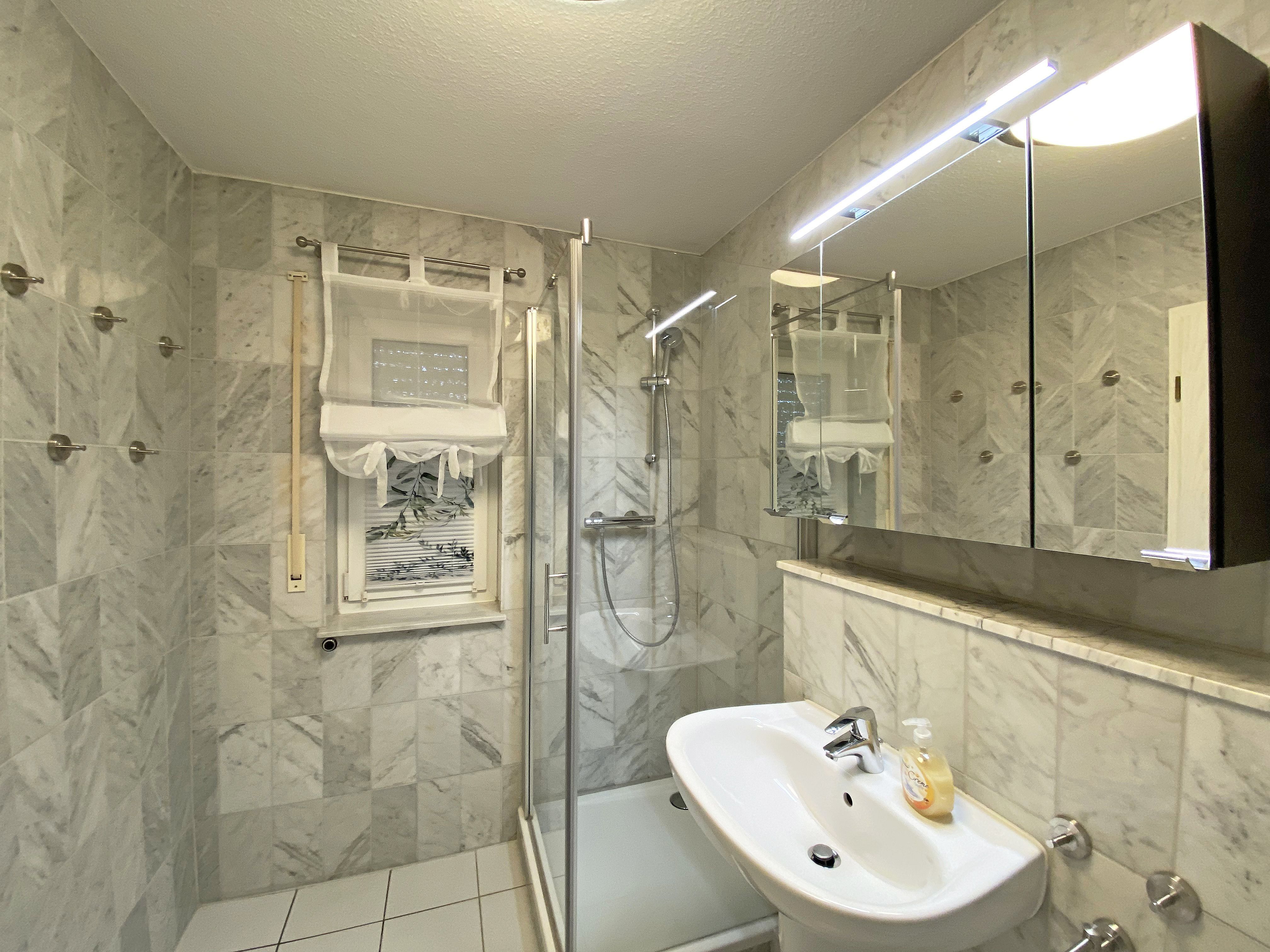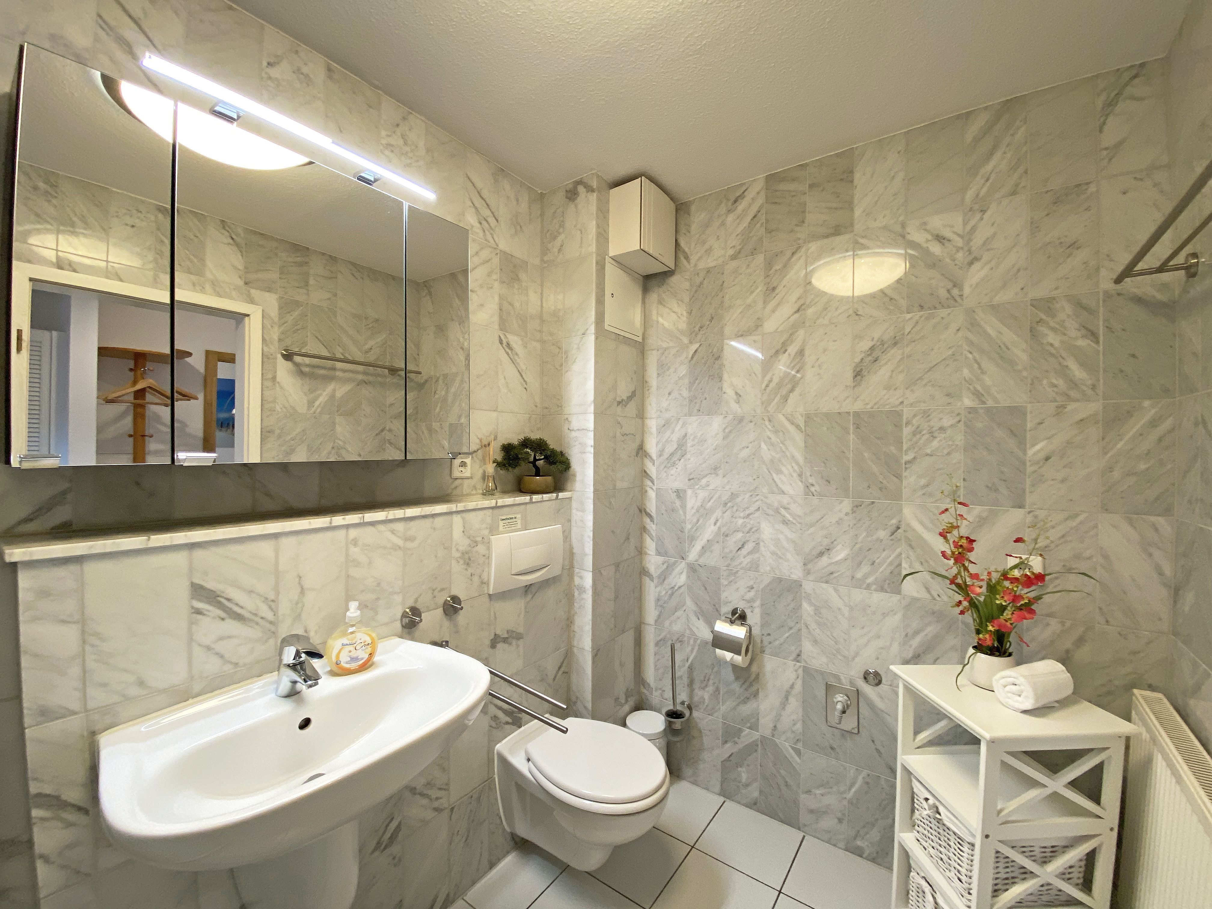 Die freundlich eingerichtete Nichtraucherwohnung umfasst ca. 68 qm und bietet Platz für 4 Erw. + 1 Kind bis 17 Jahre. Die 2 Raumwohnung im Erdgeschoss ist sehr großzügig geschnitten und verfügt über ein Schlafzimmer mit einem Doppelbett (á 0,90m x 1,90m), einem Einzelbett (0,90m x 1,90m), Nachttischkonsolen, Kleiderschrank sowie einen Zugang zur Terrasse. Im Wohn-/ Essbereich finden Sie eine Essecke mit zusätzlichen Stühlen sowie eine gemütliche Couchecke (mit Ausziehfunktion 1,40m x 2,10m), Tisch, Leselampe, Anrichte sowie Smart-TV und Blue- Ray-Player. Angrenzend haben Sie die komplett ausgestattete Küchenzeile mit Geschirrspüler, Kühlschrank + Eisfach, 4 Zonen-Ceranfeld mit Backofen, Kaffeemaschine, Tassimo Kapselmaschine, Toaster und Wasserkocher sowie diverse Küchenutensilien. Das Badezimmer mit Fenster ist komplett mit Marmorfliesen versehen und verfügt über eine Dusche mit flachem Einstieg, Waschtisch, Fön und WC. Die sonnige Terrasse, die Sie durch den Wohn- und Schlafbereich erreichen, lädt Sie ein Ihren Urlaubstag in Ruhe ausklingen zu lassen. Alle Räumlichkeiten sind gefliest und der Wohnbereich sowie das Schlafzimmer sind durch Außenrollos verdunkelbar. Ein kostenfreier WLAN- Zugang ist in der Wohnung vorhanden. Die Erstausstattung eines Wäschepaketes (komplette Bettwäsche, 1 Duschhandtuch, 1 kleines Handtuch) können Sie bis 14 Tage vor Anreise gegen einen Aufpreis dazu buchen oder durch eigene ergänzen. Ab 2 gebuchten Paketen erhalten Sie einmalig 1 Geschirrhandtuch und 1 Duschvorleger hinzu. Ein PKW-Stellplatz gehört zu Ihrer Wohnung dazu. Die Nutzung einer Wallbox mit 11KW Ladeleistung ist nach Verfügbarkeit und Voranmeldung vor Ort möglich. Bedingungen und FAQ`s sind vor Ort einsehbar. In einem Gemeinschaftsraum können Sie gegen eine Gebühr Waschmaschine und Trockner nutzen. Für unsere kleinen Gäste steht ein Kinderhochstuhl sowie ein Kinderreisebett (ohne Matratze und Bett Inlett) inklusive zur Verfügung. Für Ihre mitgebrachten oder geliehenen Fahrräder steht ein kleiner Fahrradkeller zur Verfügung sowie zusätzlich teilweise überdachte Fahrradständer.
