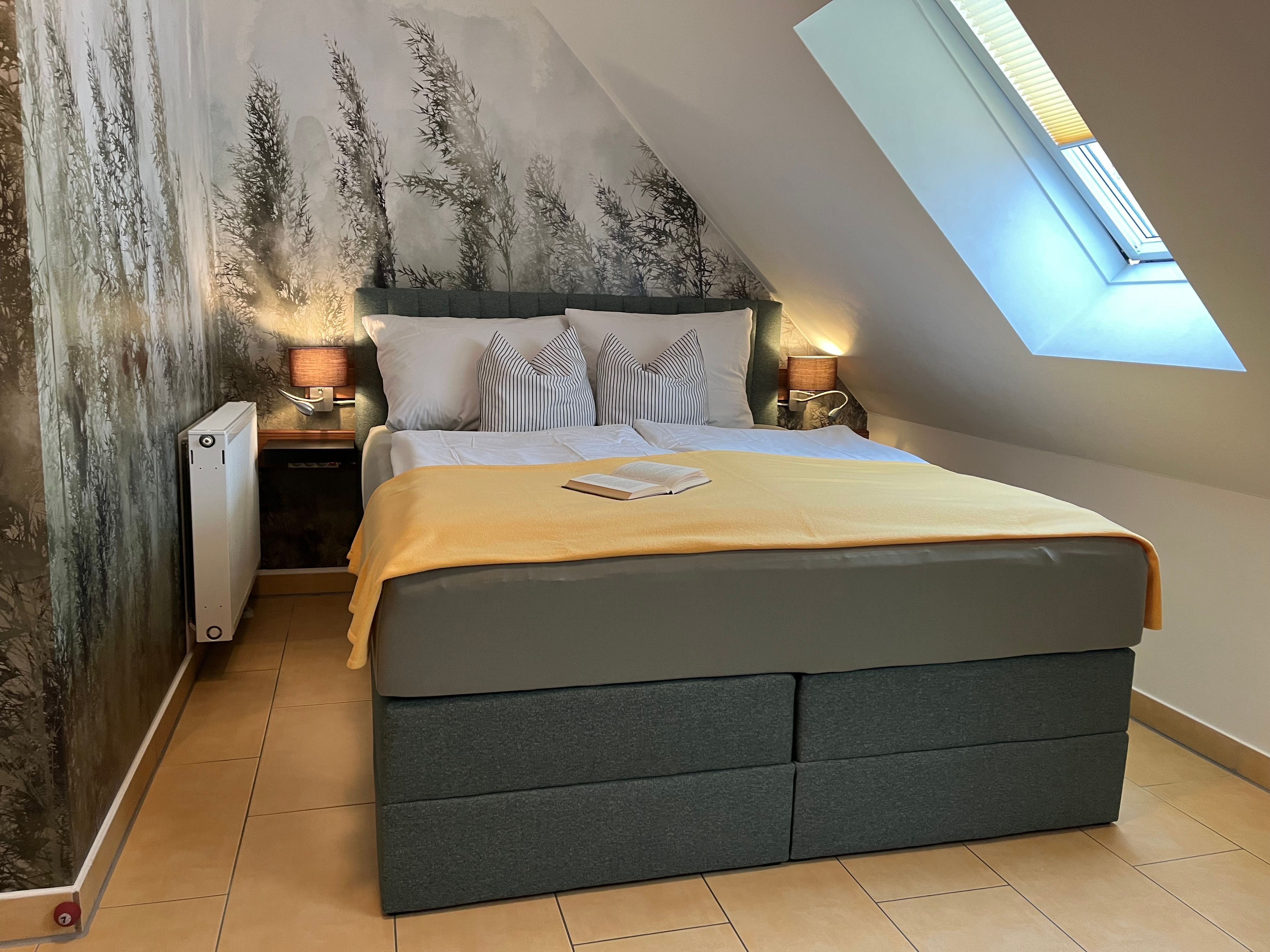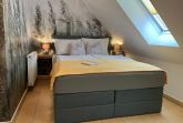 • Im Obergeschoss befinden sich zwei Schlafräume mit je 2 Schlafplätzen. Ein Schlafzimmer ist ausgestattet mit Doppelbett, Nachttischen und einem großen Kleiderschrank. Der andere Schlafraum verfügt über zwei Einzelbetten, Nachttische, Schreibtisch und einen Kleiderschrank.