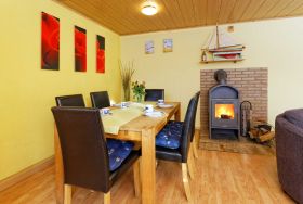 3-Zimmer-Ferienhaus, Größe: 71 qm bis 5 Personen, 2 Schlafzimmer, Wohnzimmer mit 1,2,3 Sitzer seperater Küche (Kühlschrank/Gefrierfach, Spülmaschine, Kaffeemaschine, Toaster, Wasserkocher, 2 Platten-Herd , Mikrowelle) , Spielkonsolen (Wii-Konsole, PS2), Farb Sat TV, DVD, Radio, Bad mit WC und Dusche, Haartrockner, Kamin.