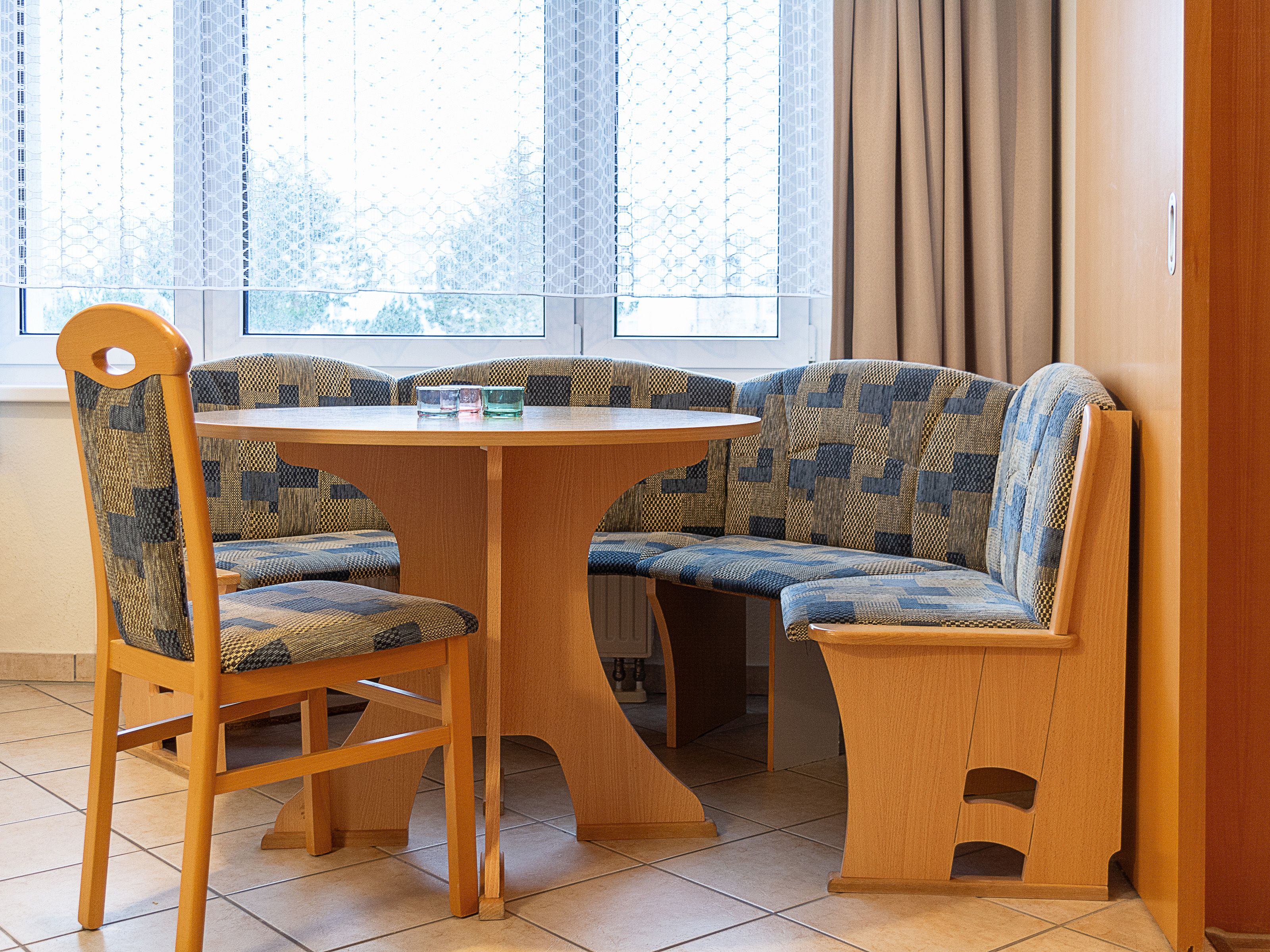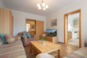 Der gemütliche Wohnraum ist ausgestattet mit einer Wohnlandschaft und einem 43-Zoll-Flachbild-TV. Die separate großzügig gestaltetet Küche mit einem gemütlichen Essbereich hält für Sie alle wichtigen Küchengeräte und -utensilien bereit, die Sie für Ihr perfektes Dinner benötigen: Ein 4-Zonen-Cerankochfeld mit Dunstabzug, ein Backofen, Kühlschrank mit Gefrierfach, ein Geschirrspüler sowie Mikrowelle befinden sich in der Küche. Eine Kaffeemaschine, ein Wasserkocher und ein Toaster sowie genügend Koch- und Essgeschirr vervollständigen die Kücheneinrichtung.