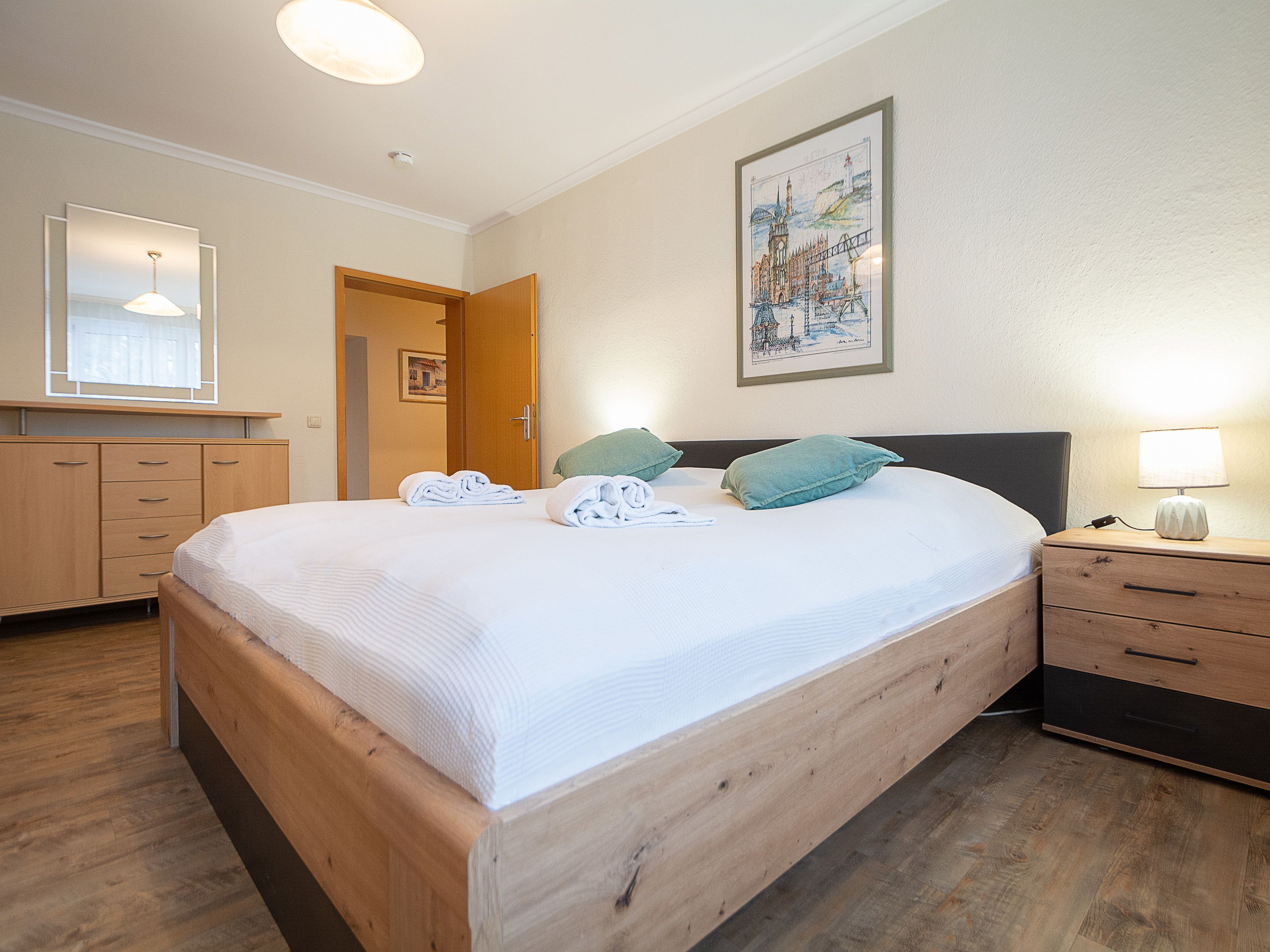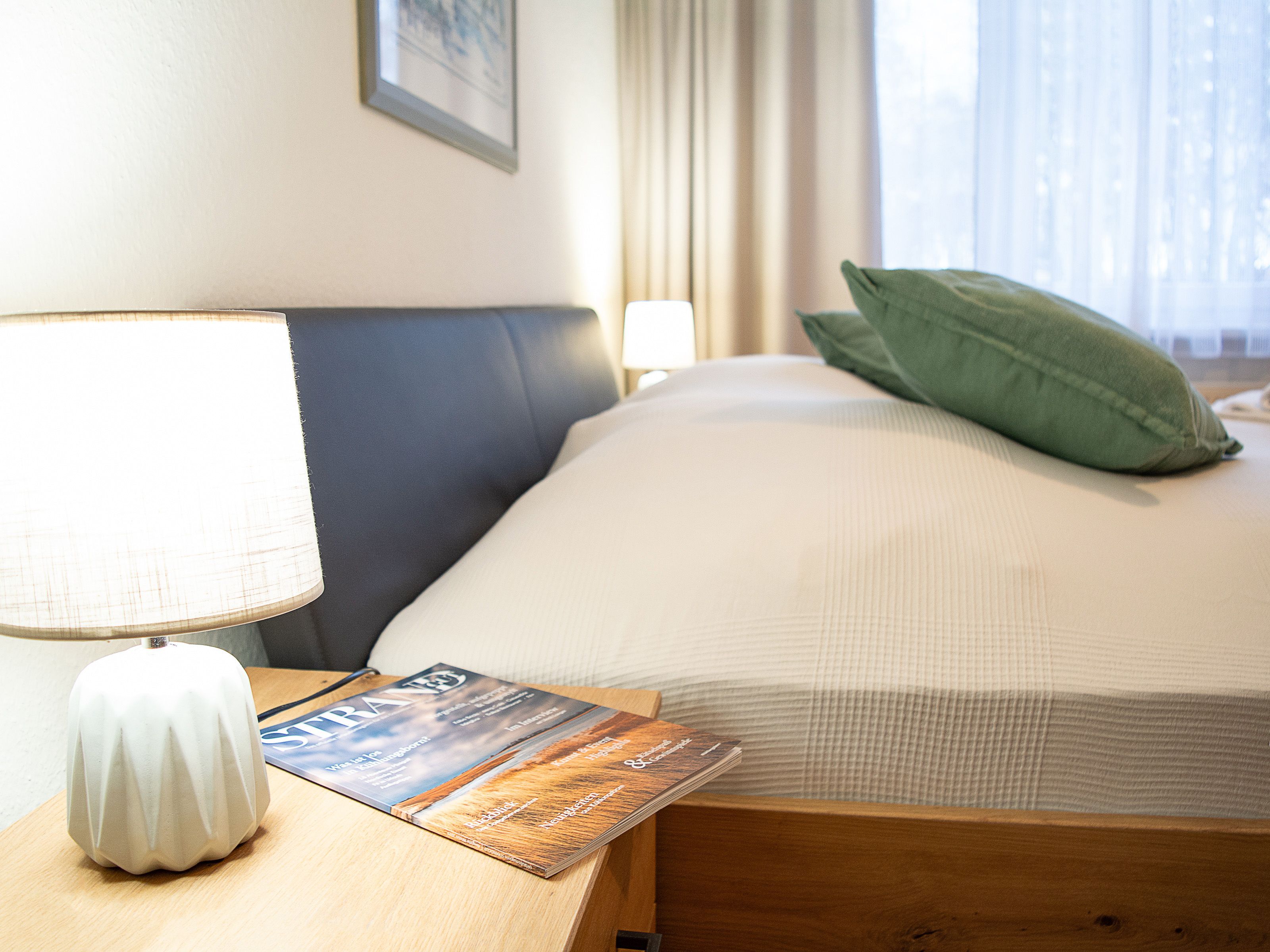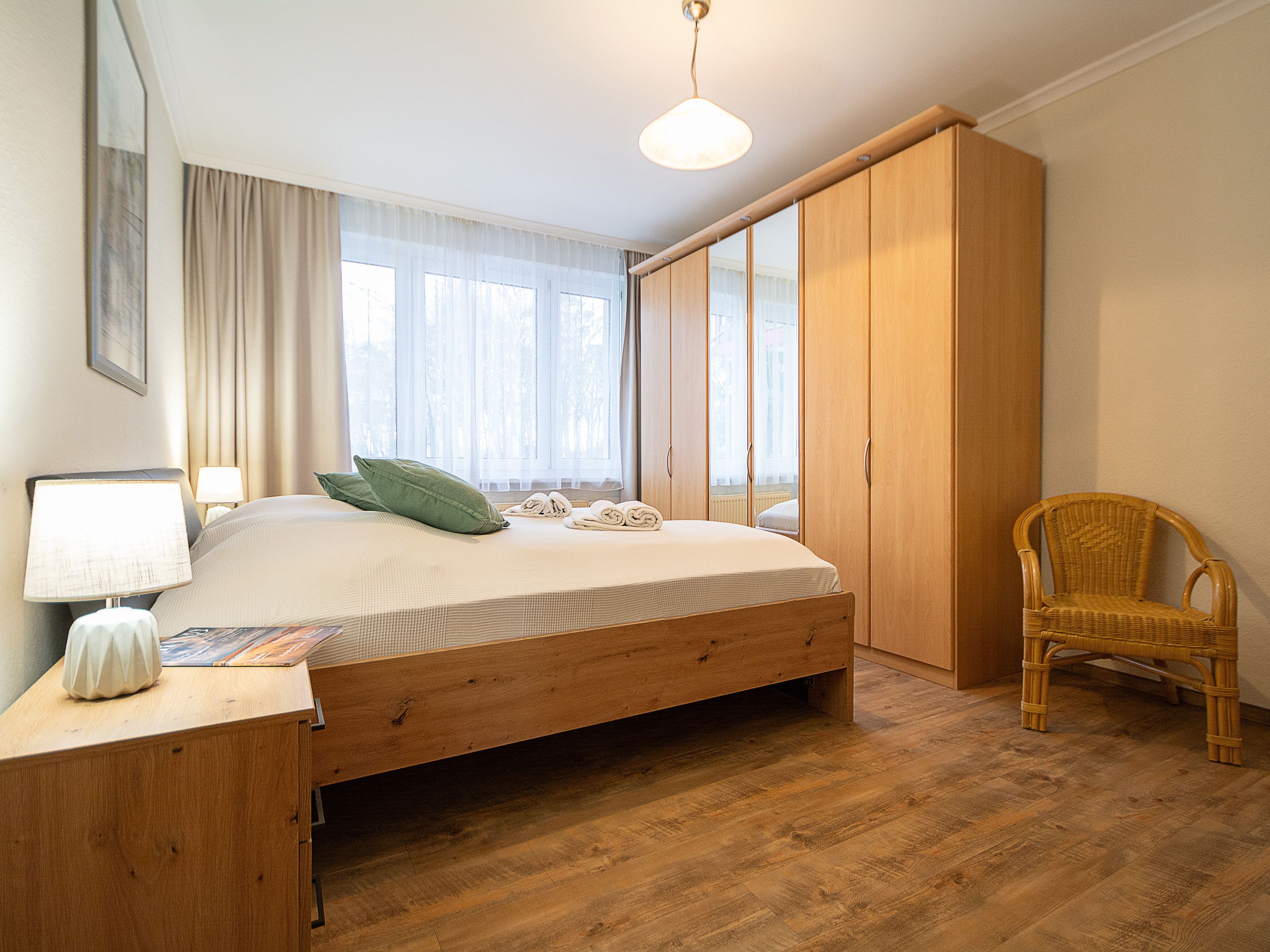 Im ersten Schlafzimmer lädt Sie ein komfortables Doppelbett (2 x 90 x 200 cm) zur Nachtruhe ein. Der großzügige Kleiderschrank mit Ganzkörperspiegel bietet genügend Platz für Ihre Urlaubsgarderobe. Das zweite Schlafzimmer besteht aus zwei getrennt hintereinander stehenden Schlafcouchen, die jeweils auf eine Breite von 140cm ausgezogen werden können. Hier befindet sich auch ein weiteres TV-Gerät (42 Zoll). Vom zweiten Schlafraum können Sie die möblierte Ost-Terrasse betreten, die zum leckeren Frühstück in der Morgensonne einlädt. Als Sichtschutz bzw. zum Verdunkeln sind in beiden Schlafzimmern und im Gardinen und Vorhänge an den Fenstern angebracht.