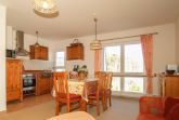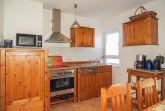 Der gemütliche Wohnbereich in der unteren Etage ist mit einer gemütlichen Couchgarnitur (Schlafcouch) sowie einem 39-Zoll Flatscreen-TV und einer Musikanlage eingerichtet. Der angrenzende Essbereich bietet Ihnen reichlich Platz für gemeinsame Mahlzeiten. Die offene Küchenzeile aus rustikalen Kiefernholz hält für Sie alle wichtigen Küchengeräte und -utensilien bereit, die Sie für Ihr perfektes Dinner benötigen: Ein 4-Zonen-Cerankochfeld mit Dunstabzug, ein Backofen, eine Mikrowelle, ein Geschirrspüler sowie ein Kühlschrank mit Gefrierfach befinden sich in der Küche. Eine Kaffeemaschine, ein Wasserkocher und ein Toaster sowie genügend Koch- und Essgeschirr vervollständigen die Kücheneinrichtung.