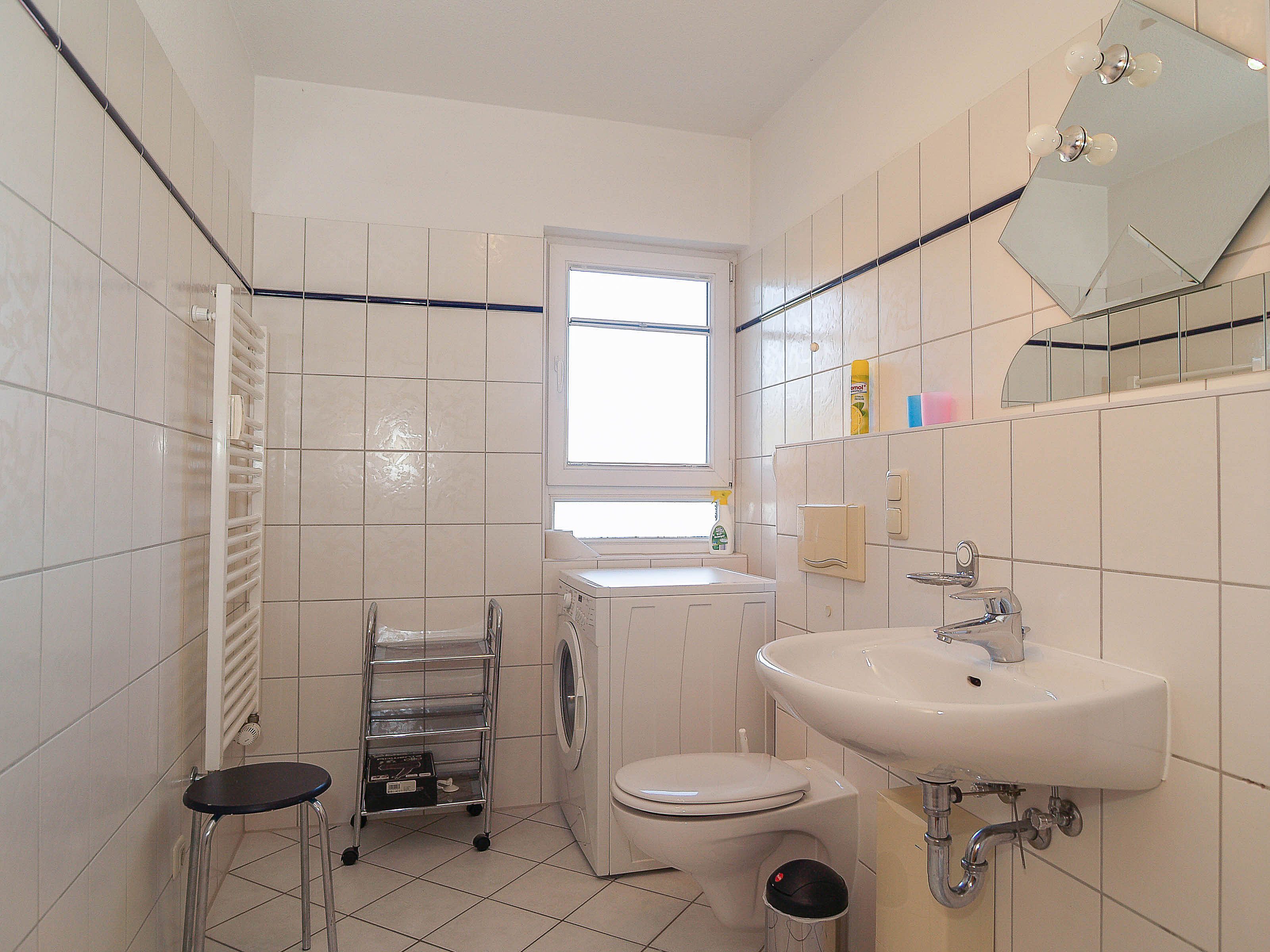 Das geflieste Tageslichtbad ist ausgestattet mit einer Dusche, Waschbecken, WC und einer Waschmaschine. Ein Handtuchheizkörper sorgt für kuschelig warme Handtücher.