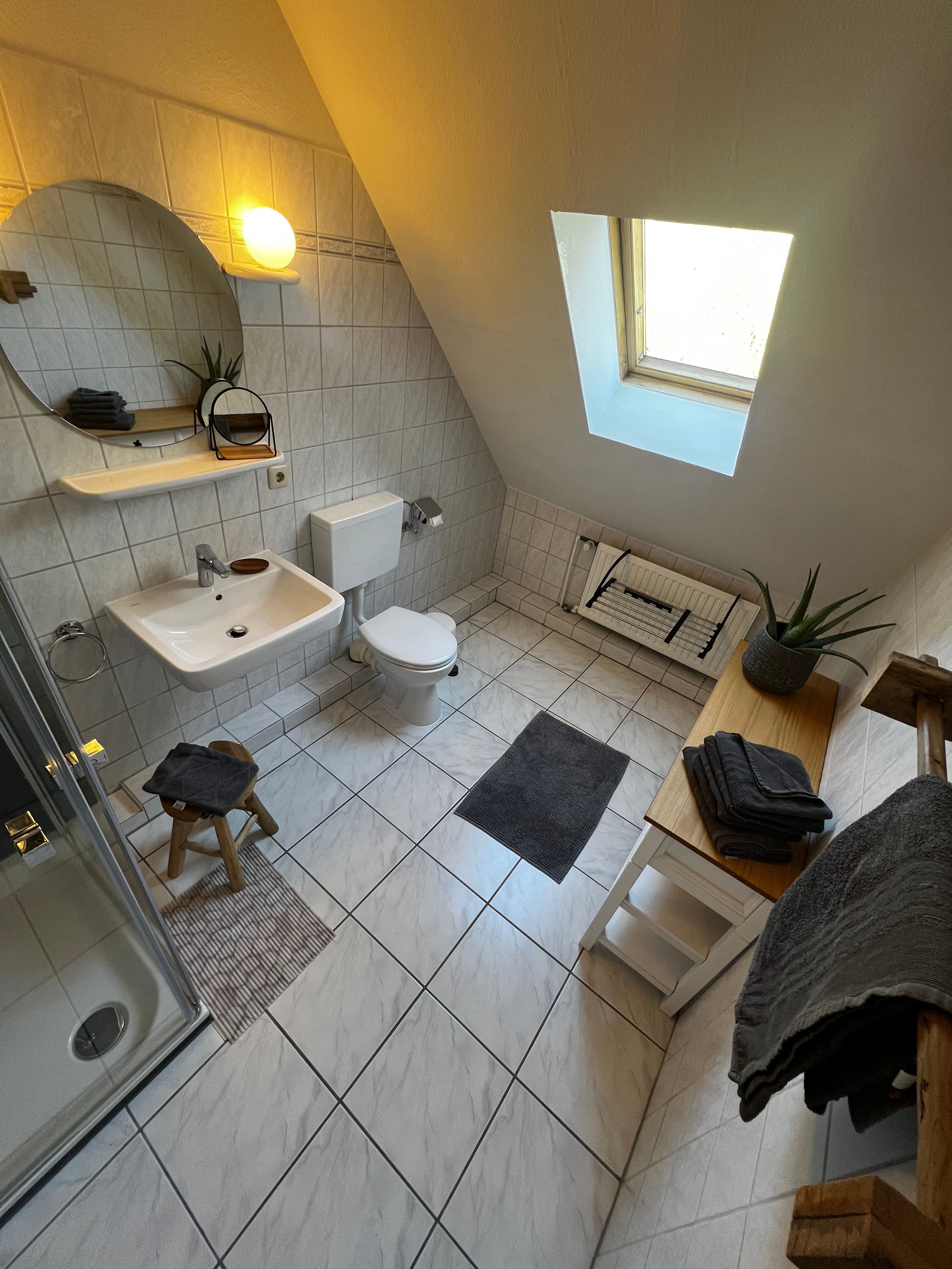 Das geräumige Bad mit Dusche/WC bietet durch das kleine Dachfenster einen