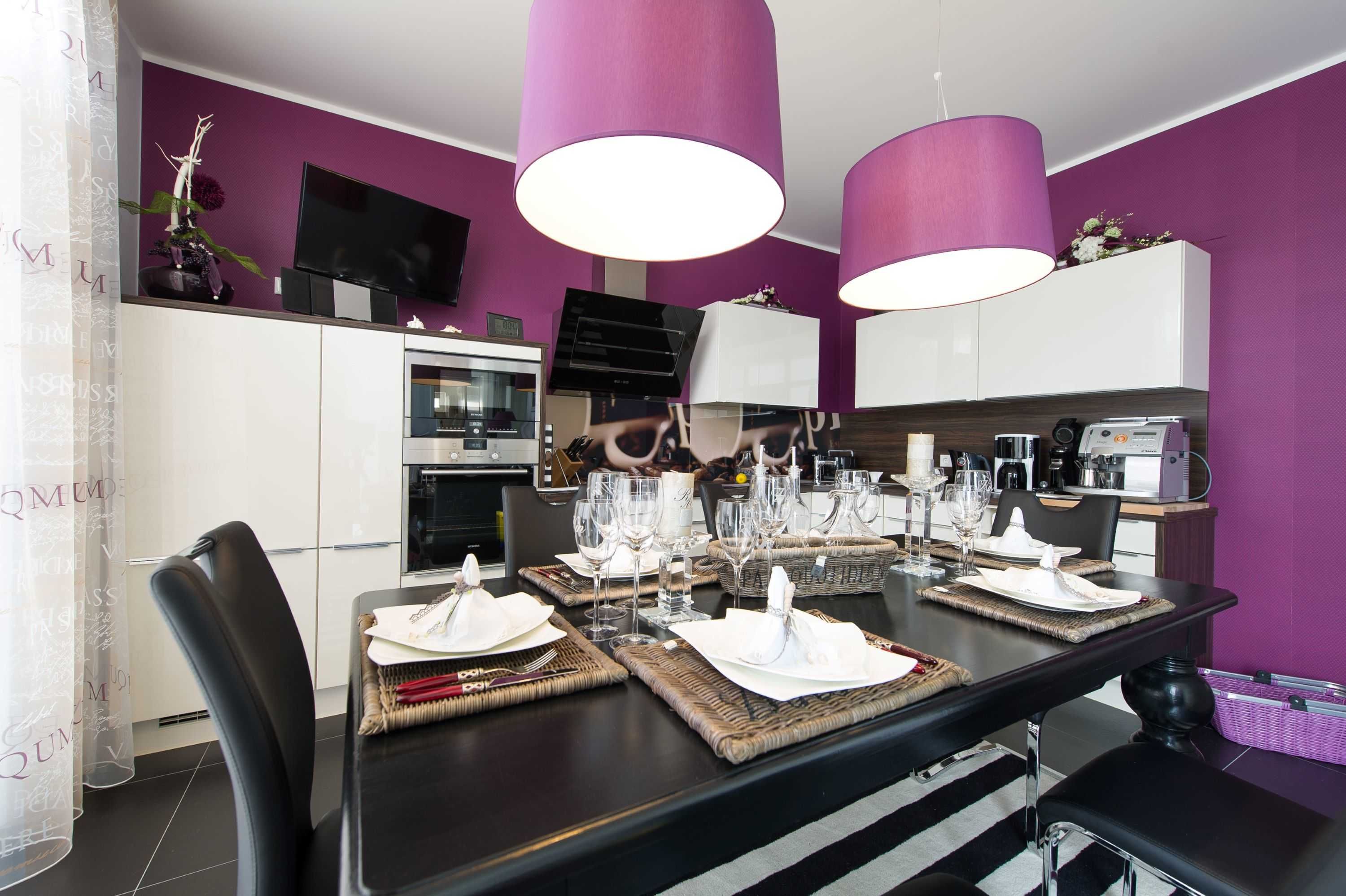 • Einbauküche mit Esstisch für 6 Personen, Geschirrspüler, Elektroherd, Kühlschrank mit Gefrierfach, Kaffeemaschine, Toaster und Wasserkocher