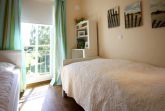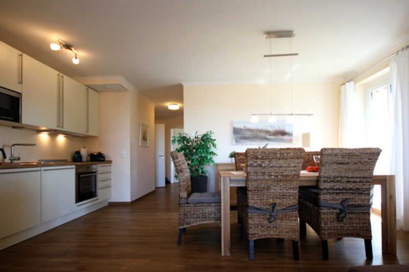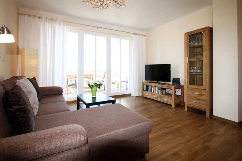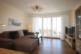 Die freundliche Drei-Zimmer-Wohnung befindet sich im ersten Obergeschoss. Auf dem großzügigen, nach Nordwesten ausgerichteten Balkon mit kleinem Meerblick lässt sich die Nachmittags- und Sonnenuntergangstimmung perfekt genießen. Das im Landhausstil eingerichtete Schlafzimmer empfängt Sie mit einem großen Doppelbett und einem dreitürigen, geräumigen Schrank. Im zweiten Schlafzimmer befinden sich zwei Einzelbetten sowie ein kleiner Schrank. Ein Babyreisebett steht kostenfrei zur Verfügung. Beide Duschbäder berfügen über eine bodengleiche Dusche und einen großen Waschtisch mit passendem Spiegel. Im Wohnraum bietet sich die große, L-förmige Schlafcouch zum Relaxen an. Zur Unterhaltung steht Ihnen ein großer TV-Flachbildschirm zur Verfügung. Im angrenzenden offenen Koch- und Essbereich befindet sich die Einbauküche mit Geschirrspüler, Kühlschrank mit Gefrierfach, Backofen mit Cerankochfeld und Mikrowelle sowie diversen Küchenutensilien. Der große Holztisch mit vier gemütlichen Rattan Stühlen lädt zu gemeinsamen Mahlzeiten und Spieleabenden.