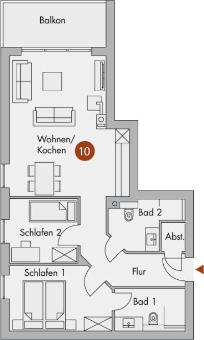 Komfort-Wohnung für fünf Personen mit zwei Schlafräumen und zwei Bädern