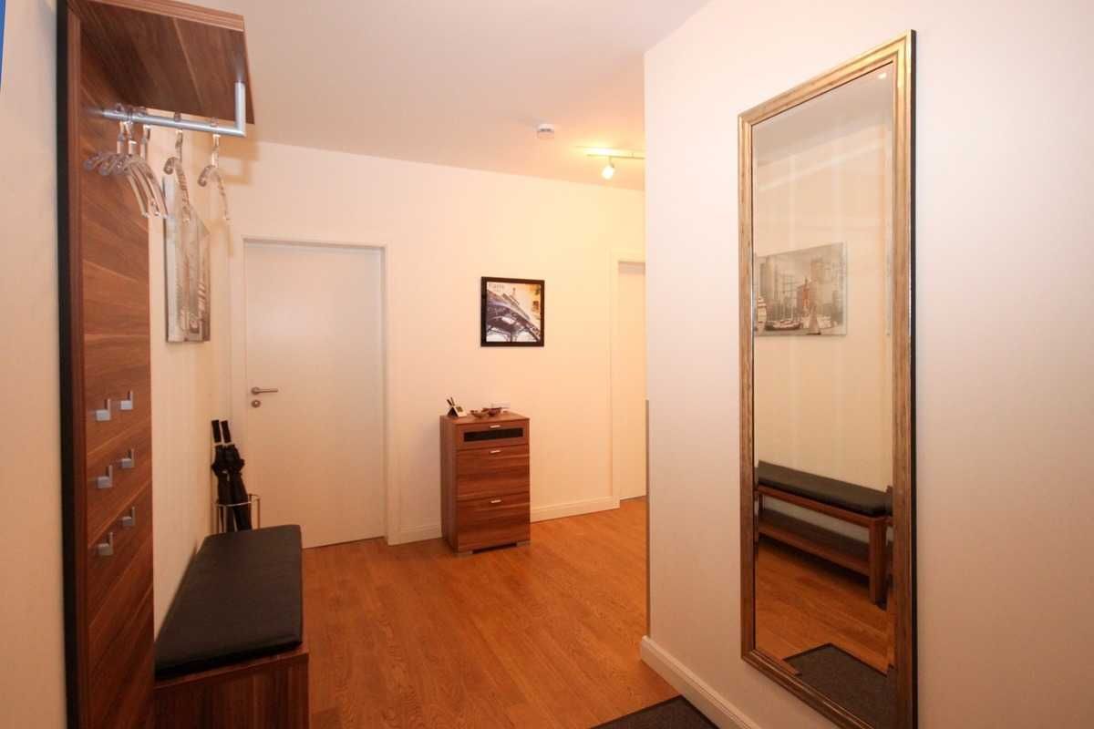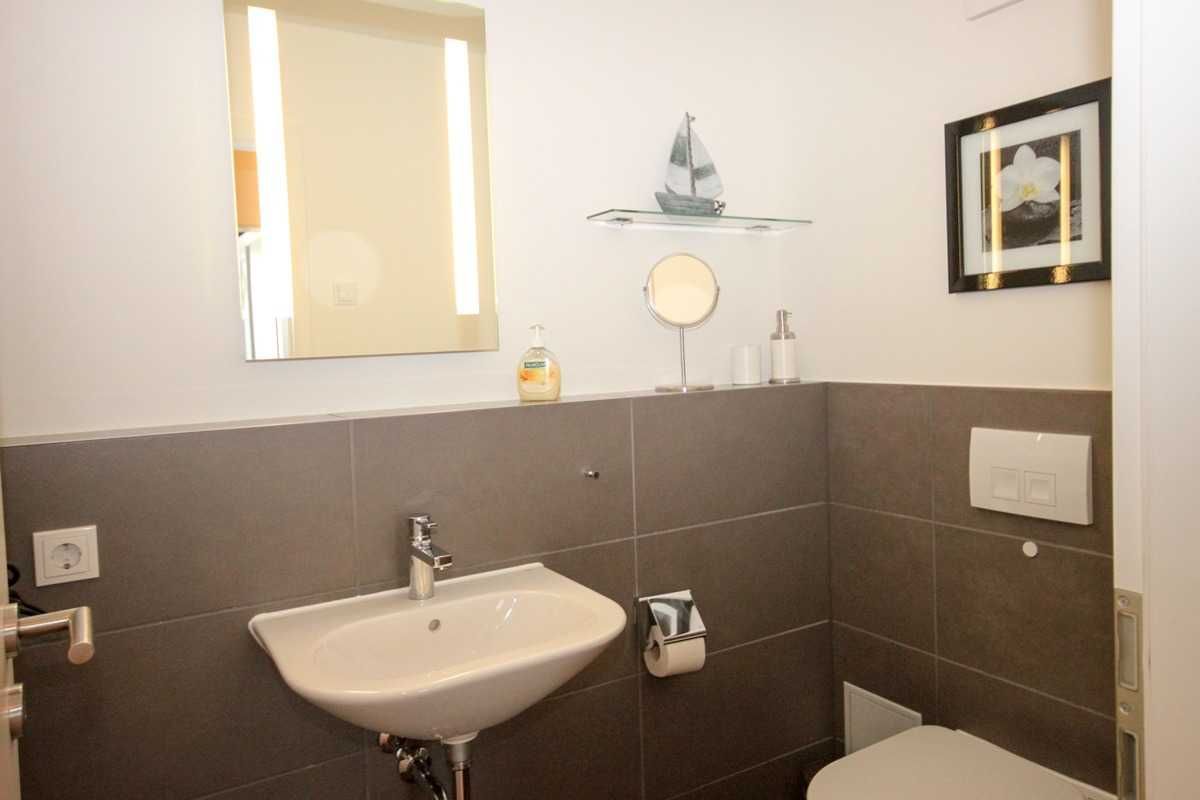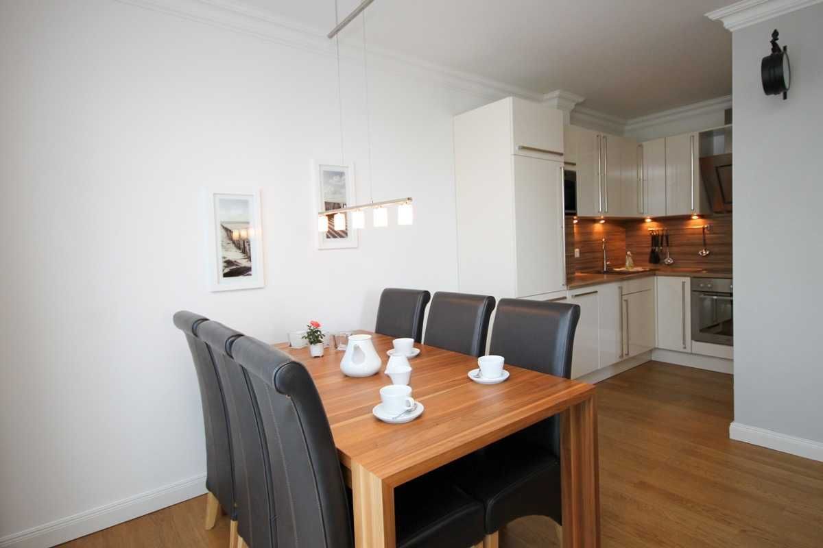 Die geräumige Drei-Zimmer-Wohnung im Erdgeschoss ist für maximal sechs Personen ausgestattet und bietet höchsten Komfort. Das knapp 30 qm große Wohnzimmer ist sehr gemütlich gestaltet und kann neben der Wohnlandschaft mit ausklappbarer Schlafcouch für zwei weitere Personen, einem Flachbildschirm TV, einem DVD-Player, einer Stereoanlage und einem Kaminofen (Kaminholz muss selbst organisiert werden) sowie einer komfortablen Essecke mit sechs Lederstühlen aufwarten. Im Wohn-/Esszimmer befindet sich die hochwertige und voll ausgestattete Einbauküche, die selbstverständlich alle notwendigen elektrischen Geräte, wie Spülmaschine, Kühlschrank, Mikrowelle, Ceranfeld und Backofen beinhaltet. Es ist alles vorhanden was das Herz eines Koches höher schlagen lassen würde. Neben den zwei Schlafzimmern mit gemütlichen Doppelbetten und großzügigen Kleiderschränken ist die Wohnung mit einem Bad mit ebenerdiger Dusche ausgestattet. Außerdem verfügt die Ferienwohnung über einen äußerst großzügigen Flur von über 15 qm, einen kleinen Abstellraum mit separatem Wäscheständer sowie im Außenbereich über zwei überdachte Terrassen mit Gartenmöbeln und kleiner Rasenfläche.