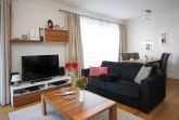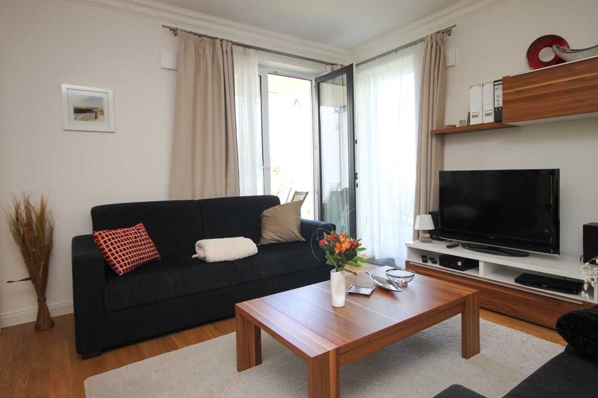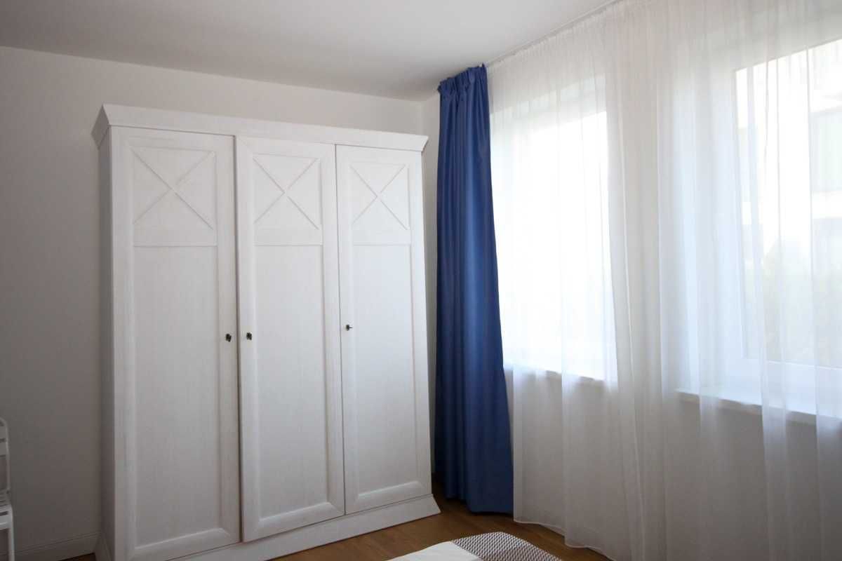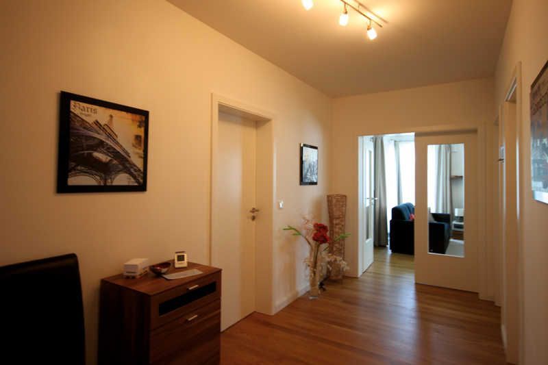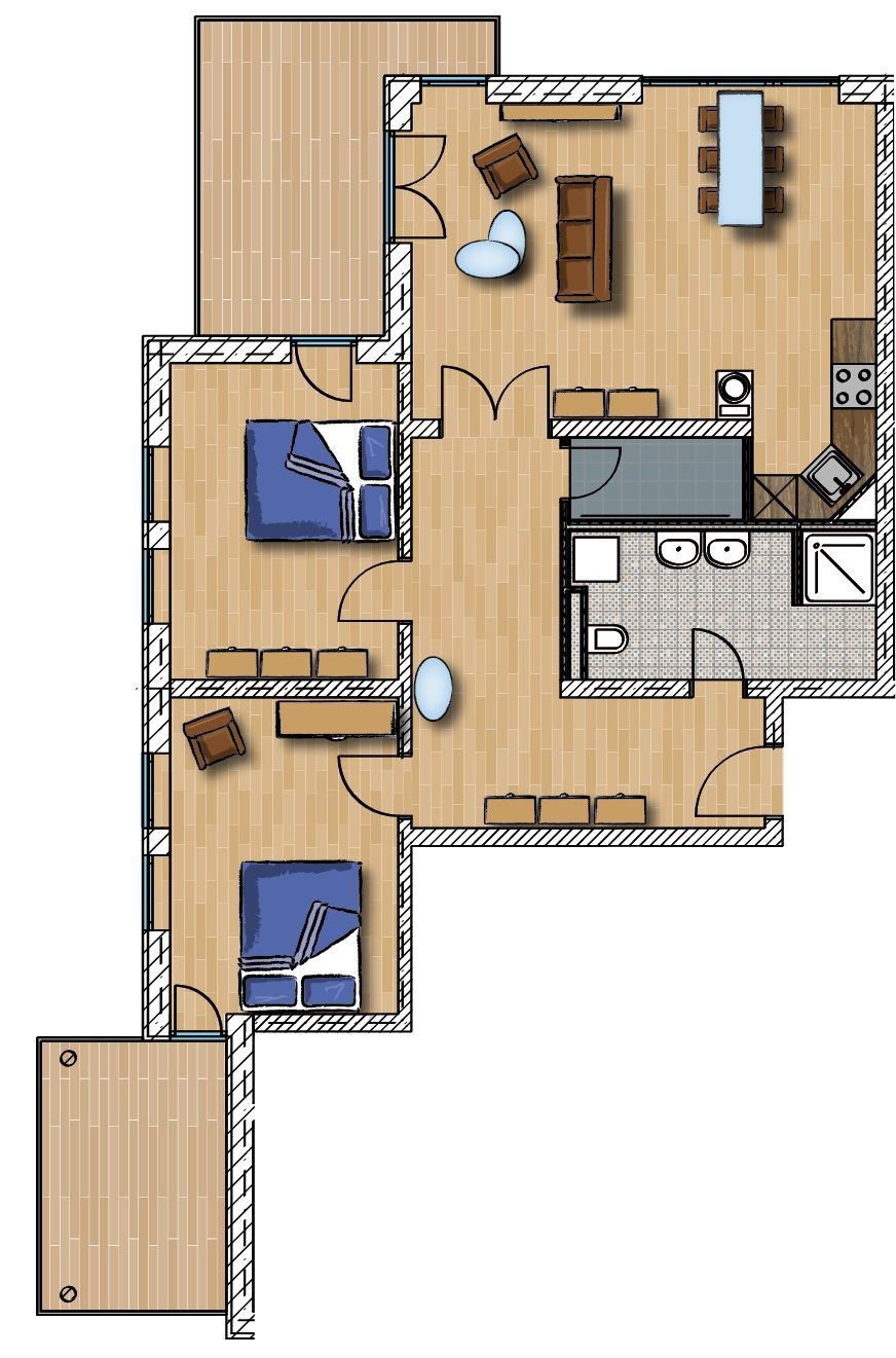 Die geräumige Drei-Zimmer-Wohnung im Erdgeschoss ist für maximal sechs Personen ausgestattet und bietet höchsten Komfort. Das knapp 30 qm große Wohnzimmer ist sehr gemütlich gestaltet und kann neben der Wohnlandschaft mit ausklappbarer Schlafcouch für zwei weitere Personen, einem Flachbildschirm TV, einem DVD-Player, einer Stereoanlage und einem Kaminofen (Kaminholz muss selbst organisiert werden) sowie einer komfortablen Essecke mit sechs Lederstühlen aufwarten. Im Wohn-/Esszimmer befindet sich die hochwertige und voll ausgestattete Einbauküche, die selbstverständlich alle notwendigen elektrischen Geräte, wie Spülmaschine, Kühlschrank, Mikrowelle, Ceranfeld und Backofen beinhaltet. Es ist alles vorhanden was das Herz eines Koches höher schlagen lassen würde. Neben den zwei Schlafzimmern mit gemütlichen Doppelbetten und großzügigen Kleiderschränken ist die Wohnung mit einem Bad mit ebenerdiger Dusche ausgestattet. Außerdem verfügt die Ferienwohnung über einen äußerst großzügigen Flur von über 15 qm, einen kleinen Abstellraum mit separatem Wäscheständer sowie im Außenbereich über zwei überdachte Terrassen mit Gartenmöbeln und kleiner Rasenfläche.