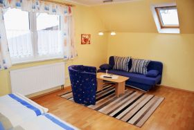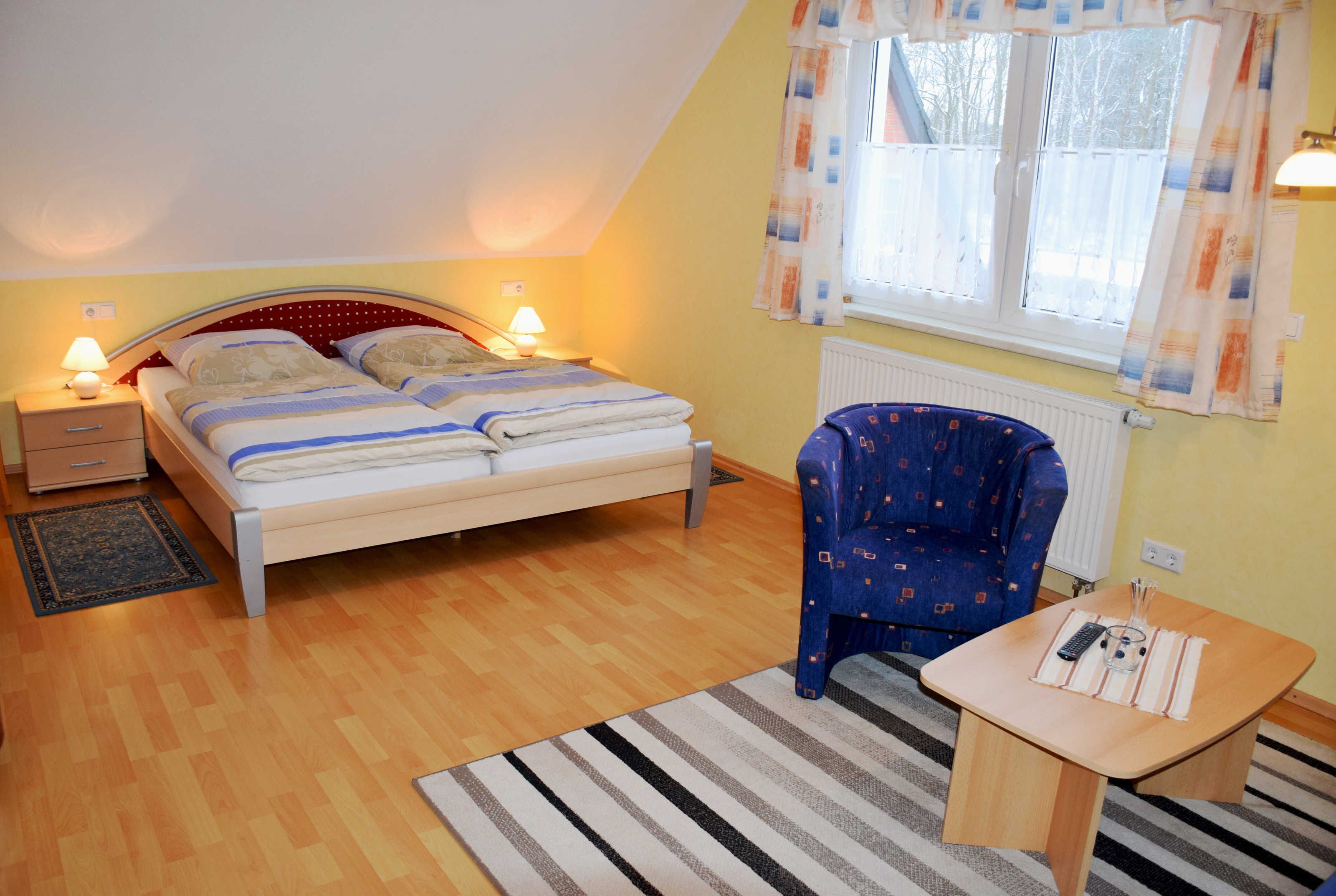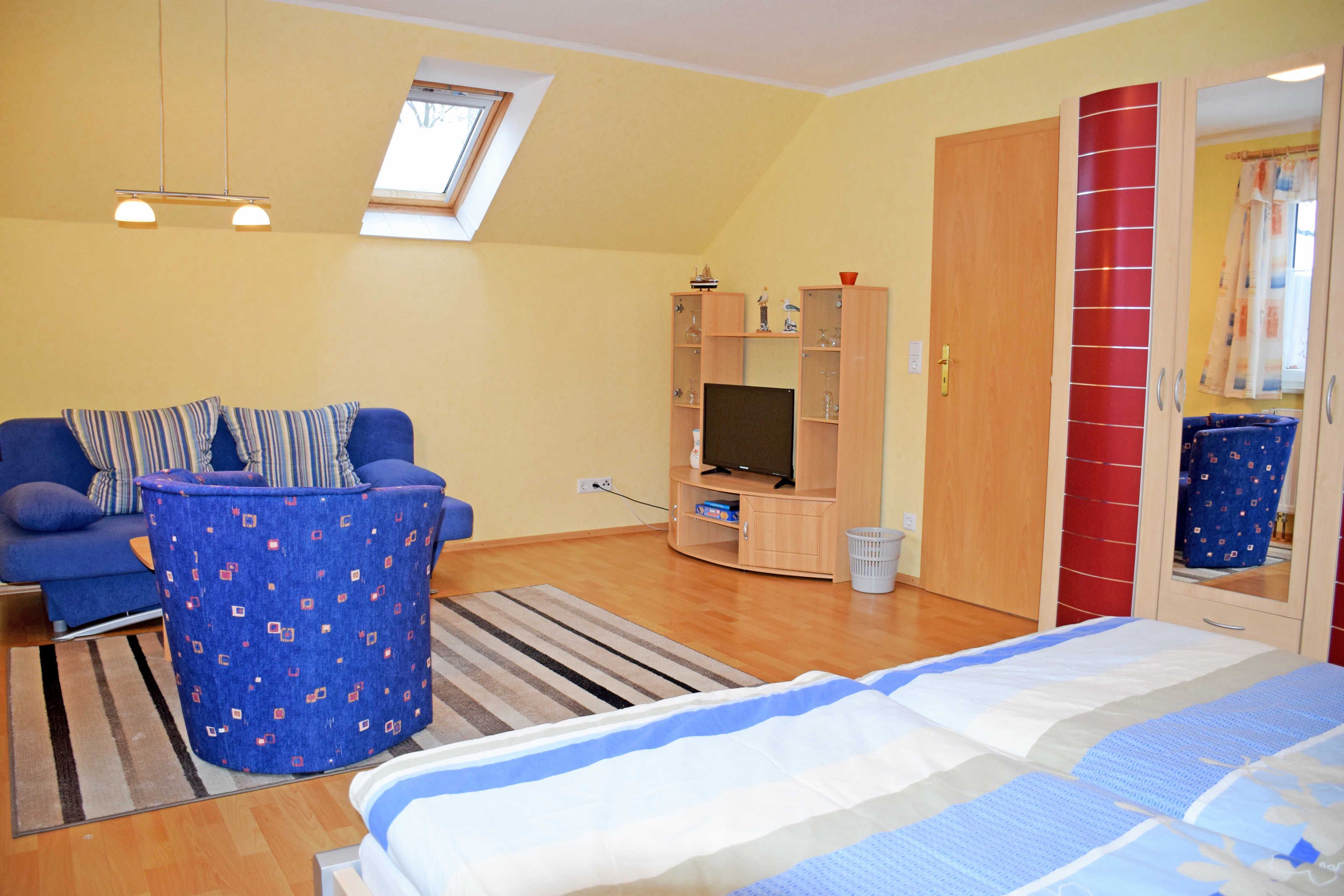 Im hellen und großen Wohn-Schlafzimmer befinden sich eine bequeme Sitzcouch mit Tisch und ein modernes TV-Gerät sowie ein Doppelbett mit Leselampe. Die separate Küche ist mit einem Herd, Wasserkocher, Kaffeemaschine, Toaster und Kühlschrank komplett ausgestattet. Für einen dritten Gast von 4 bis 16 Jahren kann die Couch im Wohnbereich aufgebettet werden. Bei Ihrer Anreise sind für Sie die Betten bereits mit Bettwäsche aufbezogen, Handtücher bitten wir Sie mitzubringen.