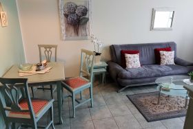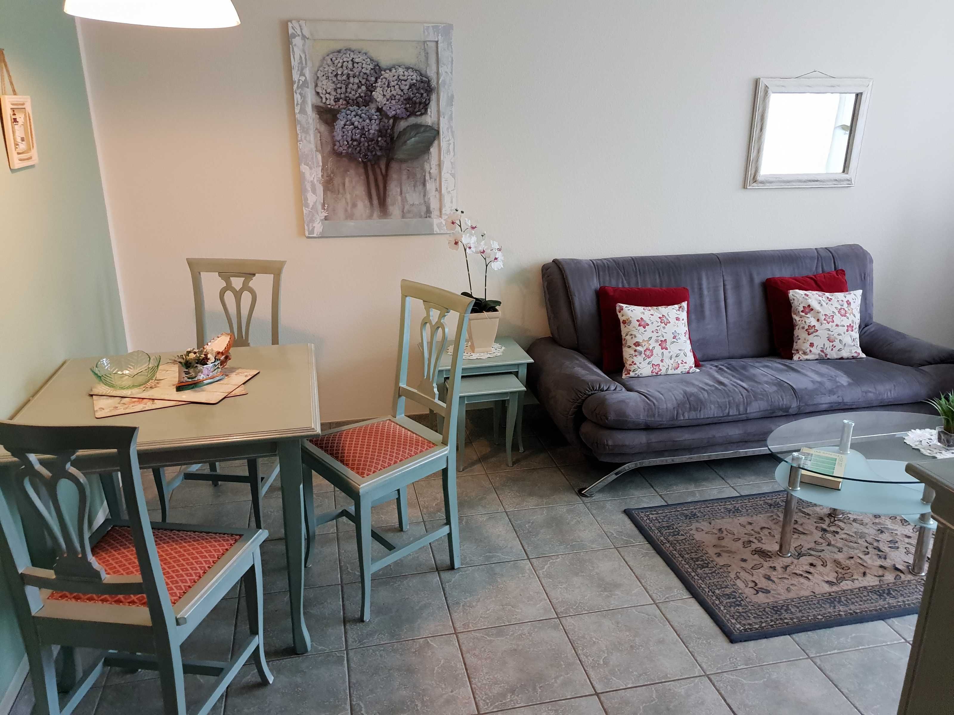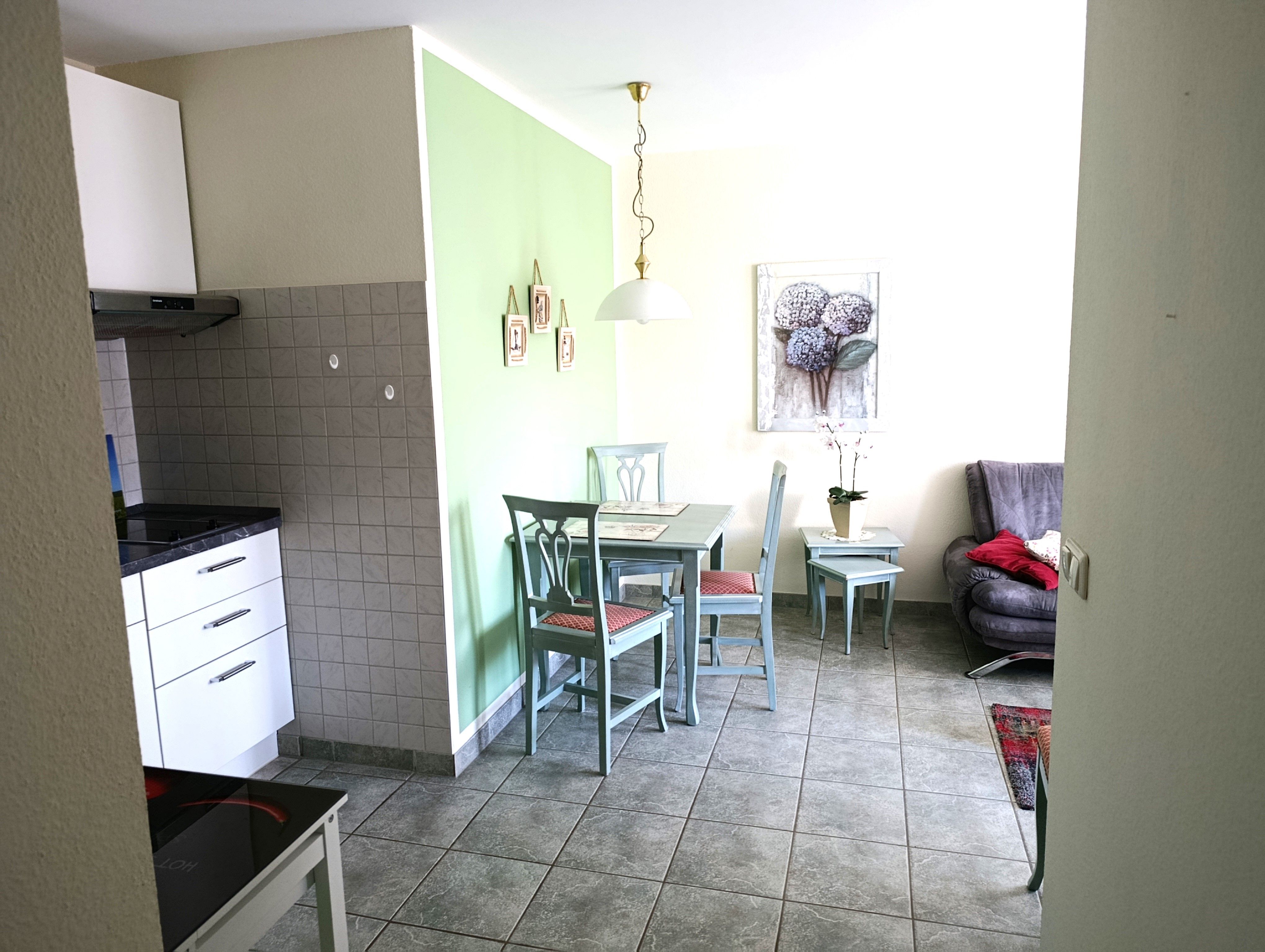 Die funktional gestaltete Ferienwohnung im Erdgeschoss hat einen offenen Wohnbereich mit Küchenzeile und Essbereich, ein Schlafzimmer mit Doppelbett, ein Gästezimmer mit Bett (Bett mit Ausziehfunktion) und eine Terrasse. Die funktionale Küchenzeile ist mit 2-Platten-Ceranfeld, Kühlschrank mit Gefrierfach, Mikrowelle, Kaffeemaschine, Wasserkocher, Toaster und div. Geschirr ausgestattet. Ein Bad mit Dusche, Waschbecken und WC komplettieren den guten Gesamteindruck der Wohnung.