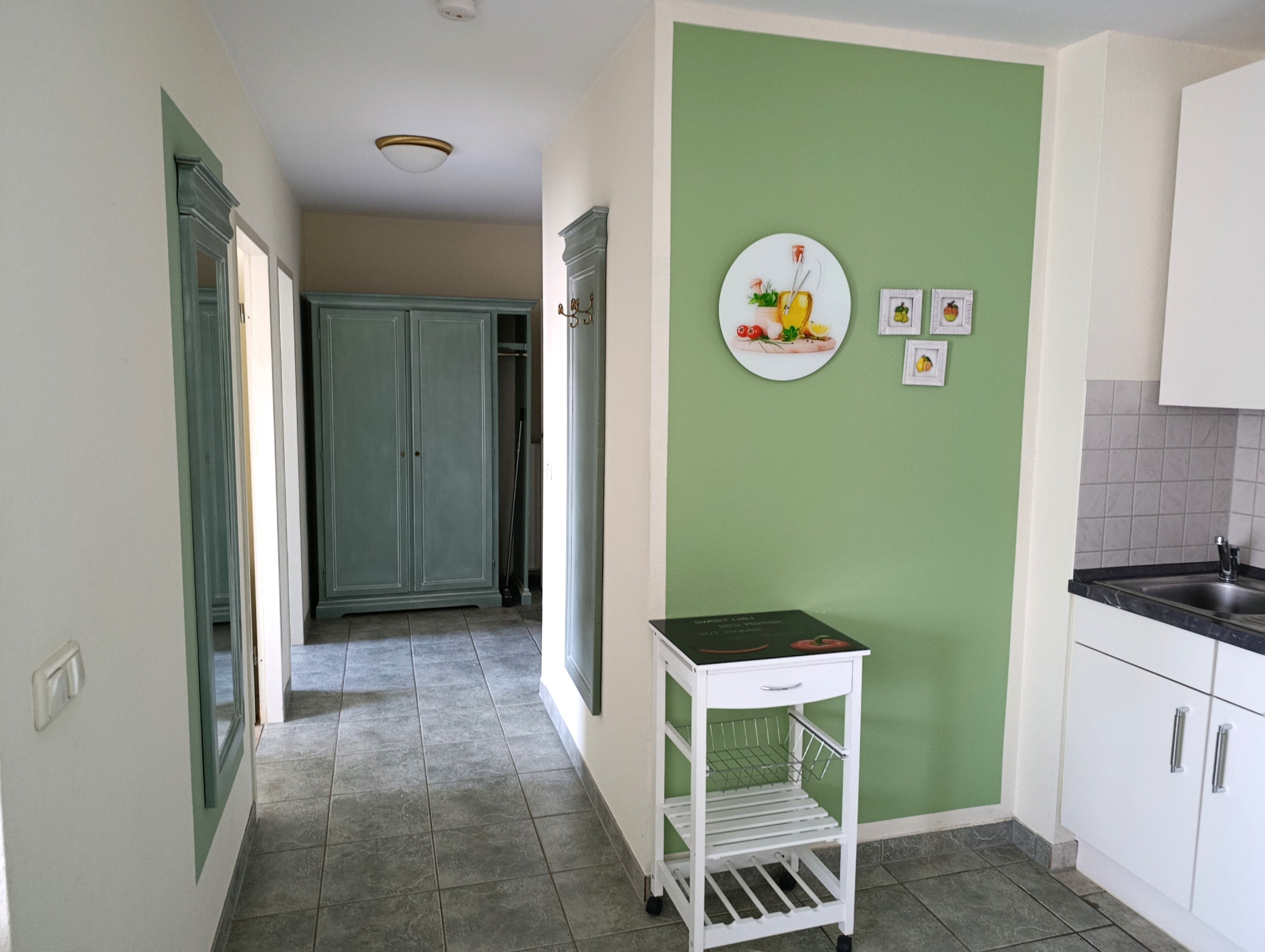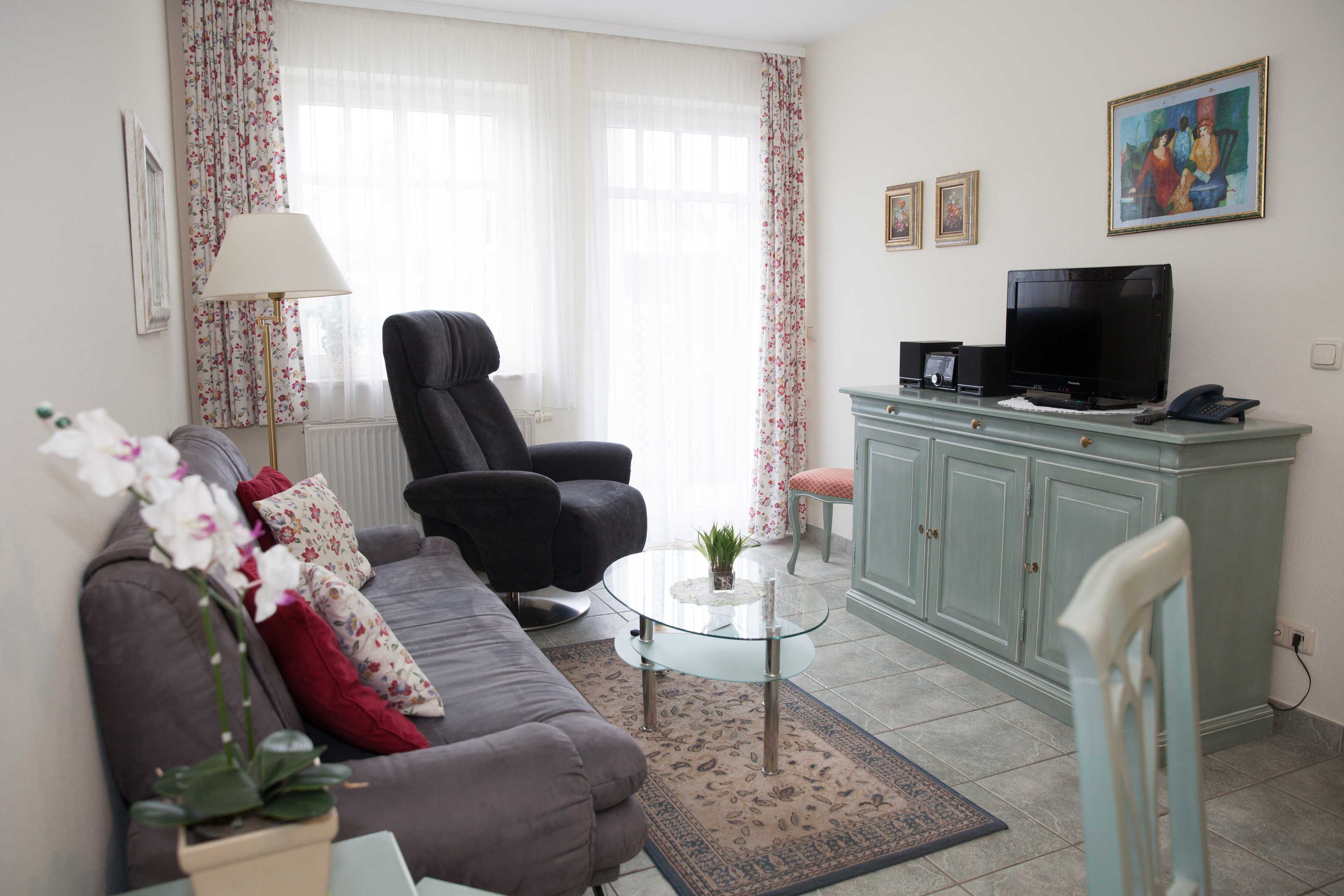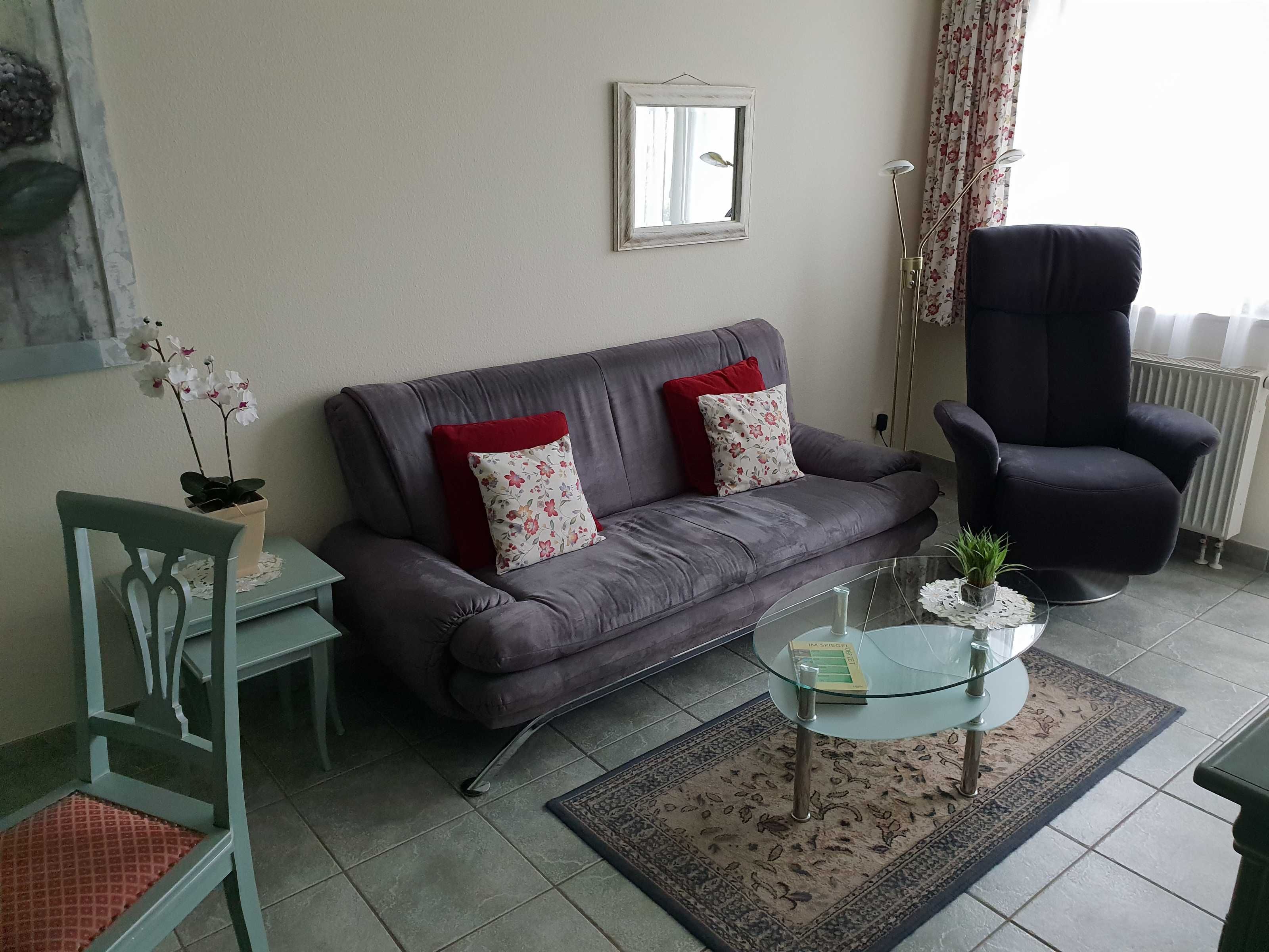 Nur 150 m vom Strand wohnen Sie in einer 3-Raum-Ferienwohnung. Die 42 qm große Wohnung liegt im Erdgeschoss. Das Wohnzimmer ist mit einer Couch, Couchtisch, Sessel, Anrichte, mit Kabel-TV (Flachbildschirm), Radio, Essbereich (Tisch und Stühle) und Küchenzeile ausgestattet. Die Terrasse mit Tisch und Stühle geht zur Westseite. Im Schlafzimmer stehen ein Doppelbett und eine kleine Anrichte und ein TV zur Verfügung. Im Gästezimmer stehen ein Bett mit ausziehfunktion, Nachtschrank und ein kleiner Kleiderschrank. Im Flur steht ein Kleiderschrank und eine Garderobe mit Spiegel. Die Küchenzeile wurde ausgestattet mit Mikrowelle, Kühlschrank, Kaffeemaschine, Zwei-Platten-Kochfeld, Toaster und Wasserkocher. Das Bad mit Dusche und WC komplettiert die Wohnung.
