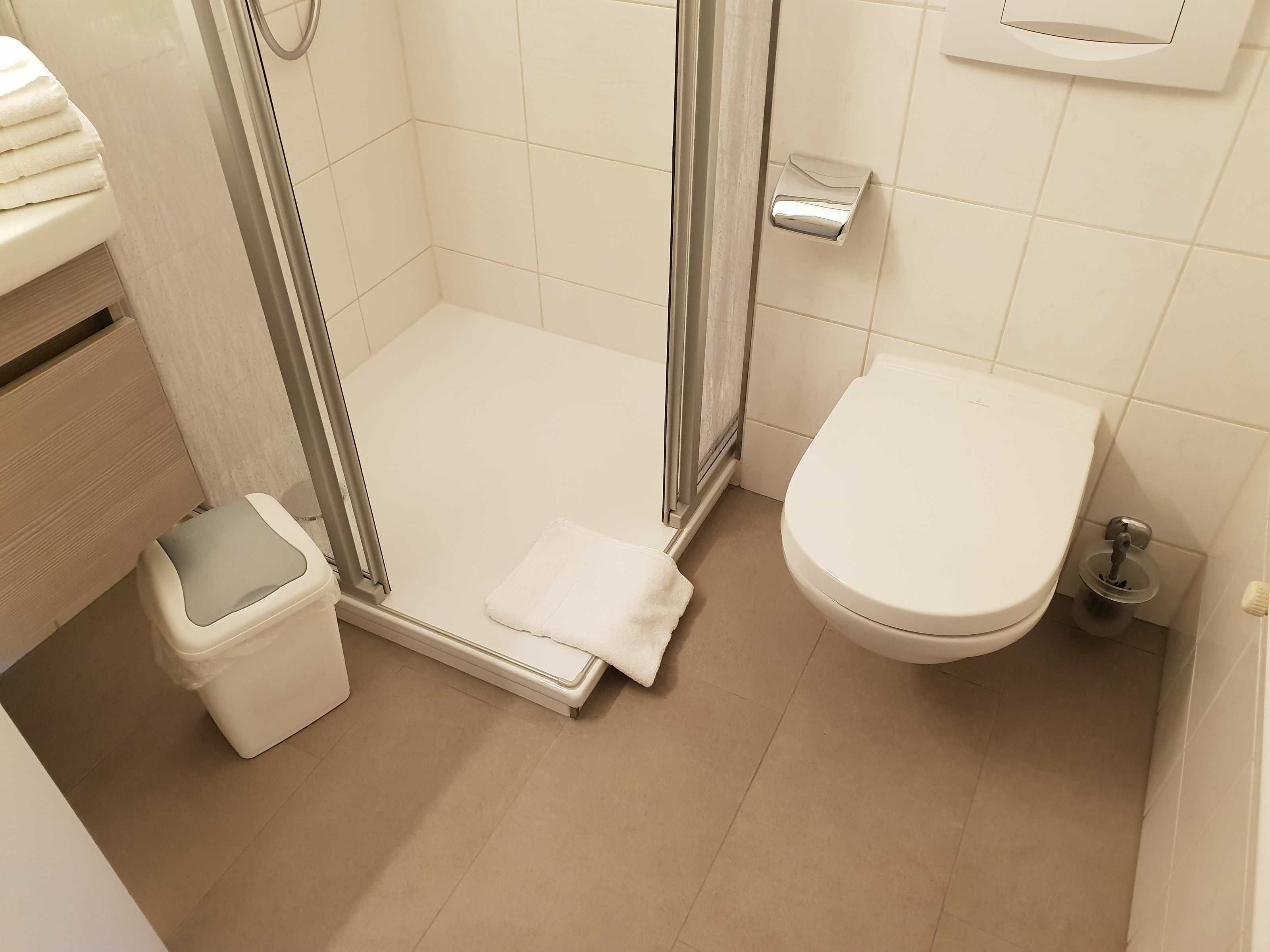 Küchenzeile mit Mikrowelle, Zweiplattenceranfeld, Kühlschrank mit Gefrierfach, Wasserkocher, Toaster und Kaffeemaschine.Badezimmer mit Dusche, WC,Waschbecken, Spiegel und Föhn.
