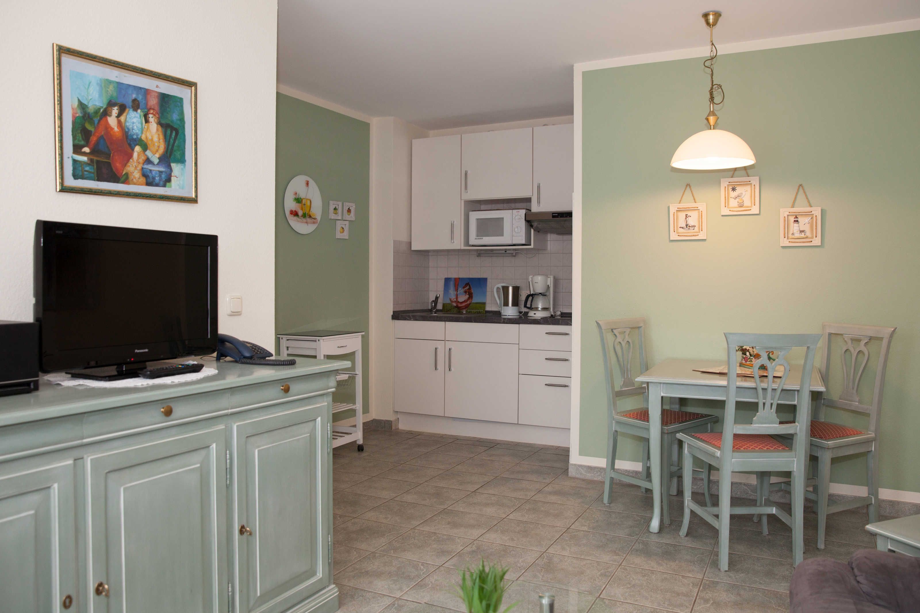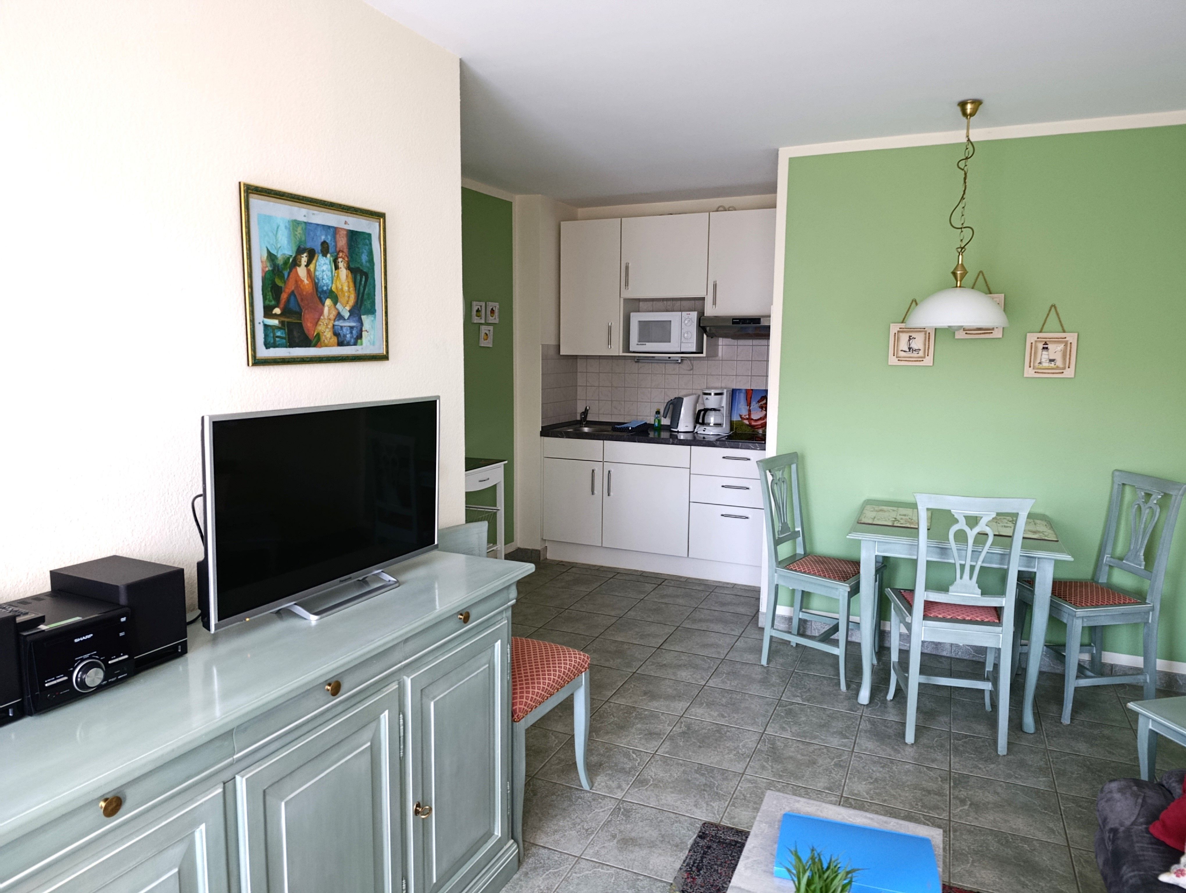Wohnzimmer mit Couch, Esstisch, Küchenzeile, Kabel-TV und Radio.