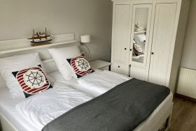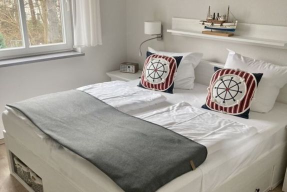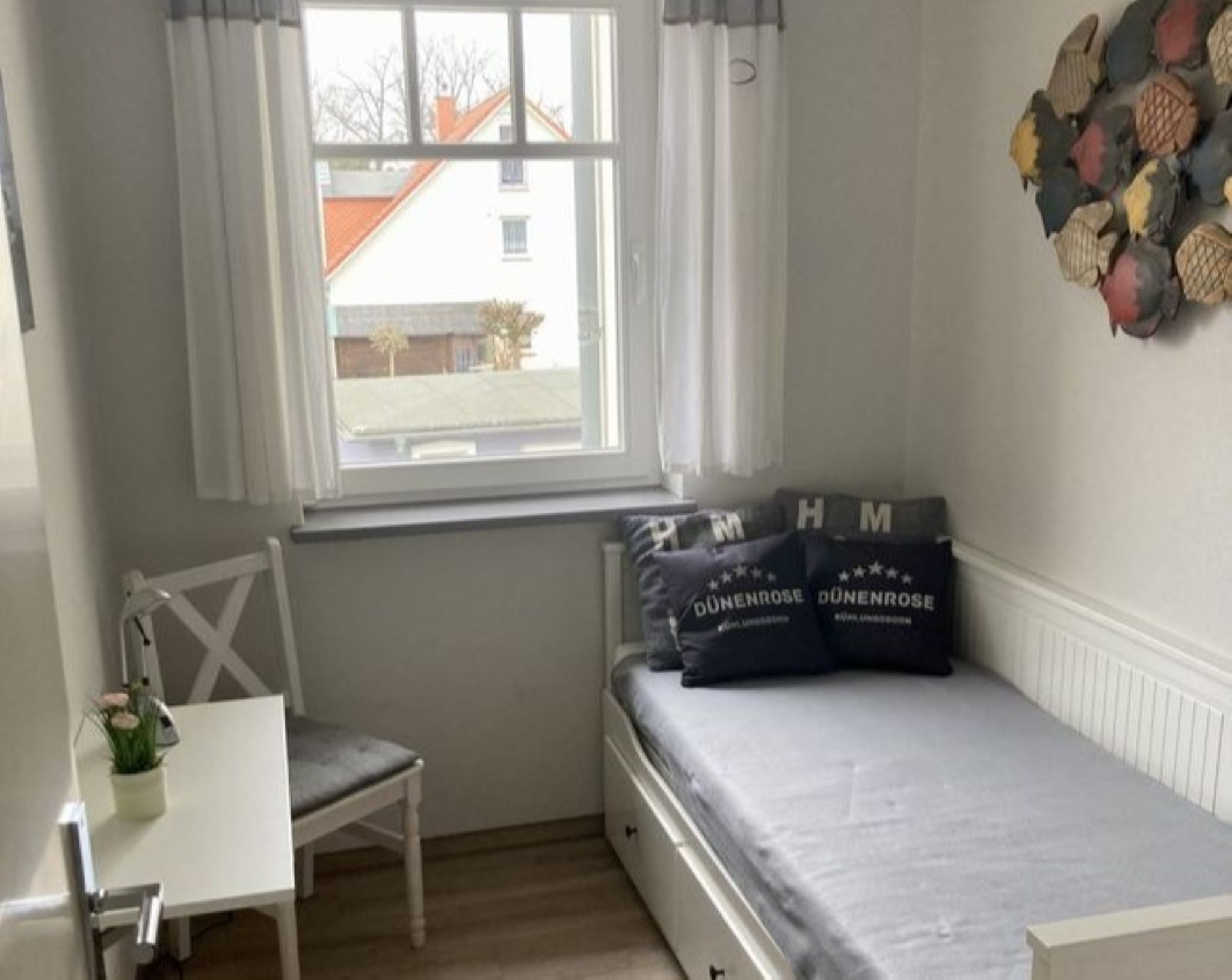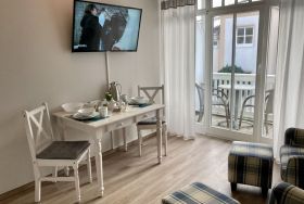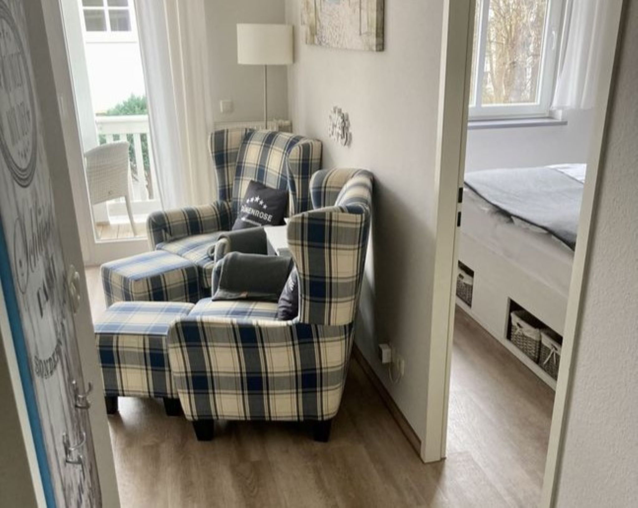 Nur 150 m vom Strand wohnen Sie in einer 3-Raum-Ferienwohnung. Die 34 qm große Wohnung liegt in der ersten Etage. Das Wohnzimmer ist mit einer Couch, Couchtisch, 2 Sessel, Anrichte, mit Kabel-TV (Flachbildschirm), Radio, Essbereich (Tisch und Stühle) und Küchenzeile ausgestattet. Der Balkon mit Tisch und Stühle geht zur Südseite. Im Schlafzimmer stehen ein Doppelbett 2 Nachtschränke, FlachbildTV und ein Kleiderschrank. Im Gästezimmer stehen ein Bett, Nachtschrank und ein kleiner Kleiderschrank. Im Flur ist eine Garderobe. Die Küchenzeile wurde ausgestattet mit Mikrowelle, Kühlschrank, Kaffeemaschine, Zwei-Platten-Kochfeld, Toaster und Wasserkocher. Das Bad mit Dusche und WC komplettiert die Wohnung.