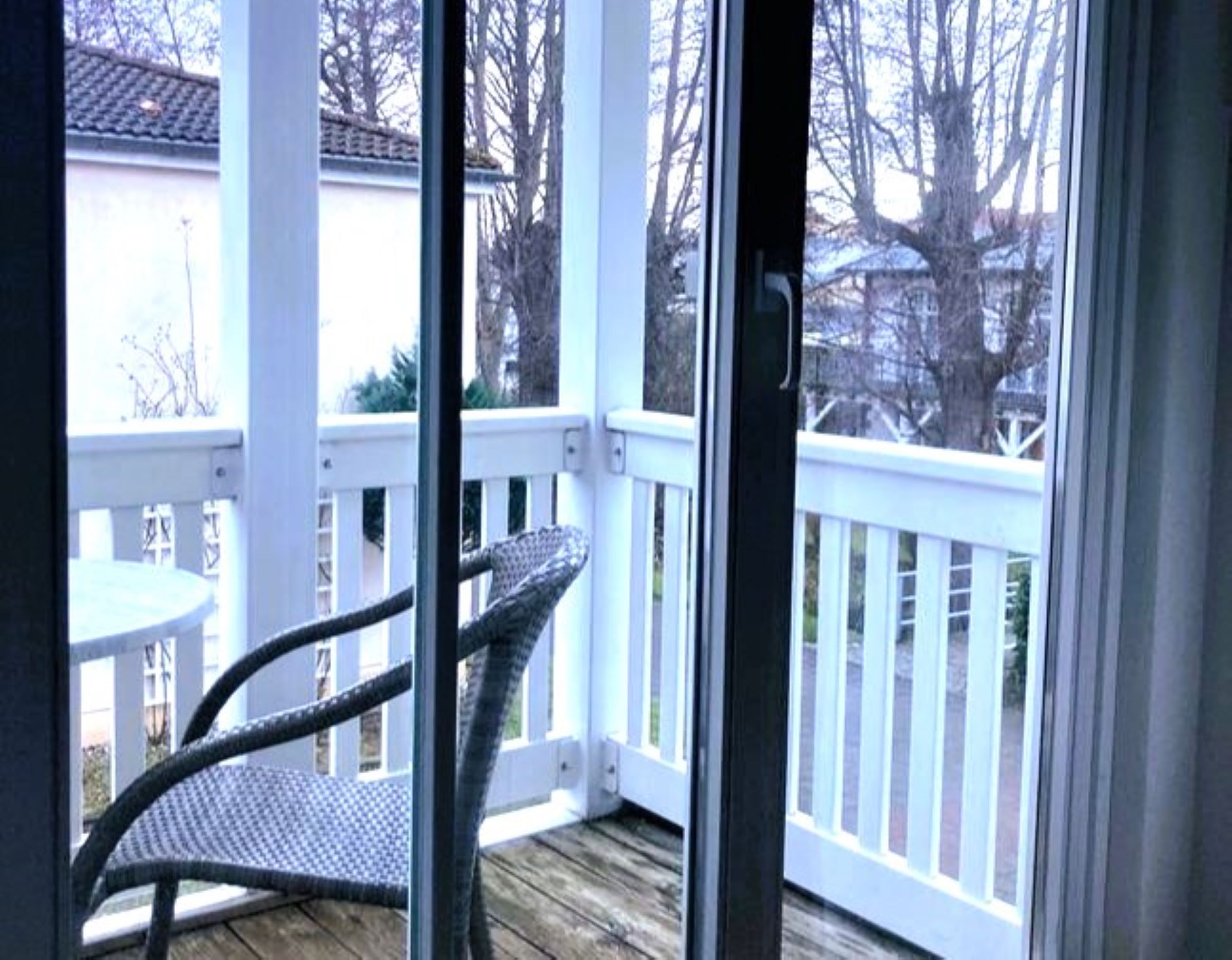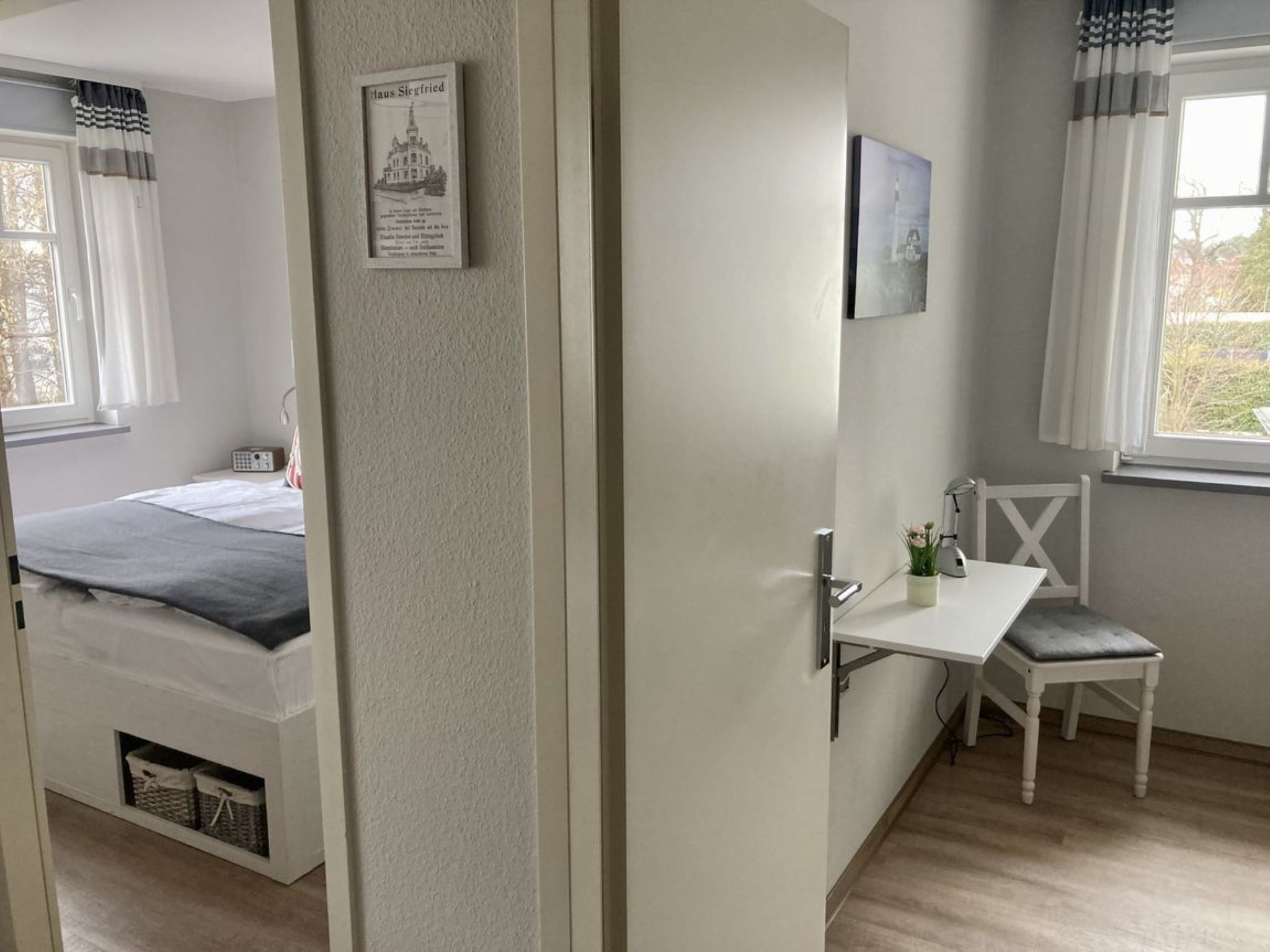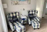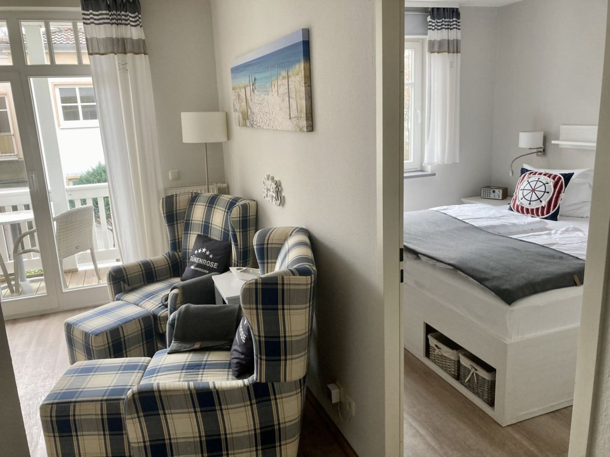Nur 150 m vom Strand wohnen Sie in einer 3-Raum-Ferienwohnung. Die 34 qm große Wohnung liegt in der ersten Etage. Das Wohnzimmer ist mit einer Couch, Couchtisch, 2 Sessel, Anrichte, mit Kabel-TV (Flachbildschirm), Radio, Essbereich (Tisch und Stühle) und Küchenzeile ausgestattet. Der Balkon mit Tisch und Stühle geht zur Südseite. Im Schlafzimmer stehen ein Doppelbett 2 Nachtschränke, FlachbildTV und ein Kleiderschrank. Im Gästezimmer stehen ein Bett, Nachtschrank und ein kleiner Kleiderschrank. Im Flur ist eine Garderobe. Die Küchenzeile wurde ausgestattet mit Mikrowelle, Kühlschrank, Kaffeemaschine, Zwei-Platten-Kochfeld, Toaster und Wasserkocher. Das Bad mit Dusche und WC komplettiert die Wohnung.