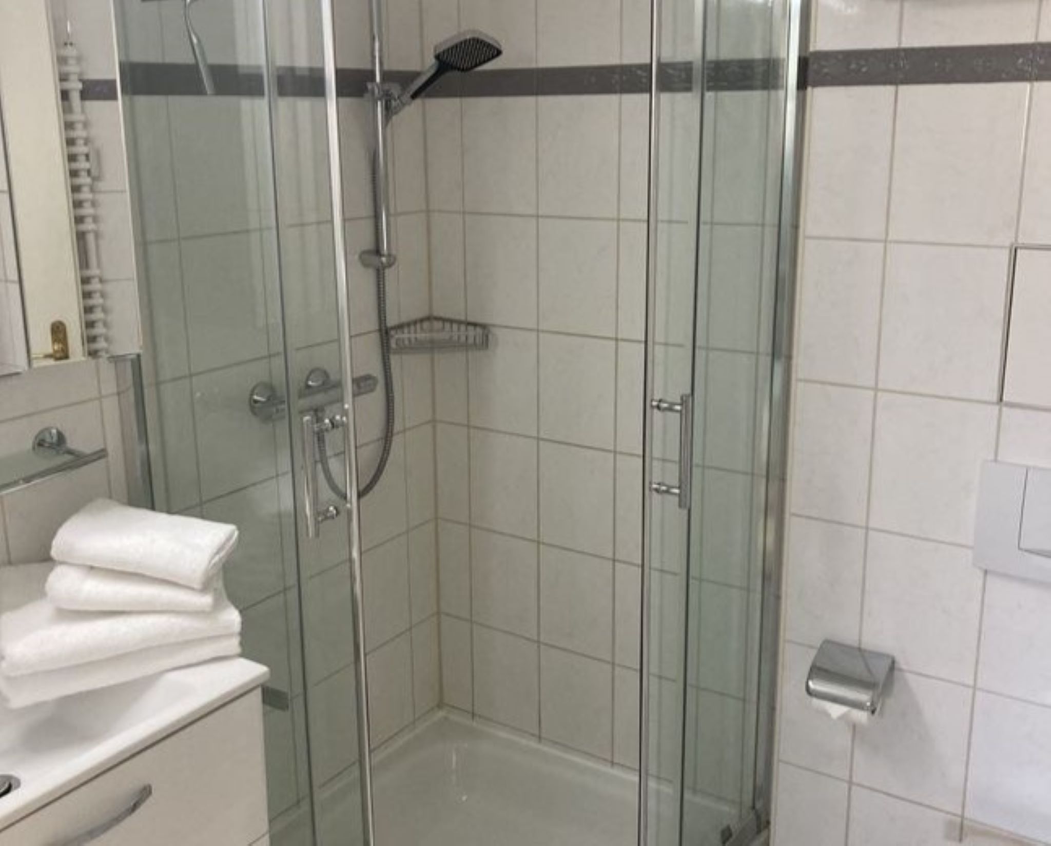 Ein Bad mit Dusche, Waschbecken und WC komplettieren den guten Gesamteindruck der Wohnung.
