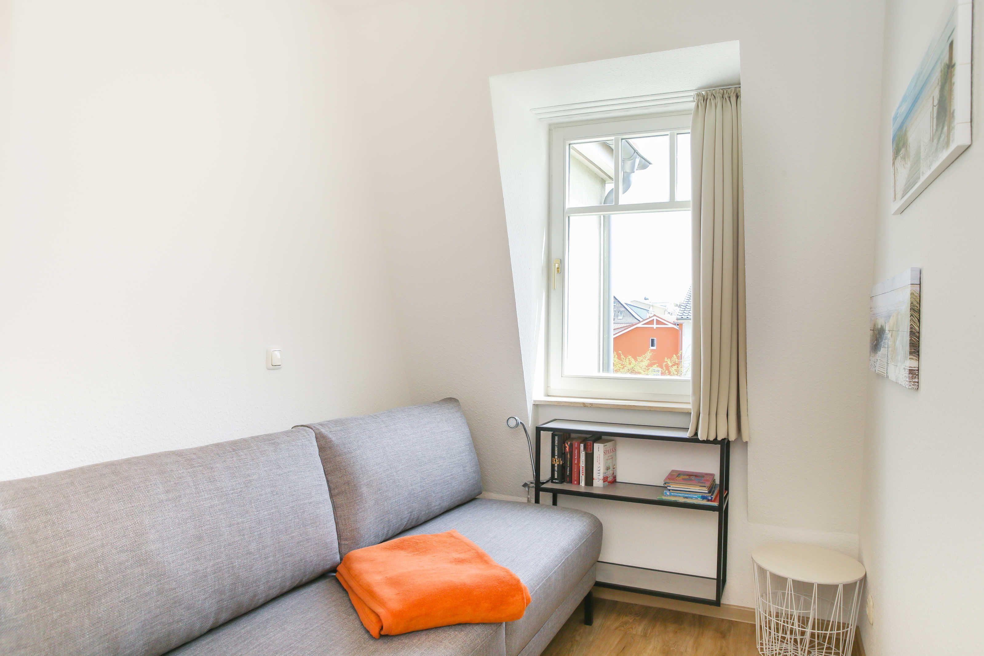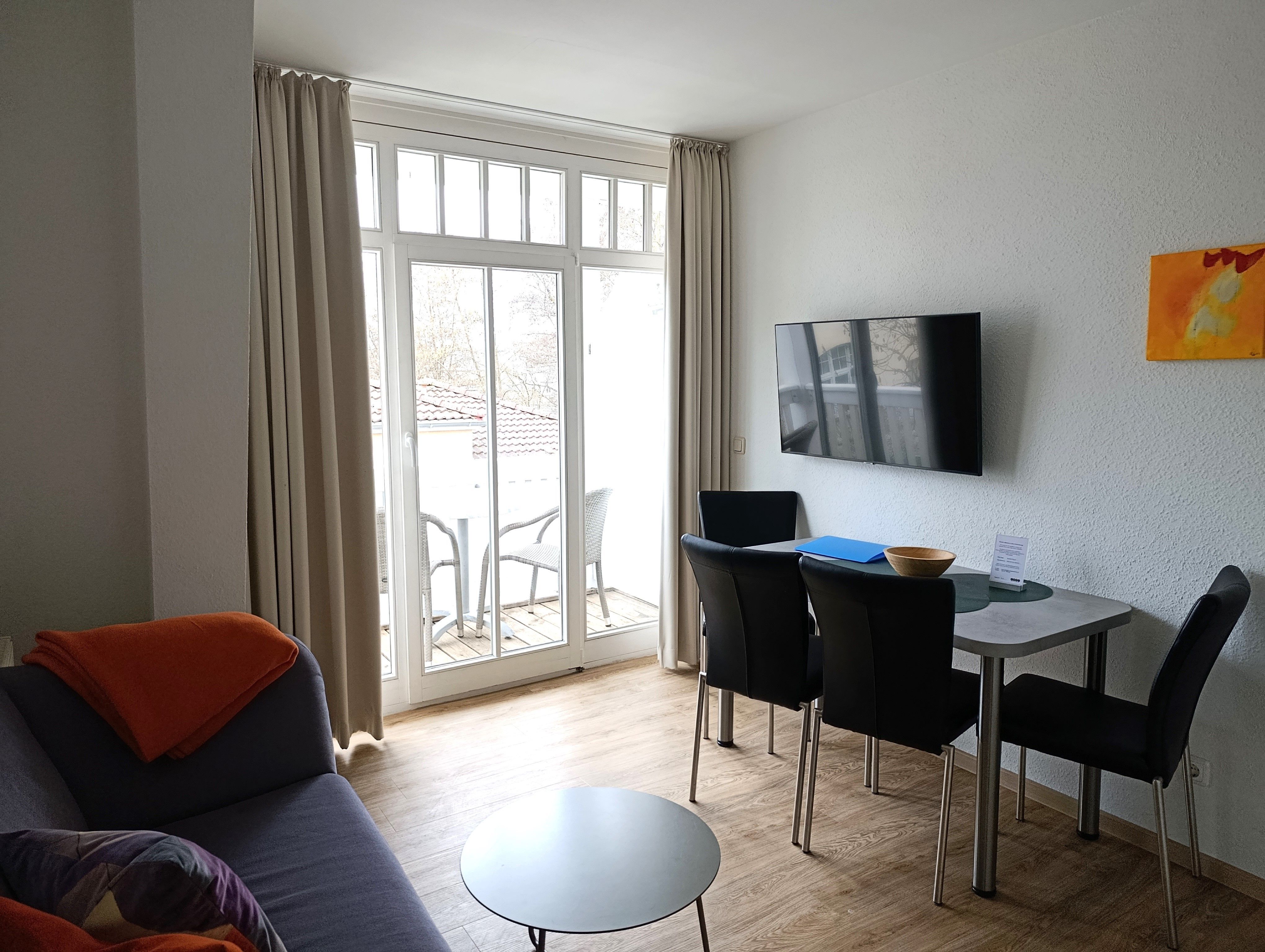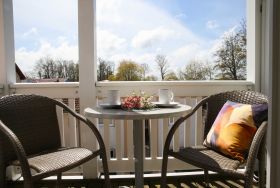 Nur 150 m vom Strand wohnen Sie in einer 3-Raum-Ferienwohnung. Die 31 qm große Wohnung liegt in der Zweiten Etage. Das Wohnzimmer ist mit einer Couch, Couchtisch, Anrichte, mit Kabel-TV (Flachbildschirm), Radio, Essbereich (Tisch und Stühle) und Küchenzeile ausgestattet. Der Balkon mit Tisch und Stühle geht zur Südtseite. Im Schlafzimmer stehen ein Doppelbett und eine kleine Anrichte. Im Gästezimmer stehen ein Schlafcouch, Nachtschrank und ein kleiner Kleiderschrank. Die Küchenzeile wurde ausgestattet mit Mikrowelle, Kühlschrank, Kaffeemaschine, Zwei-Platten-Kochfeld, Toaster und Wasserkocher. Das Bad mit Dusche und WC komplettiert die Wohnung.