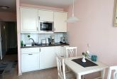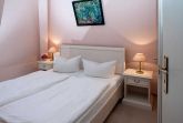 Die funktional gestaltete Ferienwohnung in der 2. Etage hat einen offenen Wohnbereich mit Küchenzeile und Essbereich, ein Schlafzimmer mit Doppelbett, Nachttische, TV und Kleiderschrank, ein Gästezimmer mit Bett (Bett mit Ausziehfunktion), Nachttisch und Kleiderschrank. Einen Balkon zur Südseite. Die funktionale Küchenzeile ist mit 2-Platten-Ceranfeld, Kühlschrank mit Gefrierfach, Mikrowelle, Kaffeemaschine, Wasserkocher, Toaster und div. Geschirr ausgestattet. Ein Bad mit Dusche, Waschbecken und WC komplettieren den guten Gesamteindruck der Wohnung.